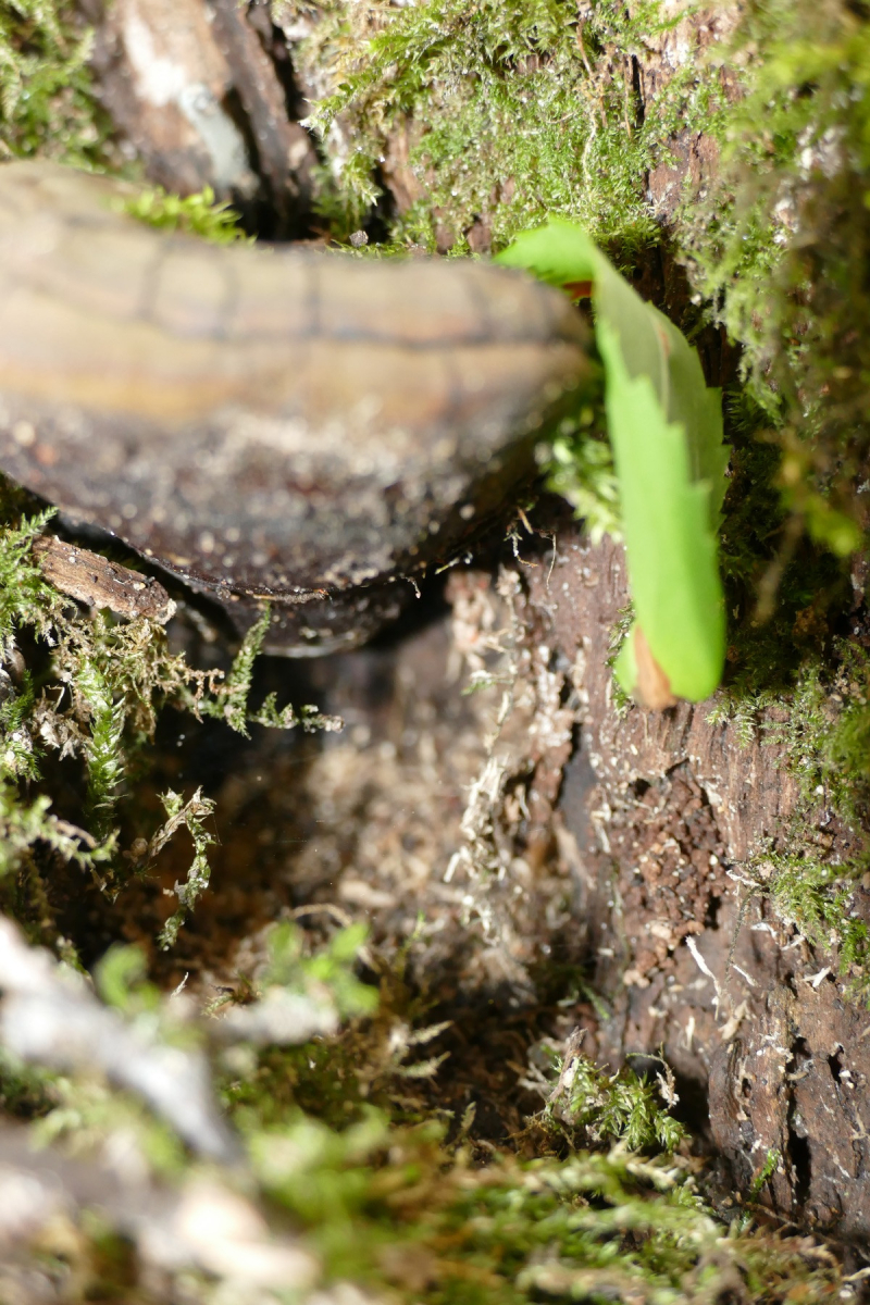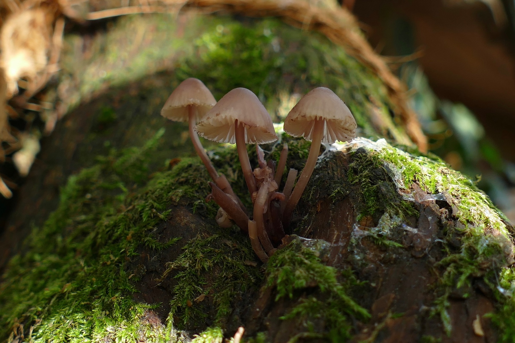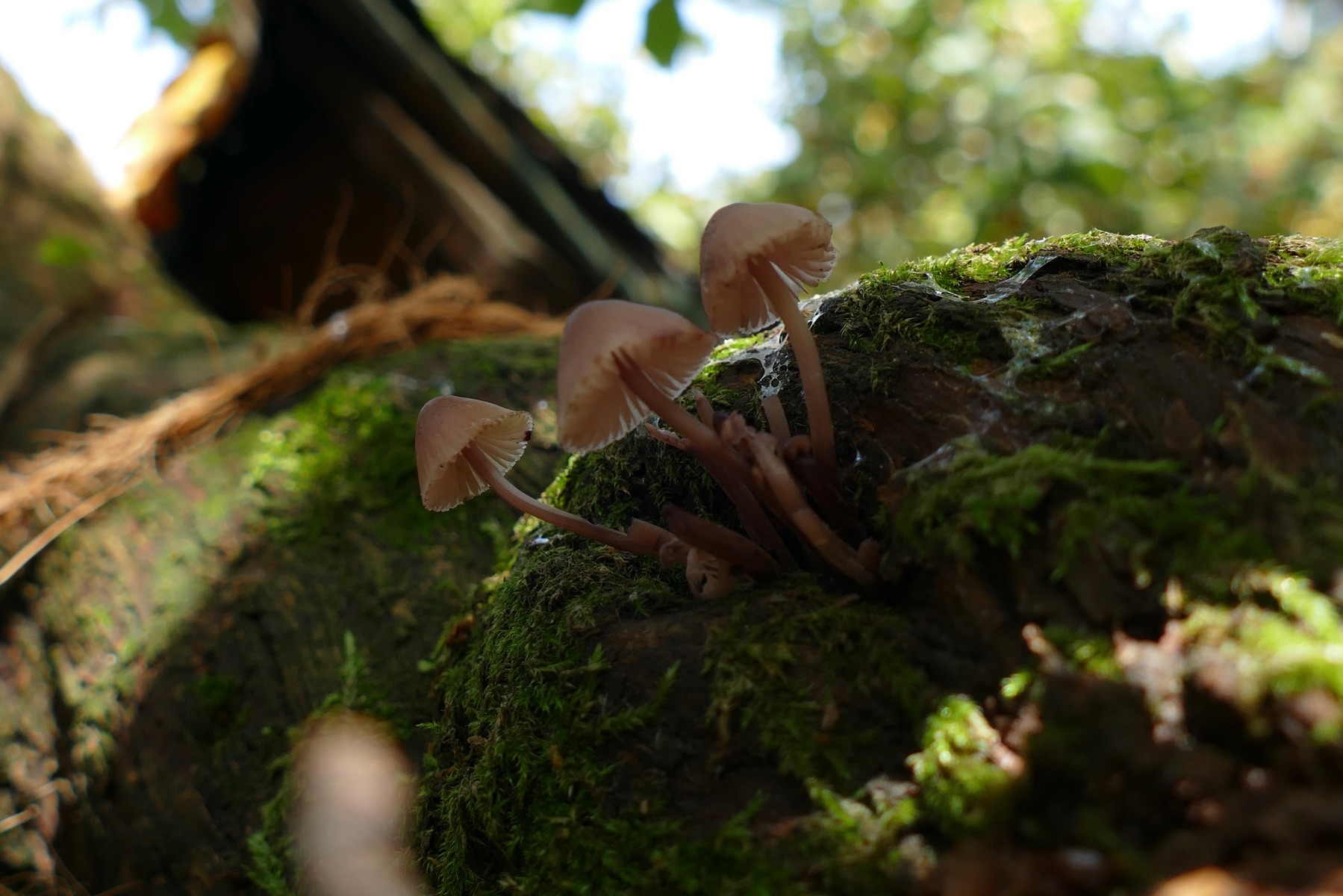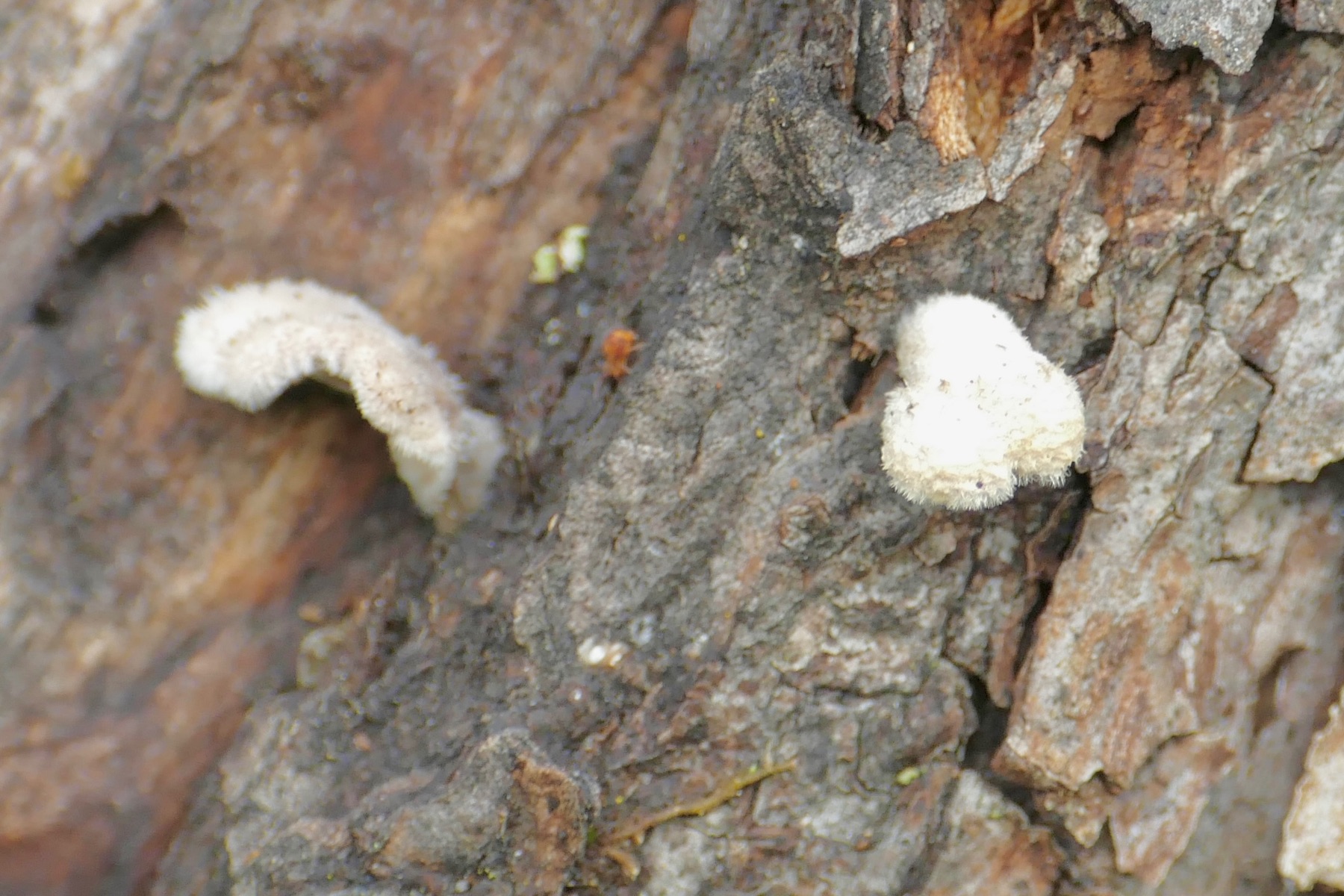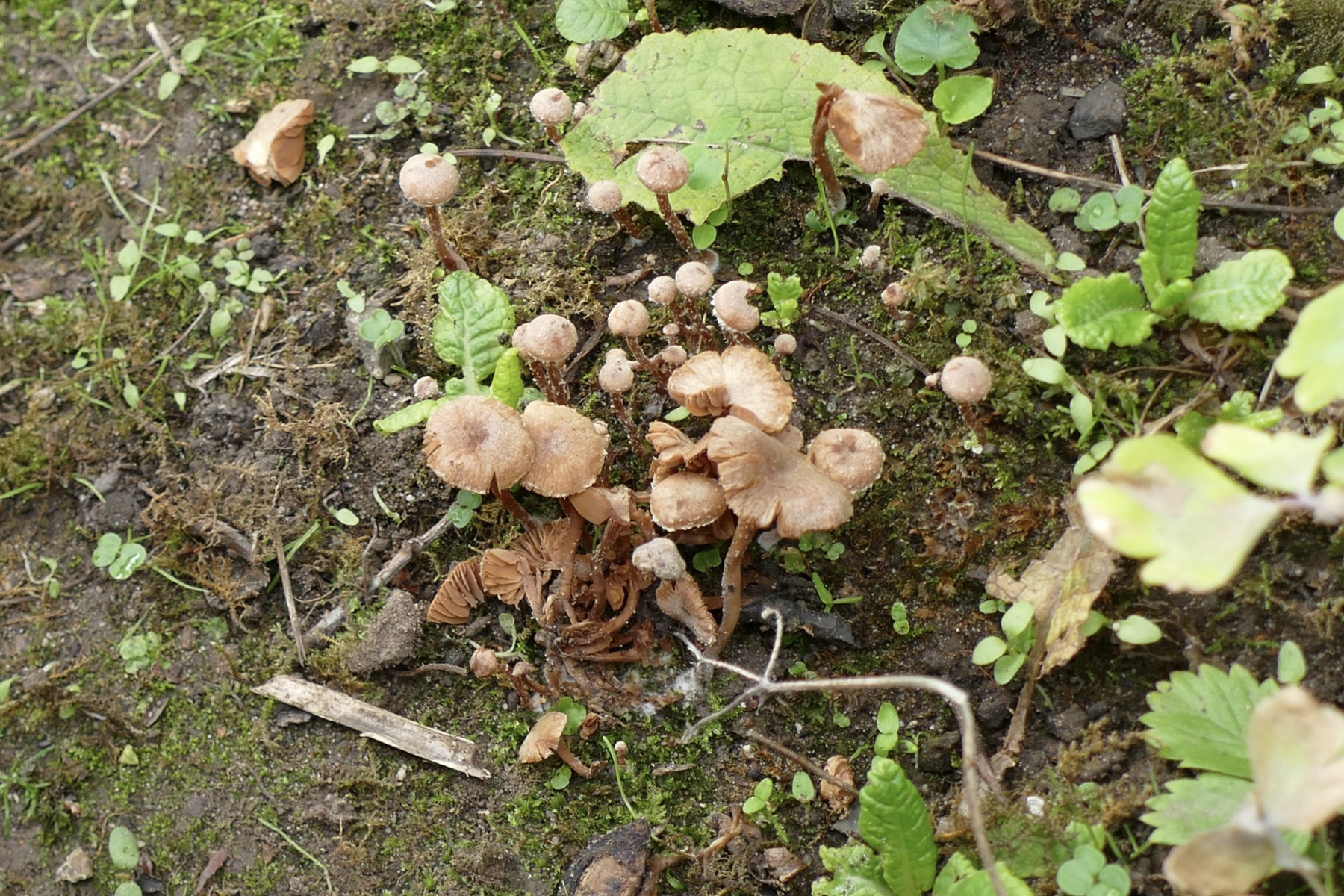 Zunächst die bräunlichen Pilze: Sie wachsen am Totholz und sind 1 cm im Durchmesser oder kleiner. (die ersten 3 Bilder)