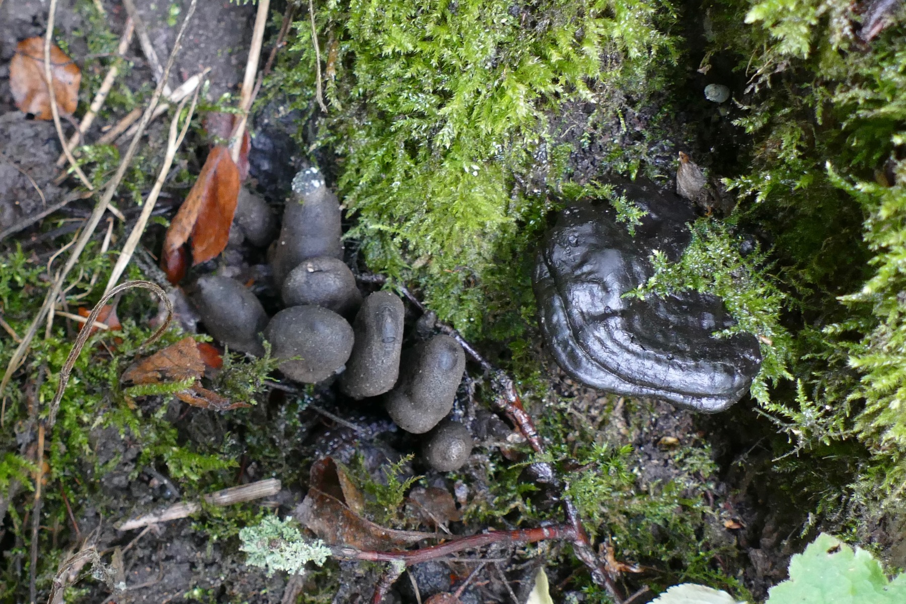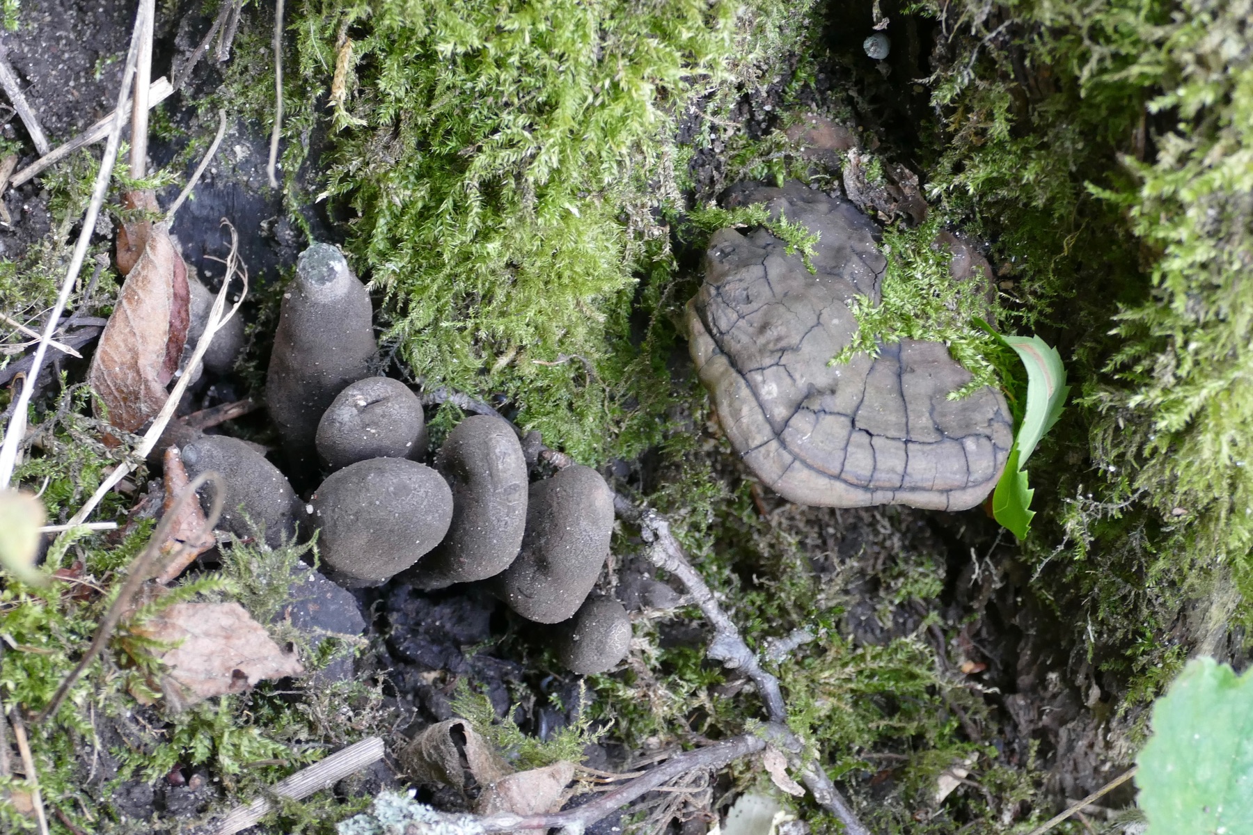 die Pilze mit dem schönen englischen Namen Dead Mens Finger hatte ich bereits letztes Jahr an einer unserer Pappelstümpfen. Dieses Jahr ist nun dieser schwarze Baumpilz daneben erschienen (30.7.), der zunächst glatt-glänzend nach Regen war, am nächsten Tag aber matt gräulich rissig geworden war. Mein Versuch, ein Bild auch von der Unterseite zu schießen scheiterte kläglich, da hätte ich mich in den Matsch werfen müssen