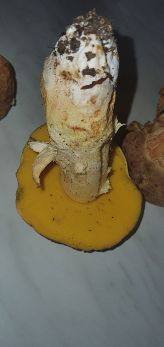 Sporenpulver auf dem Boden und aufgenommen vom Moos auf ein schwarzes Tuch weißlich, vielleicht ganz leicht cremefarben, aber war jetzt auch nicht wirklich vernünftig gemacht vor Ort, nur so ungefähr. R. velenovskyi hätte laut Literatur aber festes Fleisch, davon kann bei denen keine Rede sein, sehr zerbrechlich. und im nassen matschigen Zustand fast zwischen den Fingern zerlaufend, sehr glibbrig und äußerst glasig wirkend, fast wie ein flüssiges Gel.