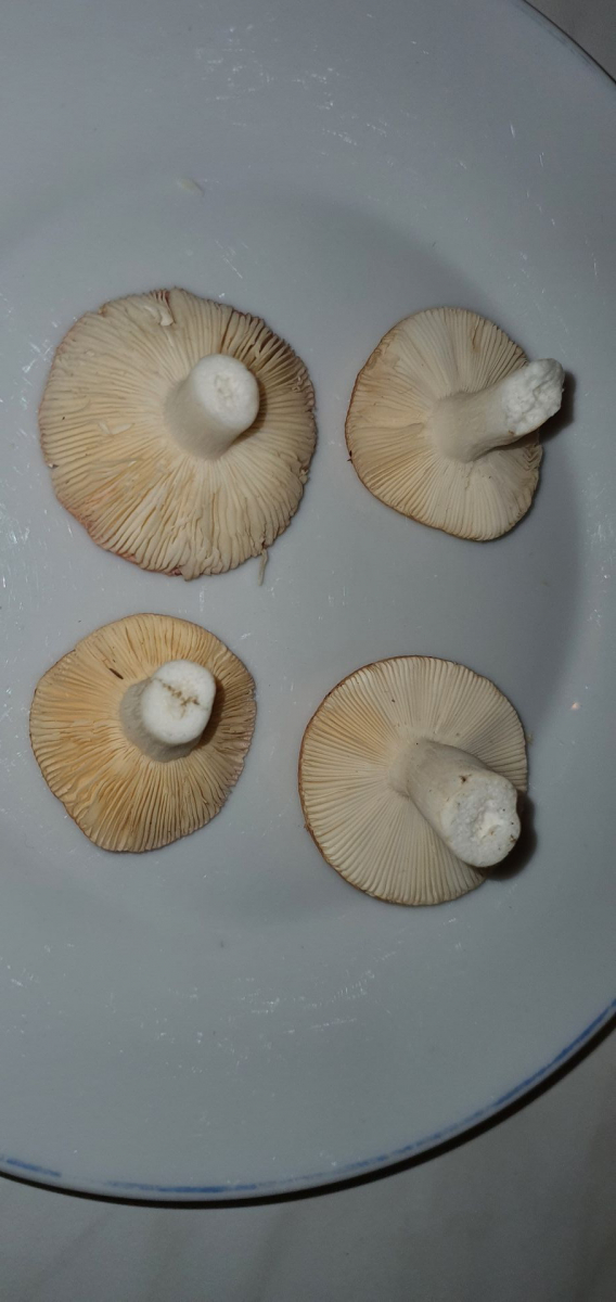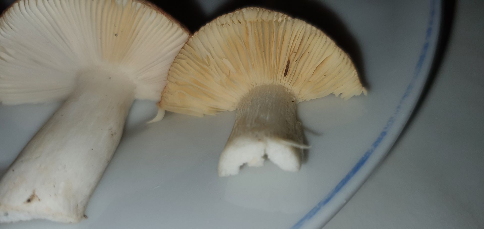 Geschmacksprobe mild. Insgesamt sehr filigran und sehr zerbrechlich, nicht allzu hartes Fleisch, Lamellen erst weich wirkend, dann dennoch stark splitternd. Stiel weißlich, sehr empfindlich/zerbrechlich, innen wattig hohl, auch bei den ganz kleinen schon. Standen nur an einer Stelle, aber recht viele, geschätzt etwa 30 Fruchtkörper, die meisten auch in jungem Zustand madig und hinüber, die 4 auf den Fotos waren noch in Ordnung.
