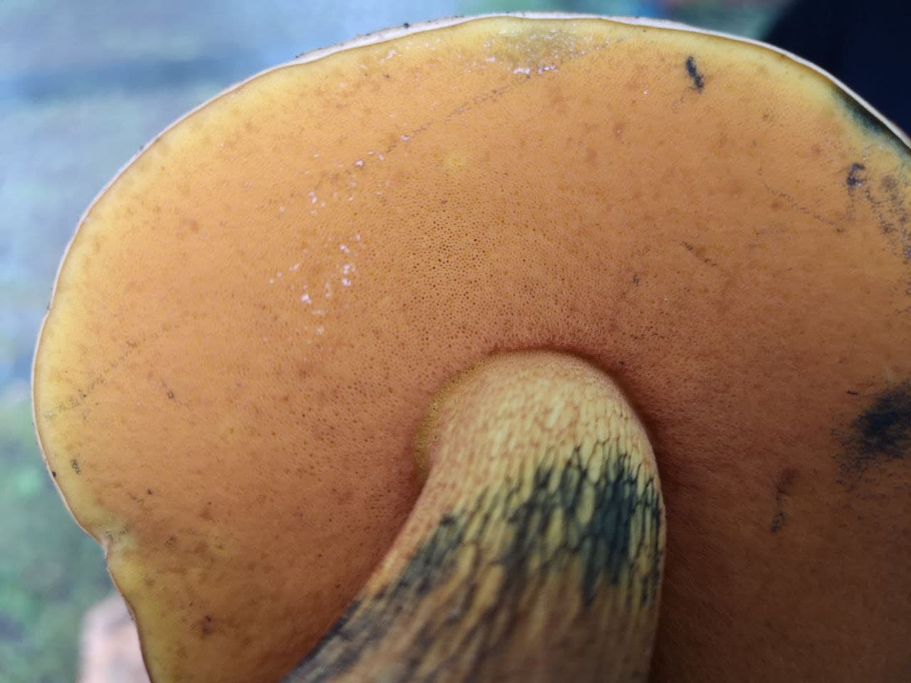 Der Stiel sieht für mich dunkler aus, Die Röhren quillen nicht wie bei dem ersten so unten raus, ich sehe eine rötliche Verfärbung bei Verletzung
