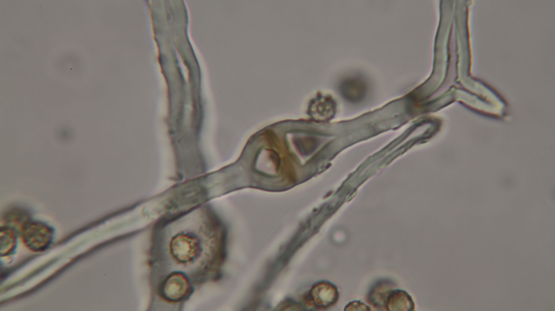 Wenn ich hier zu 10. gehe lande ich bei Tulostoma niveum, was von der Beschreibung her nicht passt "spore-ball" ist größer und das Caplillitum ist an den Septen deutlich verdickt (Bild 4).