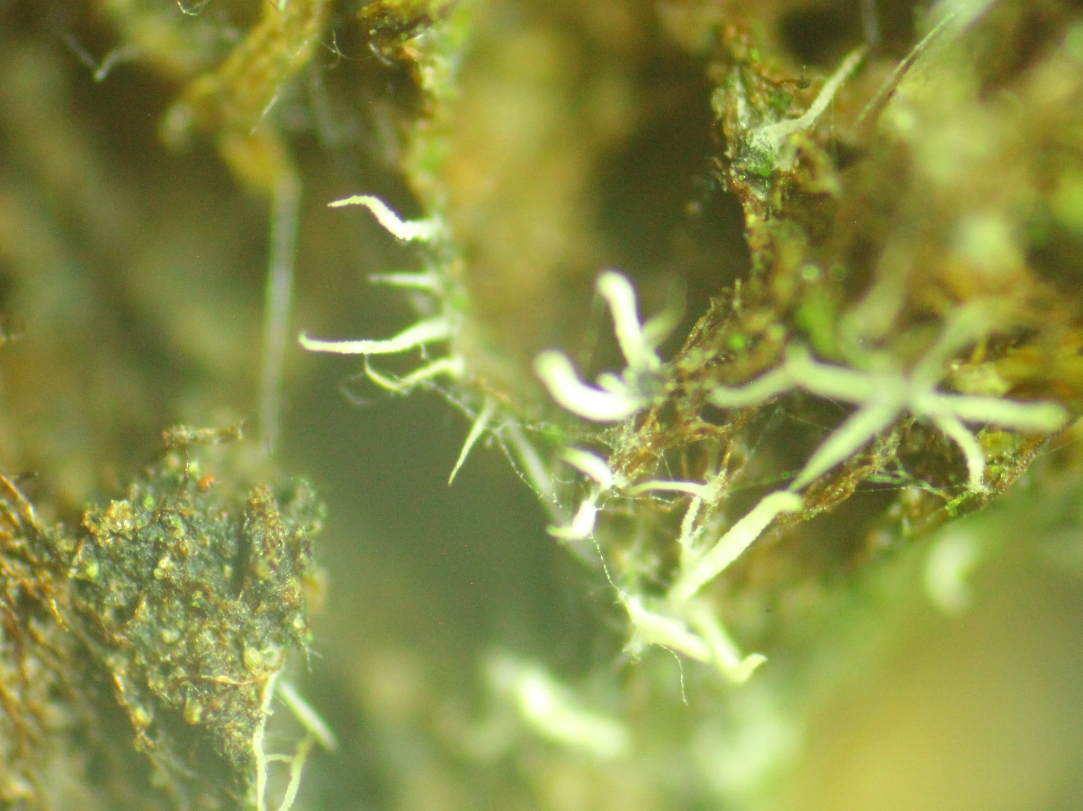 das könnte auch eine Orthotrichum sp. sein, zumal das Moos auf Holunder wuchs, was mit Orthotrichum häufig der Fall ist. Octospora affine kenne ich und ich habe Zuhause auf dem Moos keine Becher mehr gefunden, aber ich schaue nochmal nach. Mir geht es aber eher um diese weißen Auswüchse. Ist das überhaupt etwas mykologisches? Zum Moos wird es wohl nicht gehören.