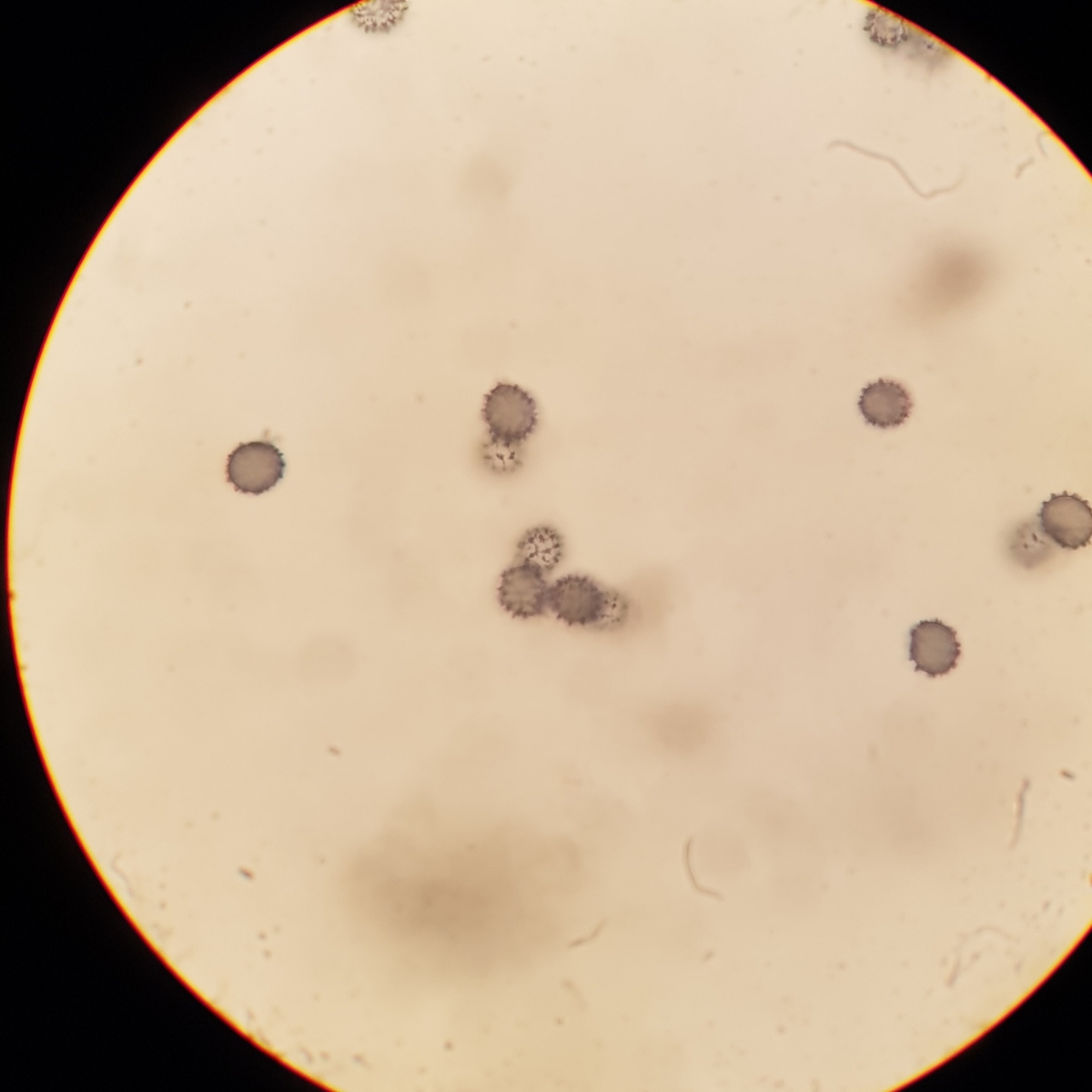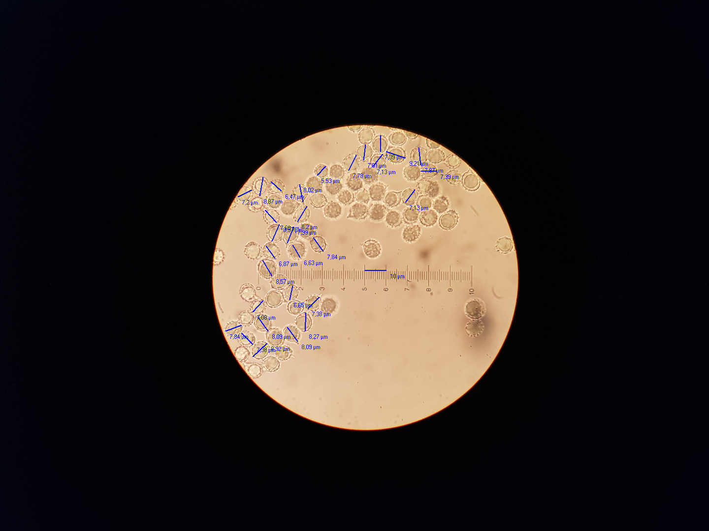 Die Sporen haben sehr niedrige Ornamente. Ich weiß nicht, wie ich sowas kleines genau messen soll, würde sie aber definitiv nicht größer als 0.5µm schätzen. Die Ornamente sind zum größten Teil isoliert, ich konnte aber wenige gratige Verbindungen auf manchen Sporen feststellen.