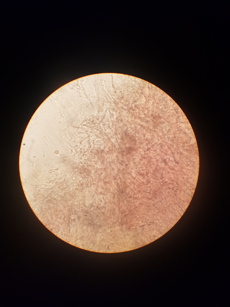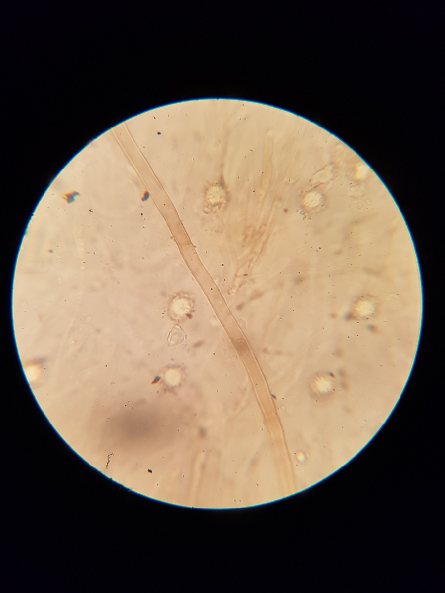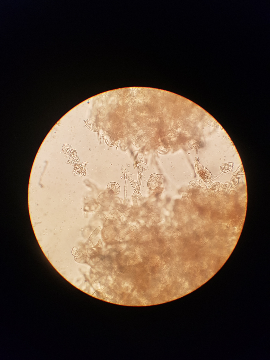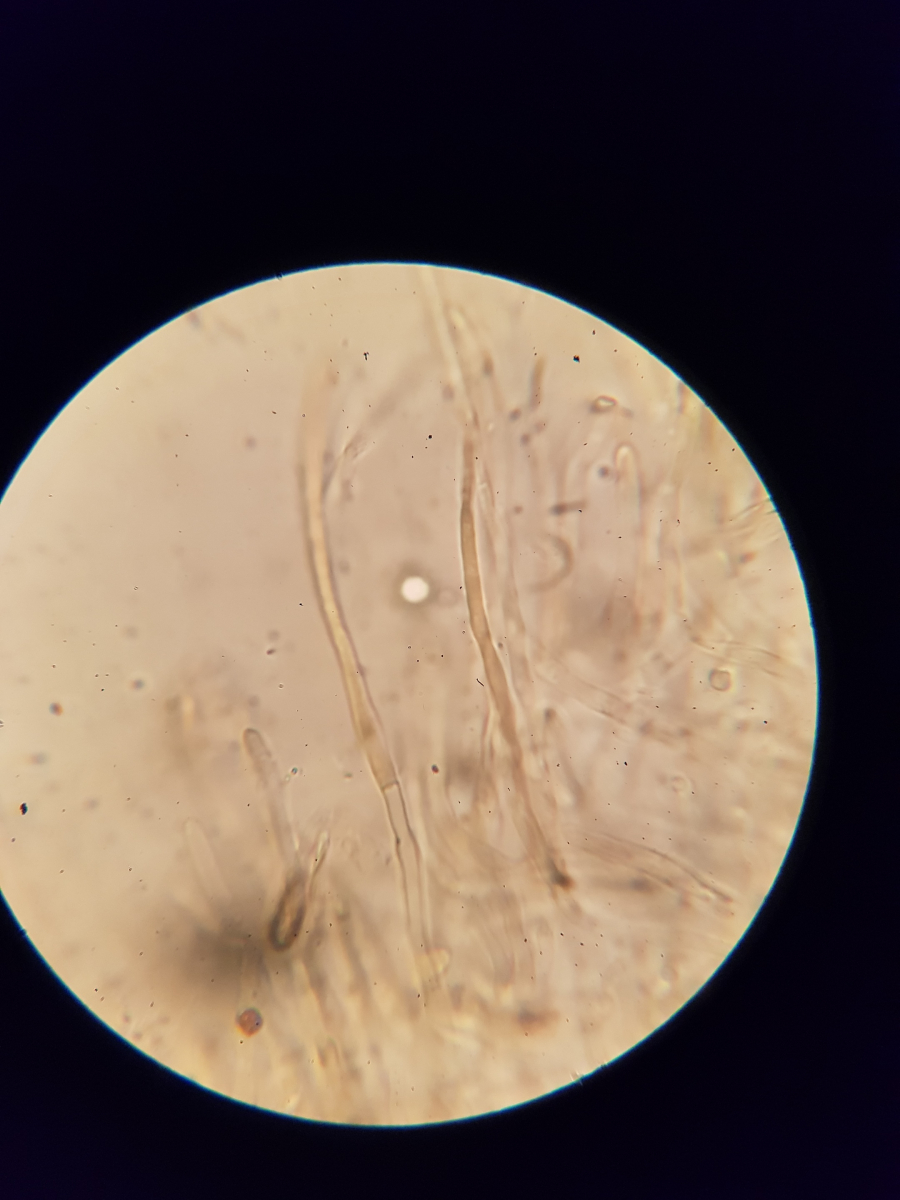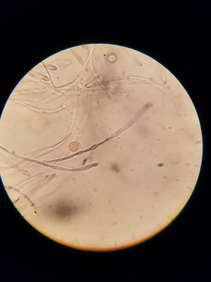 11. und zum Schluss habe ich noch sowas in der Huthaut gefunden. Ich bin echt überfragt, da ich vier Strukturen ausmachen würde. Die blasenförmigen, die keulenförmigen, die Pileozystidien? und folgende: