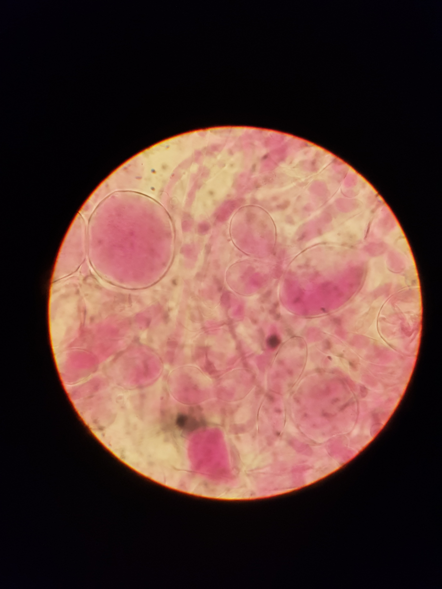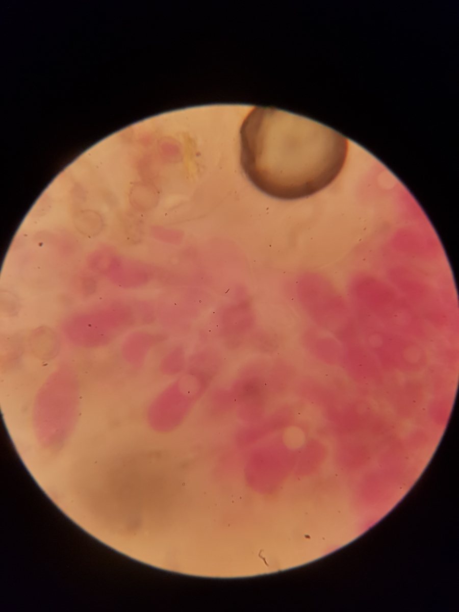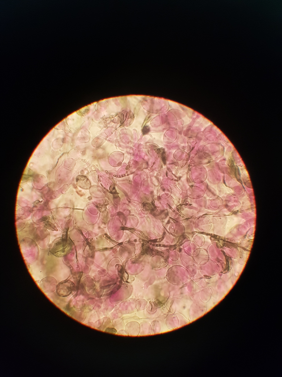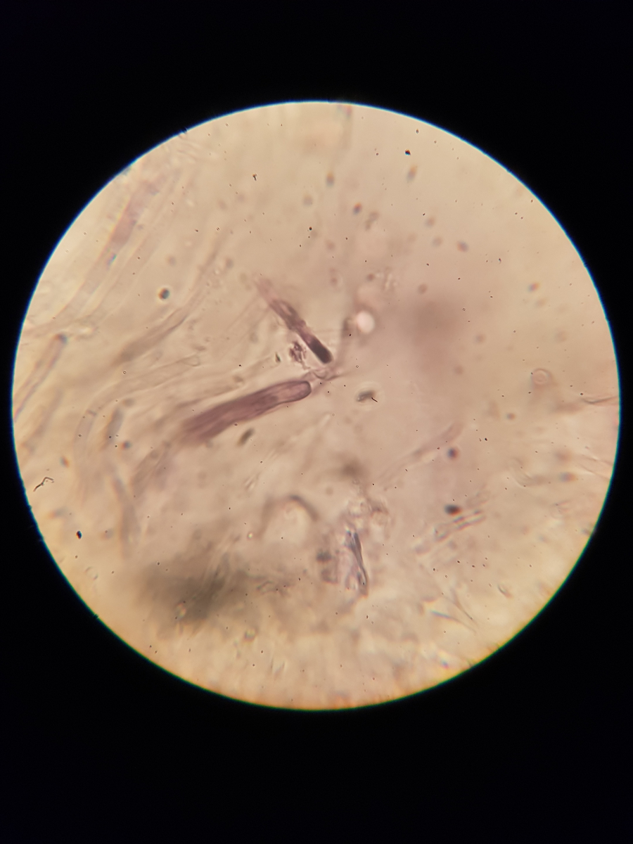 11. und zum Schluss habe ich noch sowas in der Huthaut gefunden. Ich bin echt überfragt, da ich vier Strukturen ausmachen würde. Die blasenförmigen, die keulenförmigen, die Pileozystidien? und folgende: