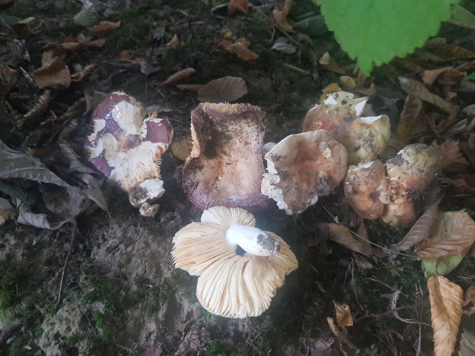 ich habe gestern (15.09.2021) einen Täubling auf dem gegenüberliegenden Spielplatz gefunden. Der ist mir zwar schon länger bekannt, aber er fruktizierte mal wieder. Ich habe einen sehr alten und später mehrere junge Frk mitgenommen. Ich war erst verwirrt, weil sie so unglaublich verschieden aussehen. Aufgefallen ist mir ziemlich schnell ihr Geruch, den ich sicher als Apfelmus/-kompott interpretiert habe. Da die Lamellen sehr dunkel sind, habe ich in mit einer vermuteten Spp-Farbe von mindestens III bei MM geschlüsselt und kam auf R. versatilis. R. carpini könnte es auch sein, aber dagegen spricht der Geruch und fehlendes gilben sowie schwärzen. Die Sporenpulverfarbe wird hoffentlich Klarheit bringen.