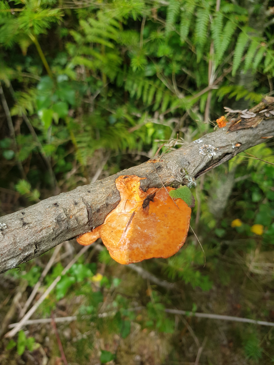 Der nächste Pilz ist wohl eine Zinnoberrote Tramete (Pycnoporus cinnabarinus)