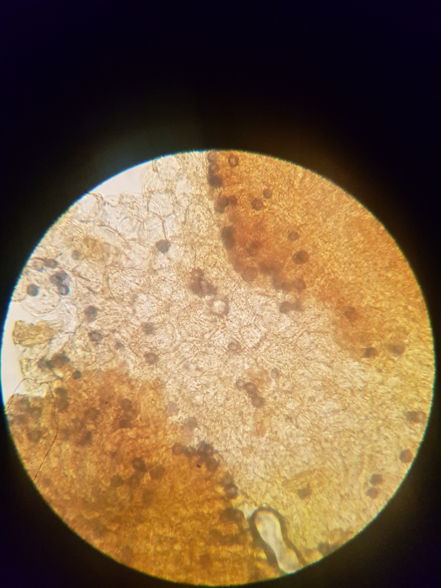 Ich habe es mit Melzers Reagenz eingefärbt und ich denke mal, dass die helle Mitte ein - für Russula typisch - untermischtes Lamellentrama zeigt.