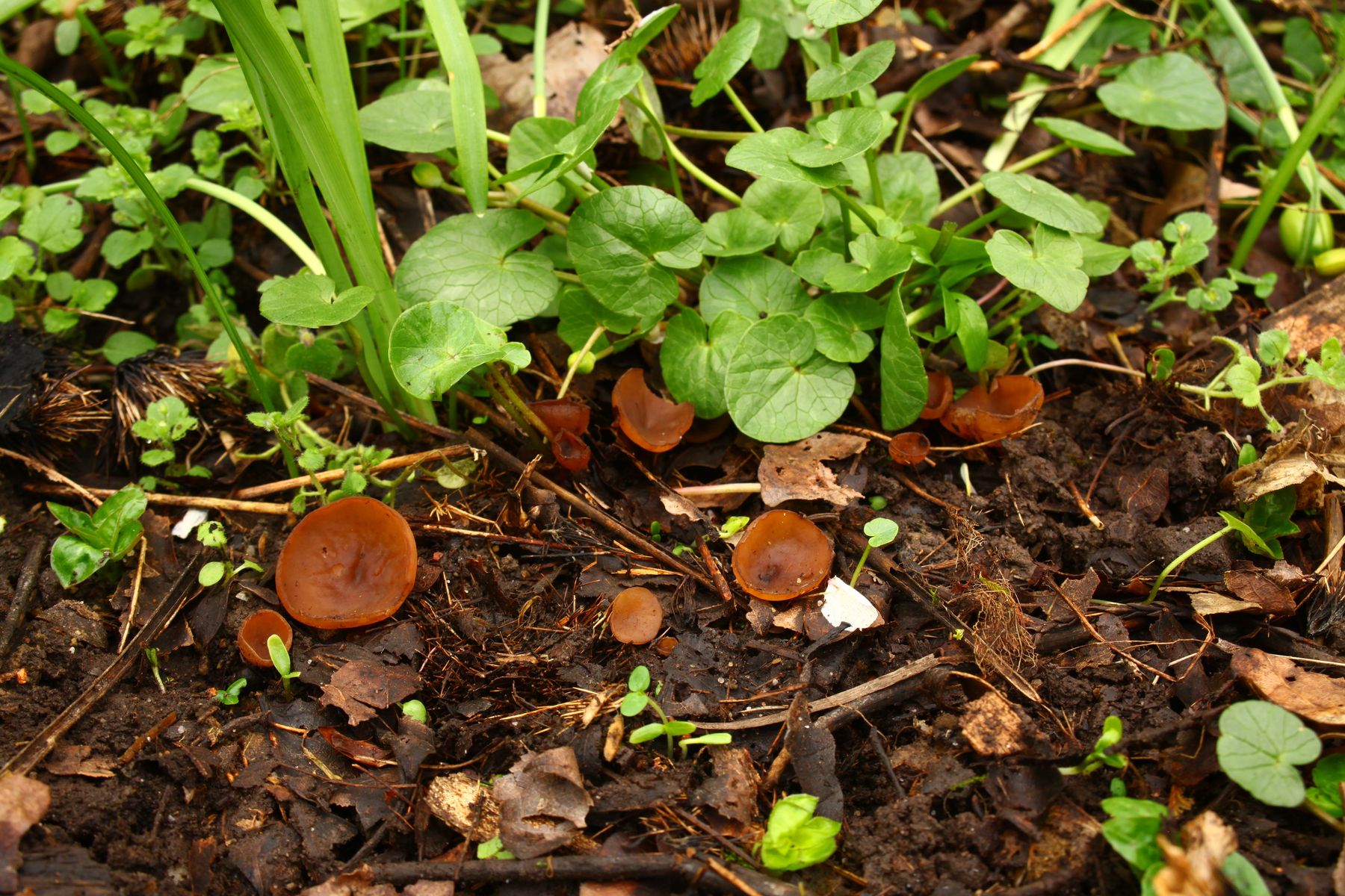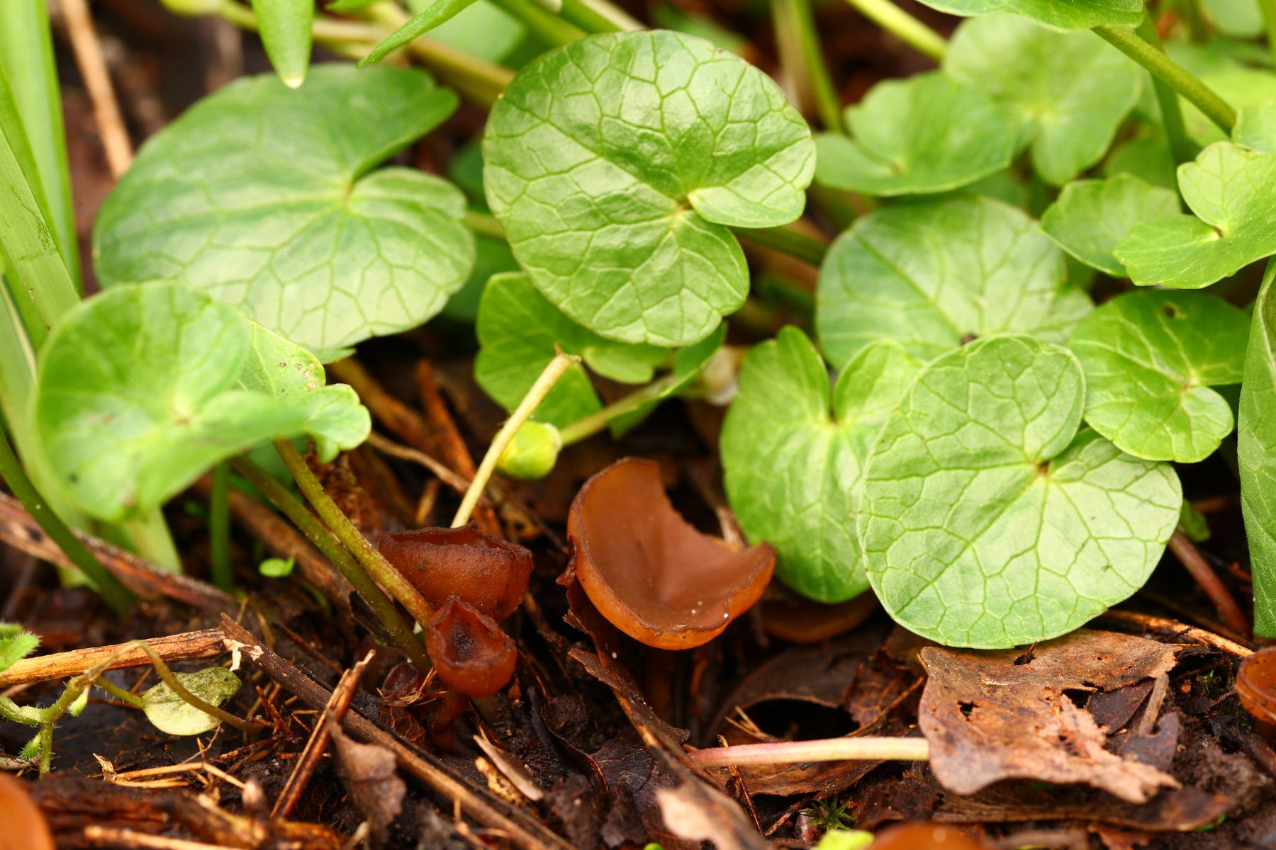 Fruchtkörper: 1 bis 3cm große und braune Becherlinge mit Sklerotium