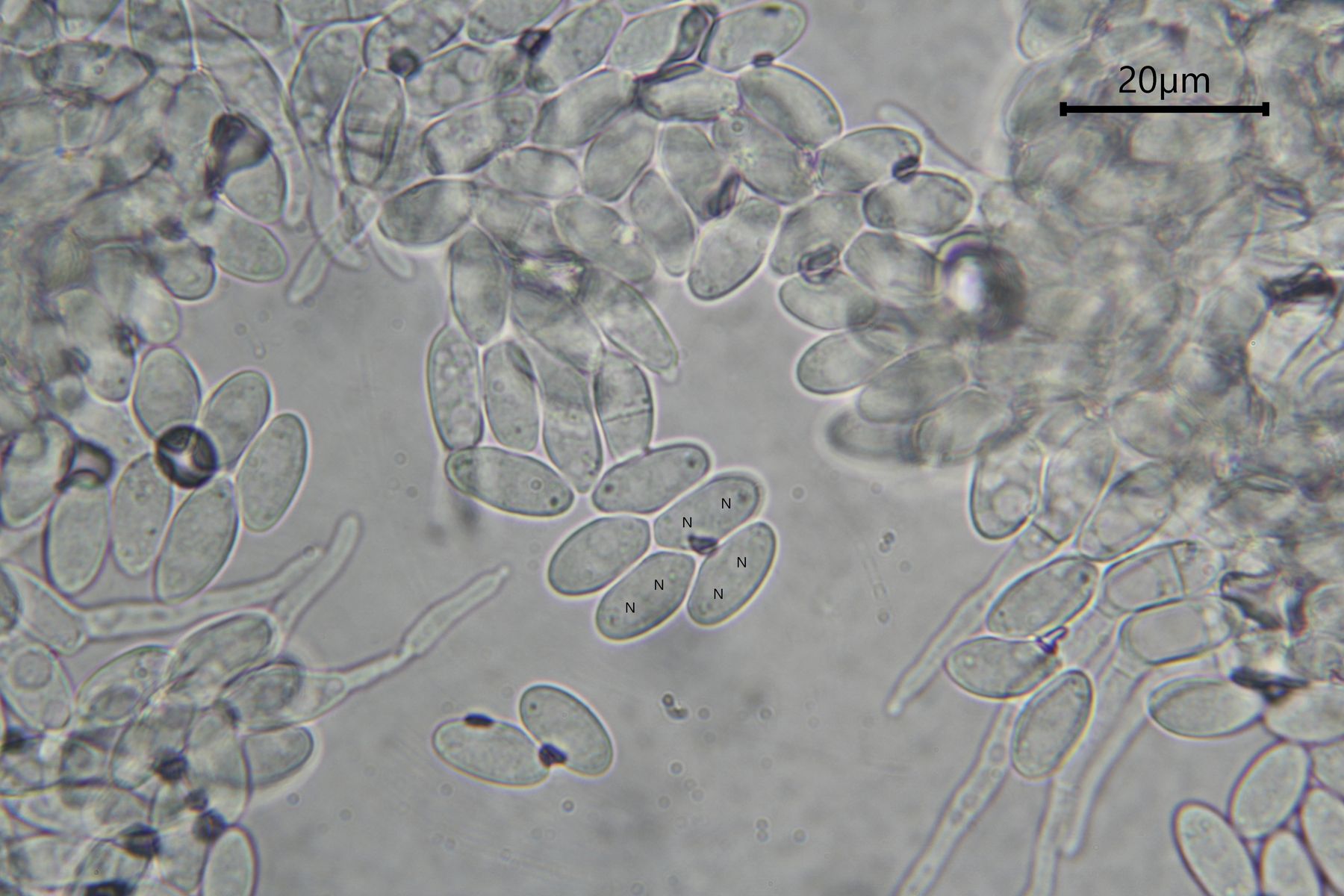 Sporen: (9) 11 - 12 (13)µm lang und 5 - 6µm breit; die Sporen besitzen zwei Zellkerne