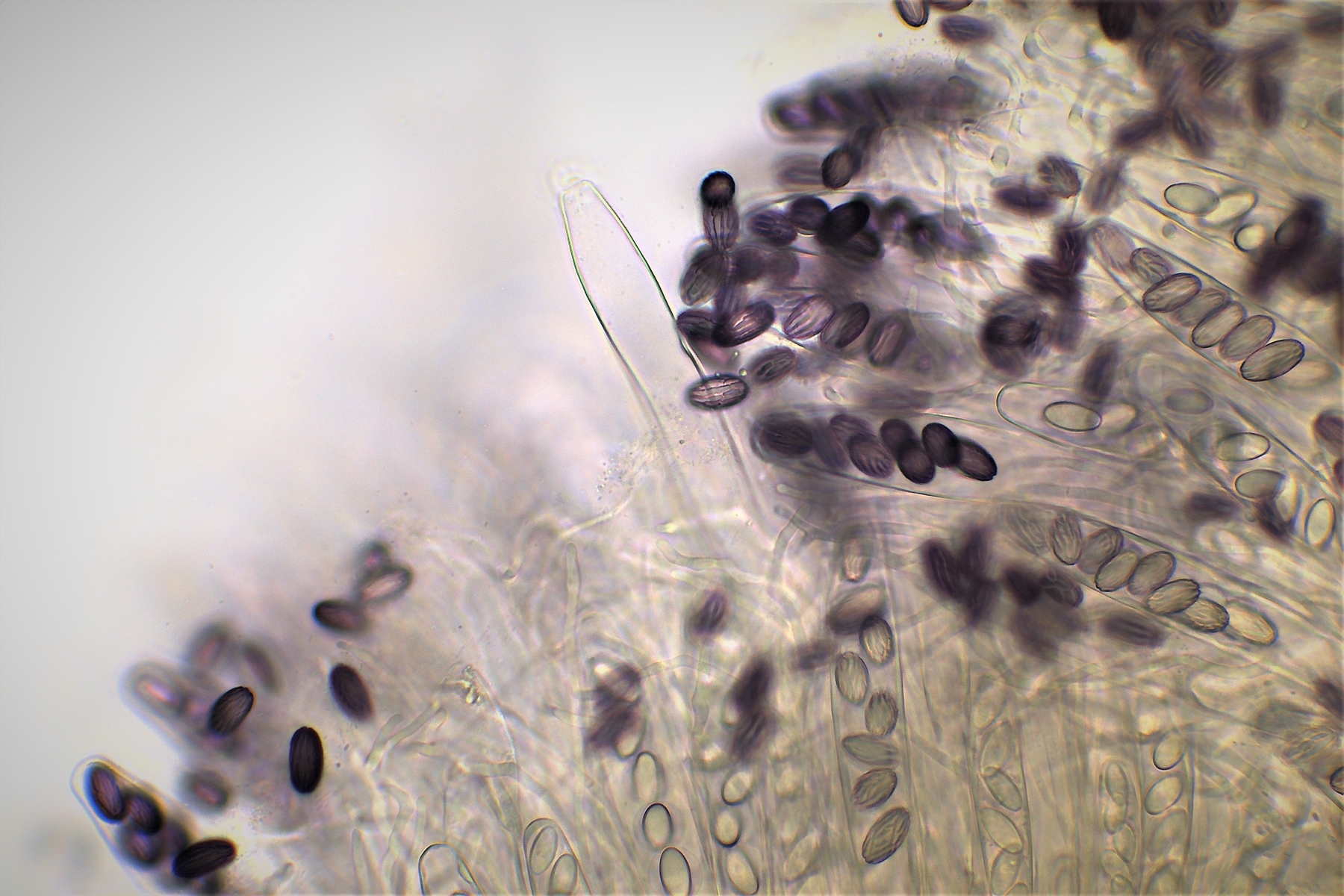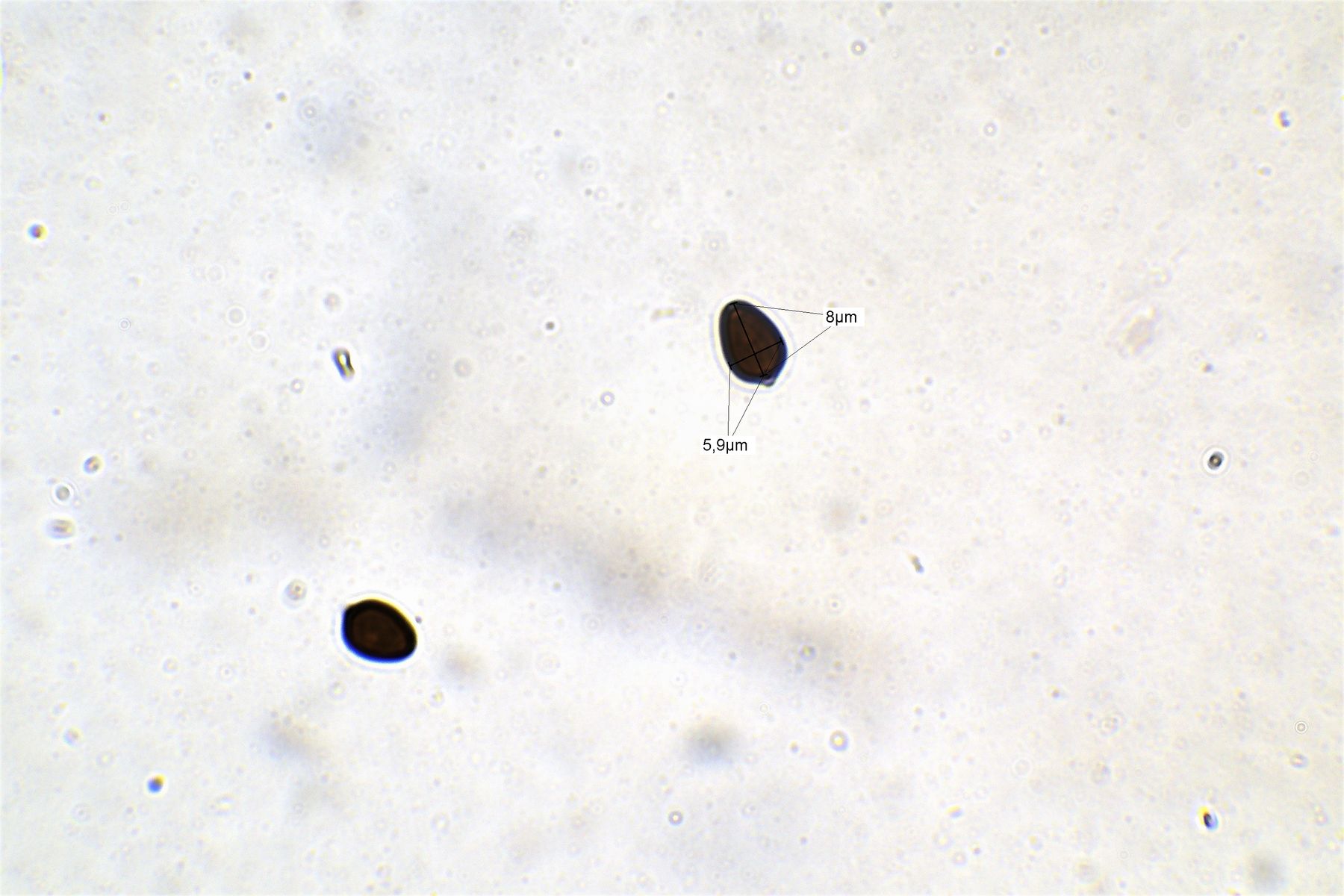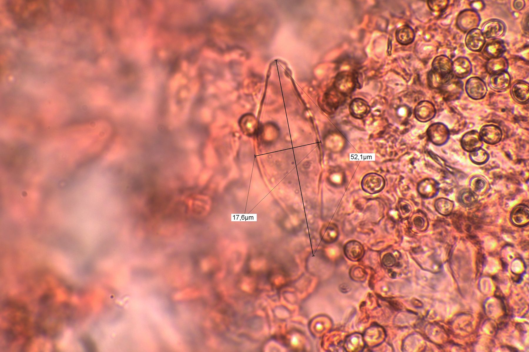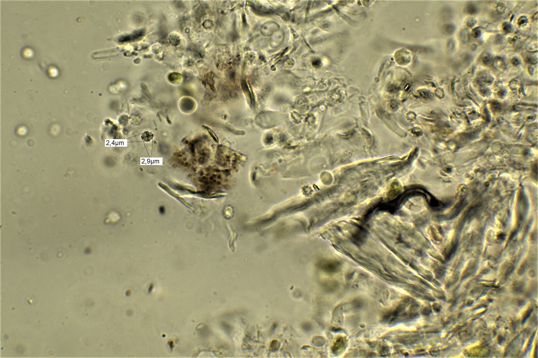 vielen Dank! Die Sporen waren vom dem großen Fruchtkörper. Bis ich Daheim angekommen bin, hatte er in dem Pappkarton ausgesport, und davon habe ich das Präparat gemacht für die Sporen aus zu messen.