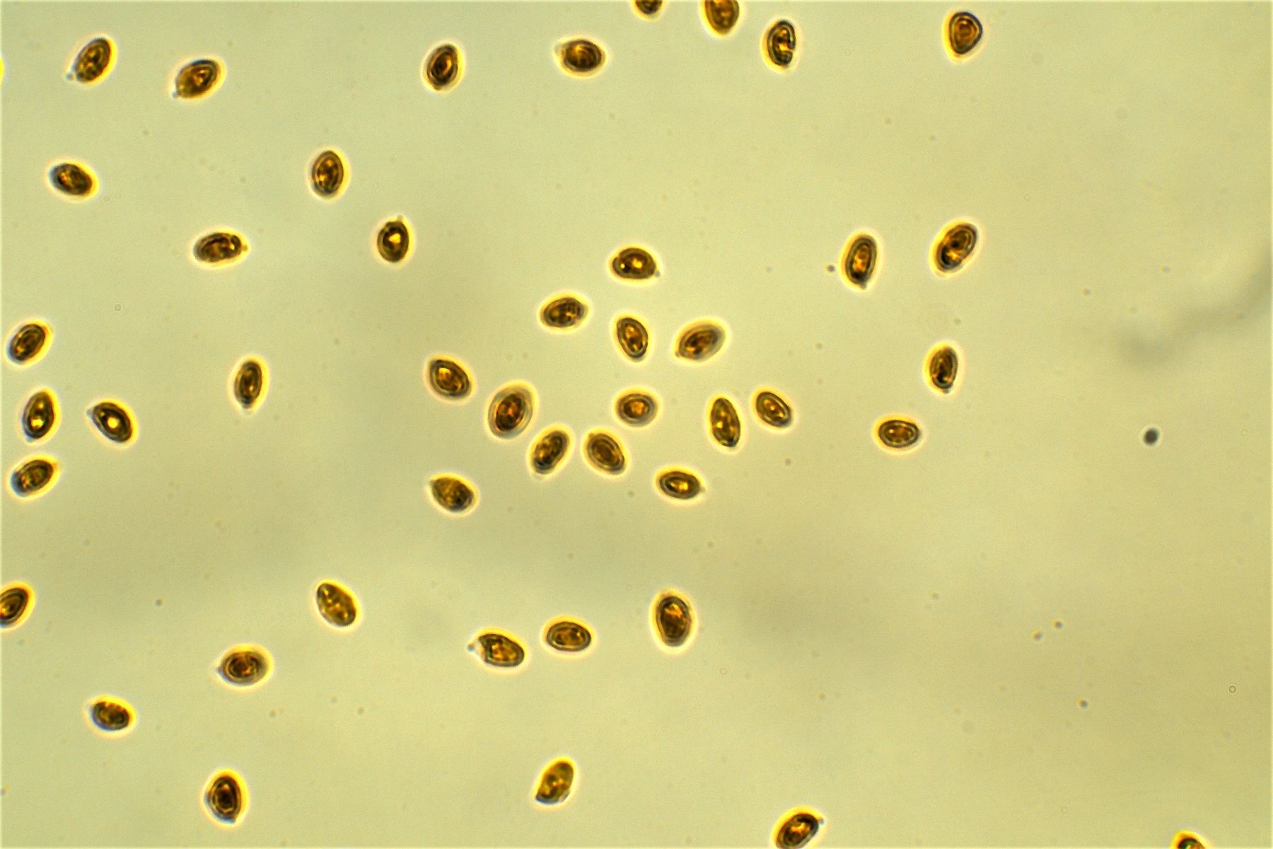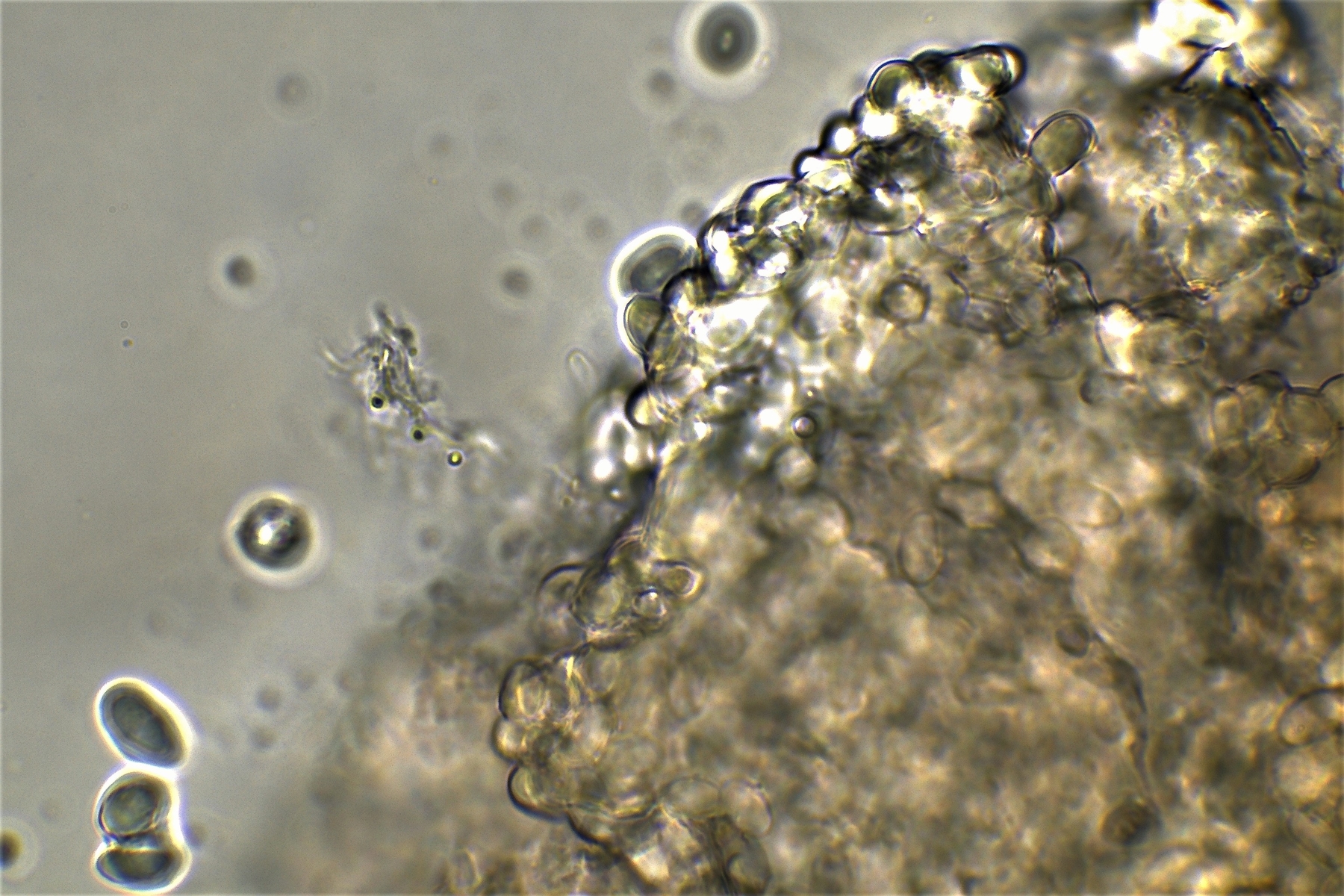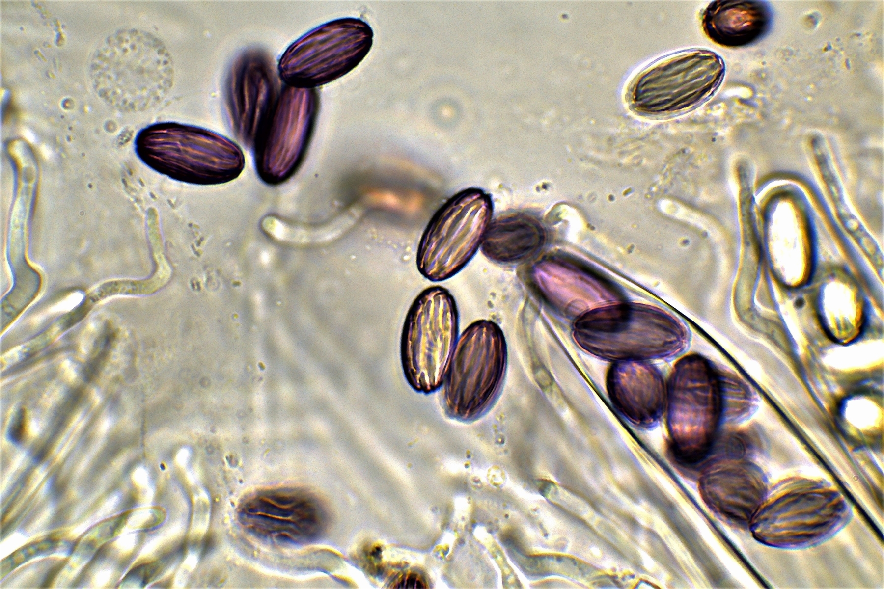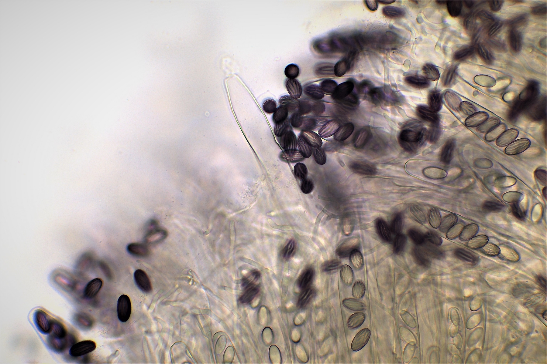 vielen Dank! Die Sporen waren vom dem großen Fruchtkörper. Bis ich Daheim angekommen bin, hatte er in dem Pappkarton ausgesport, und davon habe ich das Präparat gemacht für die Sporen aus zu messen.