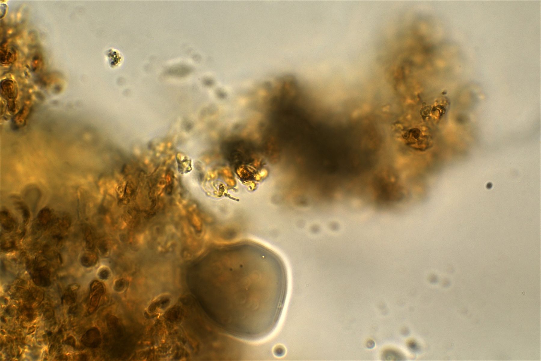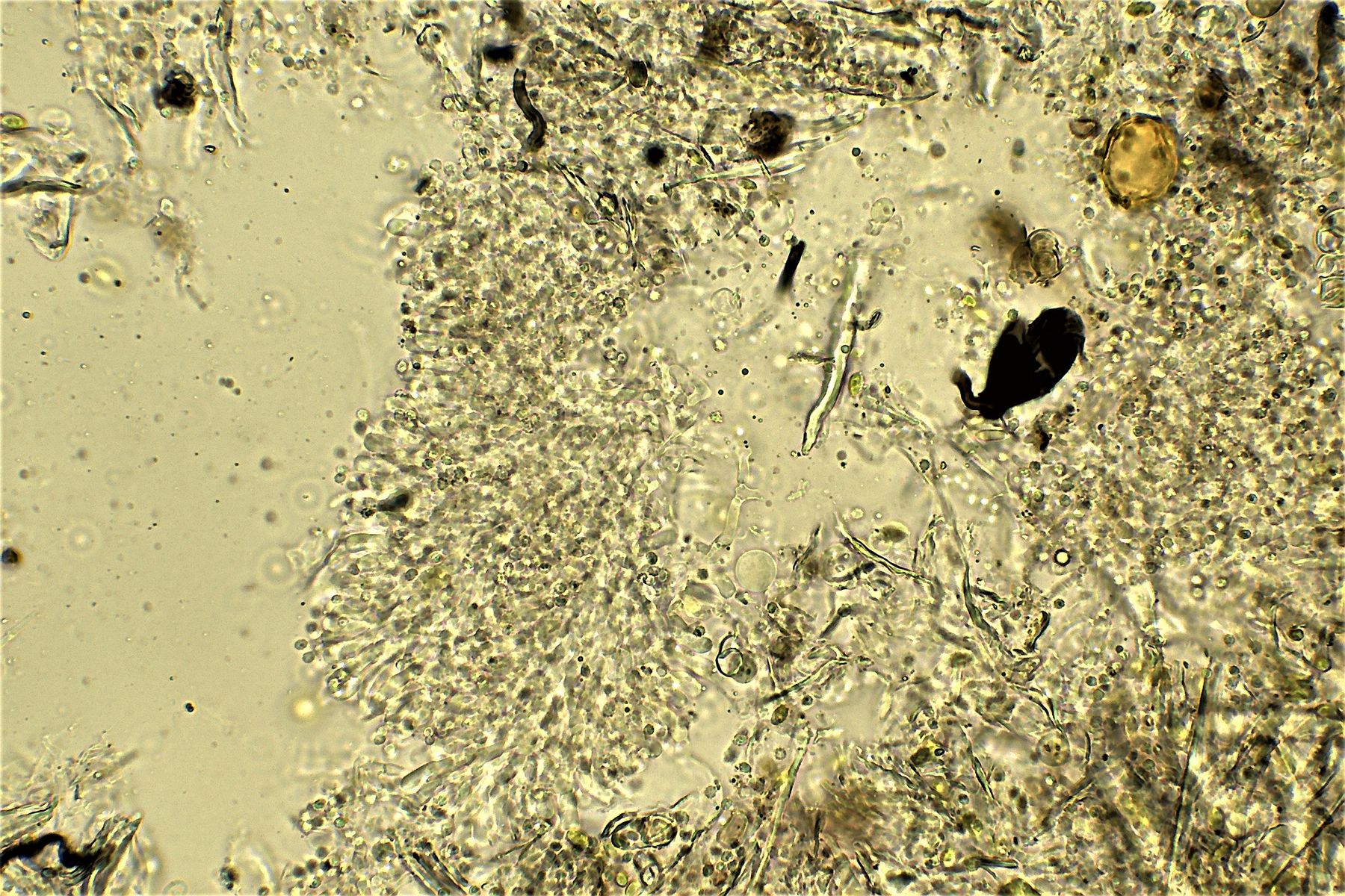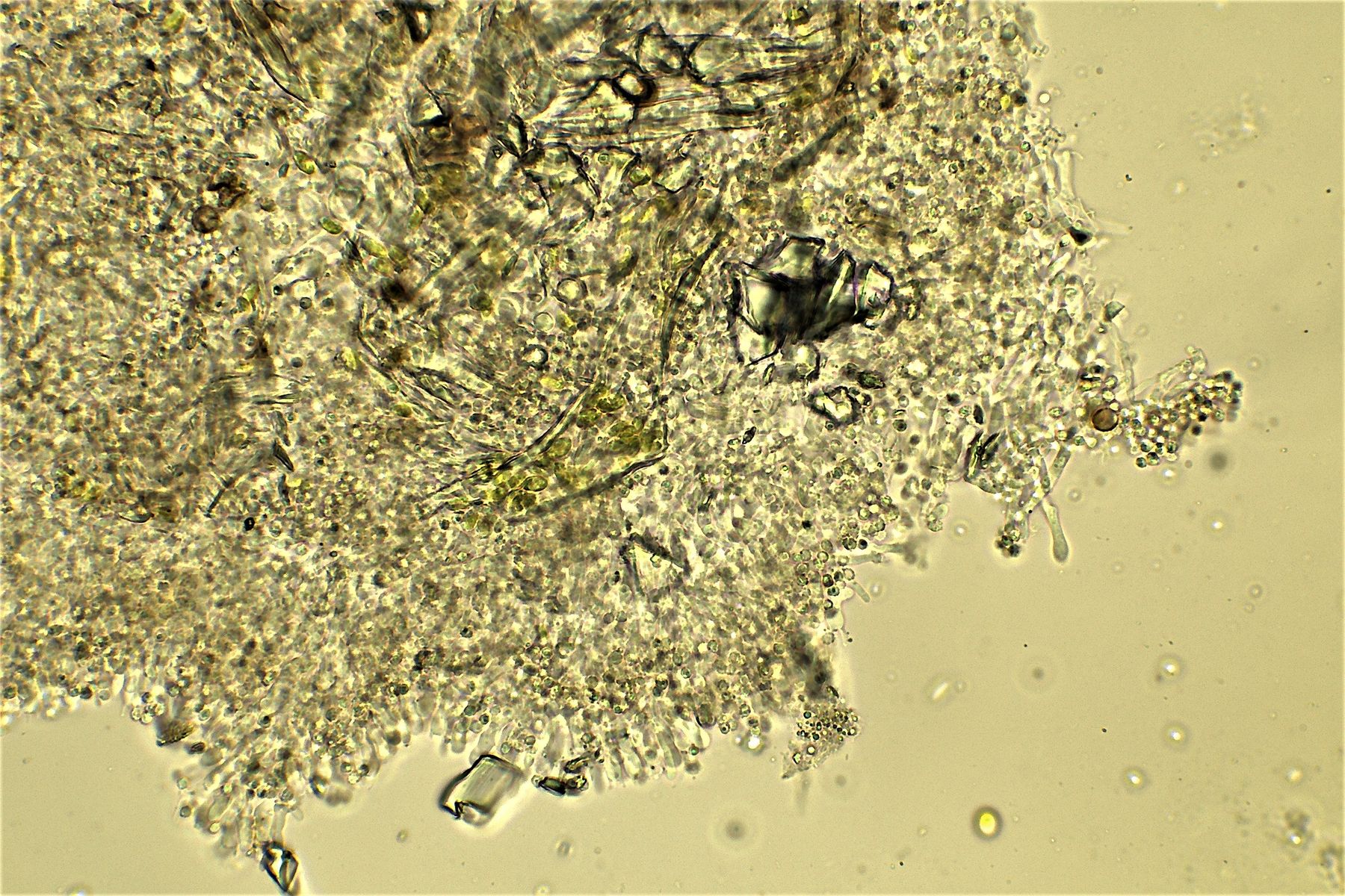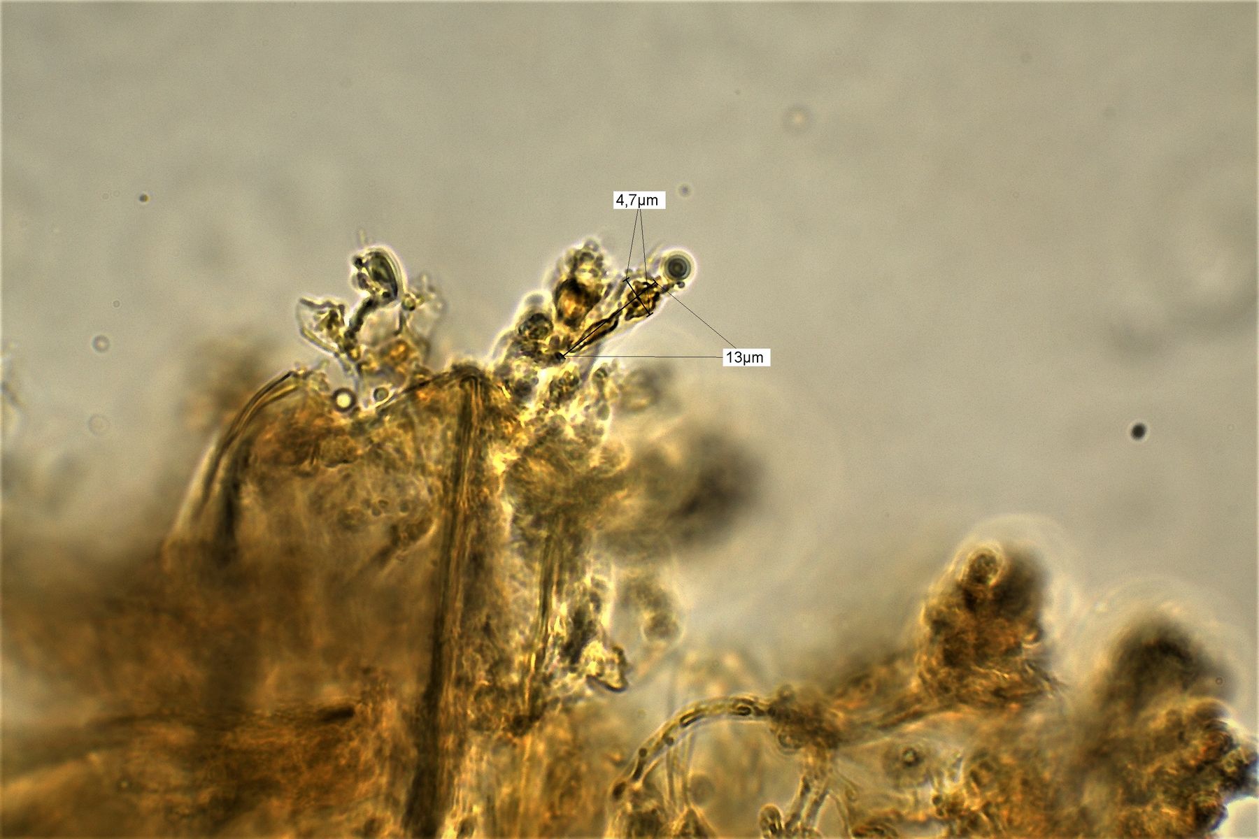 vielen Dank! Die Sporen waren vom dem großen Fruchtkörper. Bis ich Daheim angekommen bin, hatte er in dem Pappkarton ausgesport, und davon habe ich das Präparat gemacht für die Sporen aus zu messen.