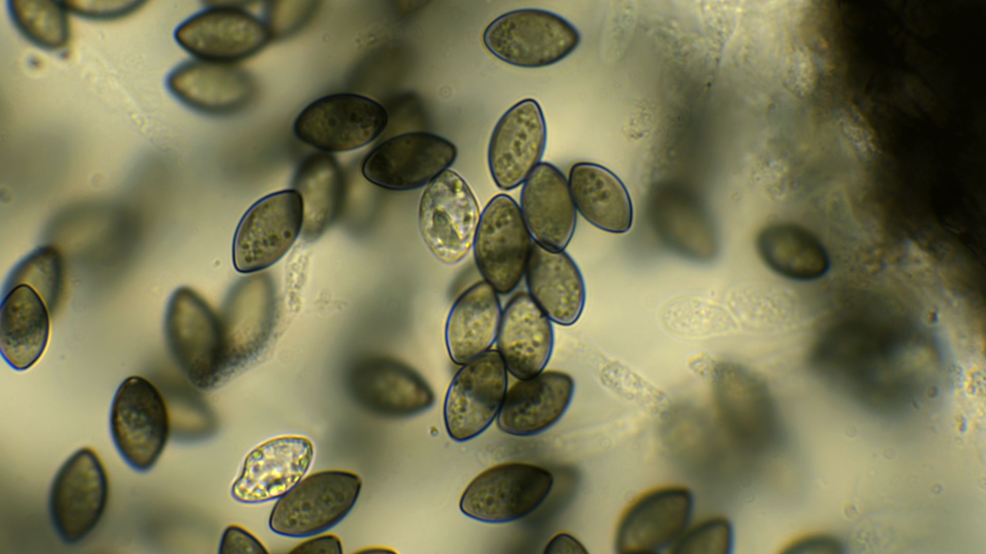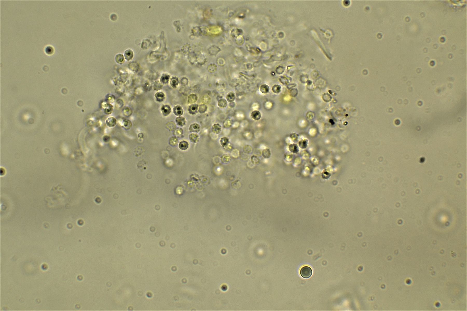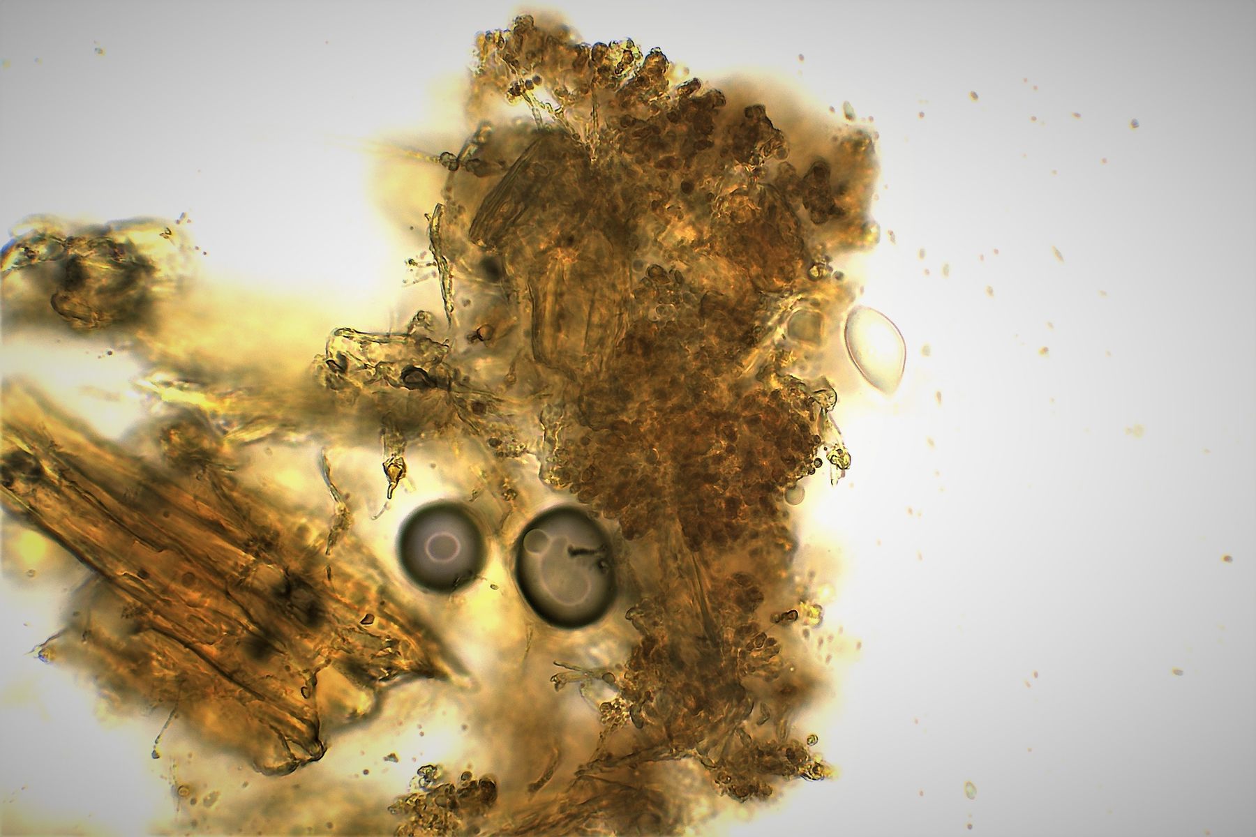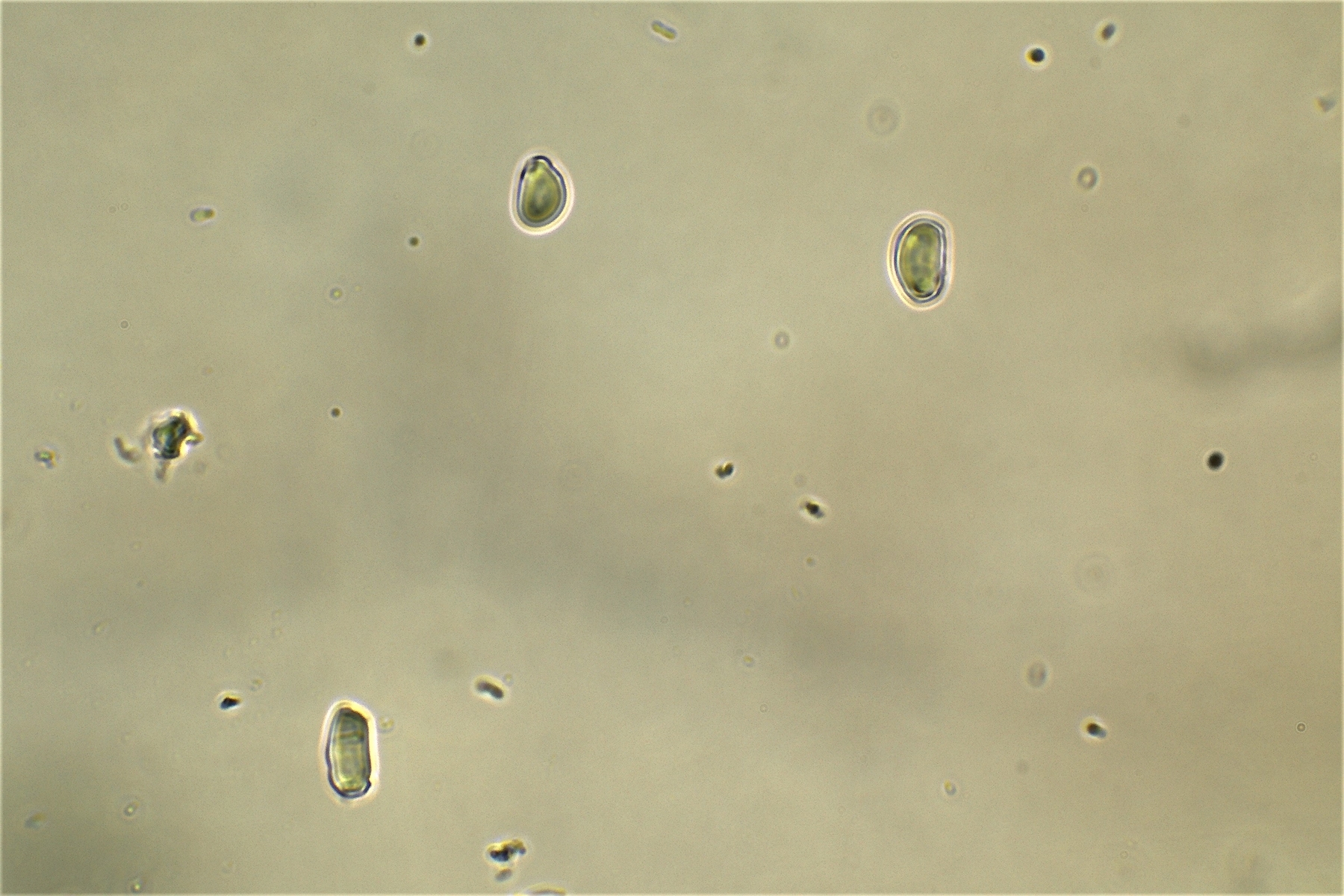 vielen Dank! Die Sporen waren vom dem großen Fruchtkörper. Bis ich Daheim angekommen bin, hatte er in dem Pappkarton ausgesport, und davon habe ich das Präparat gemacht für die Sporen aus zu messen.