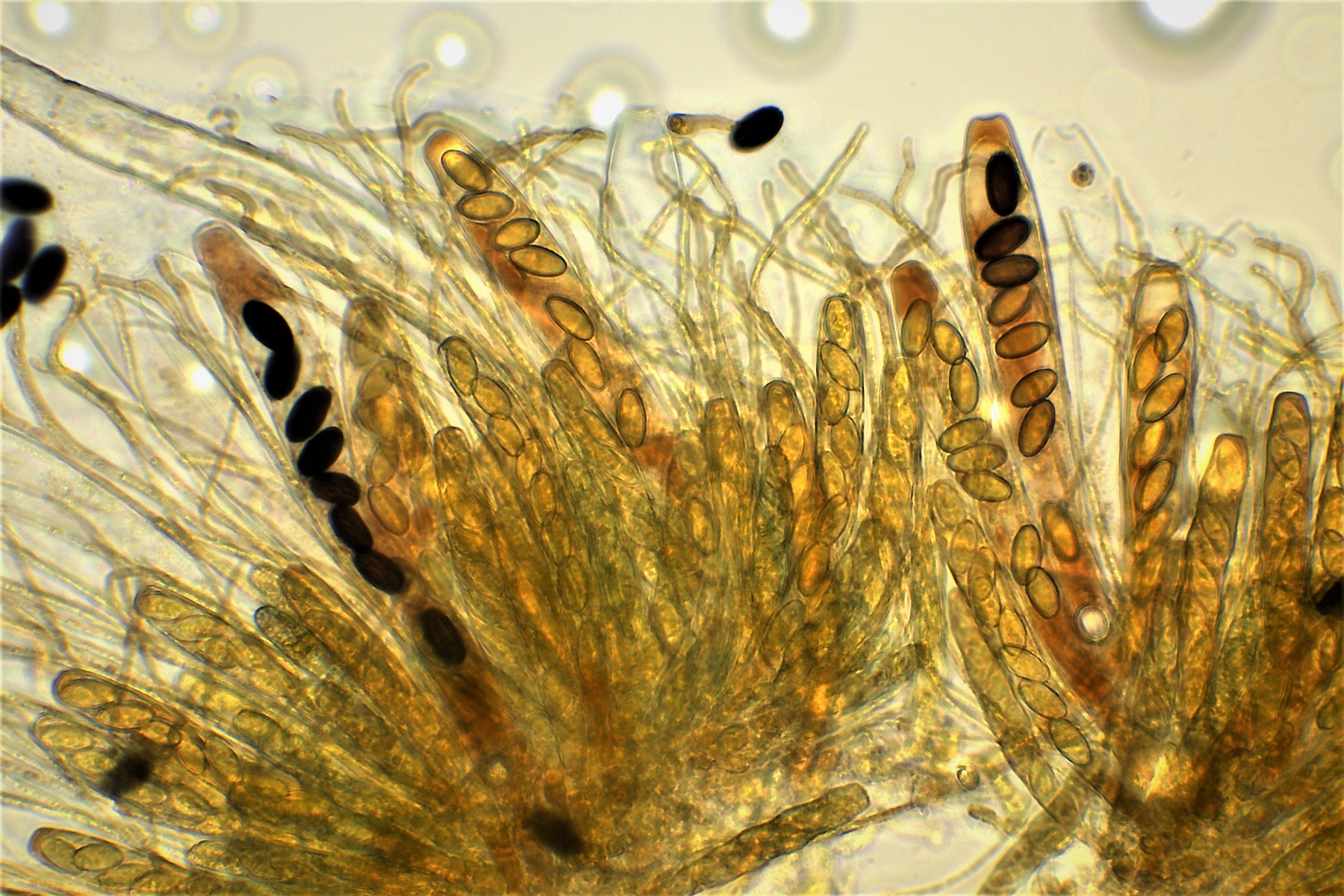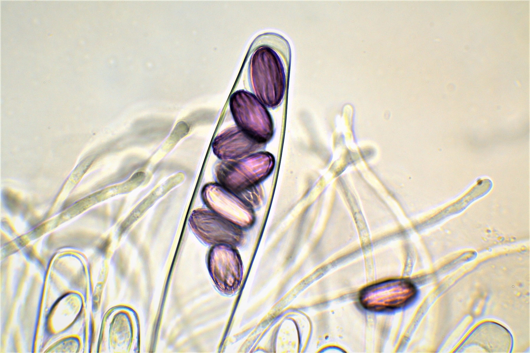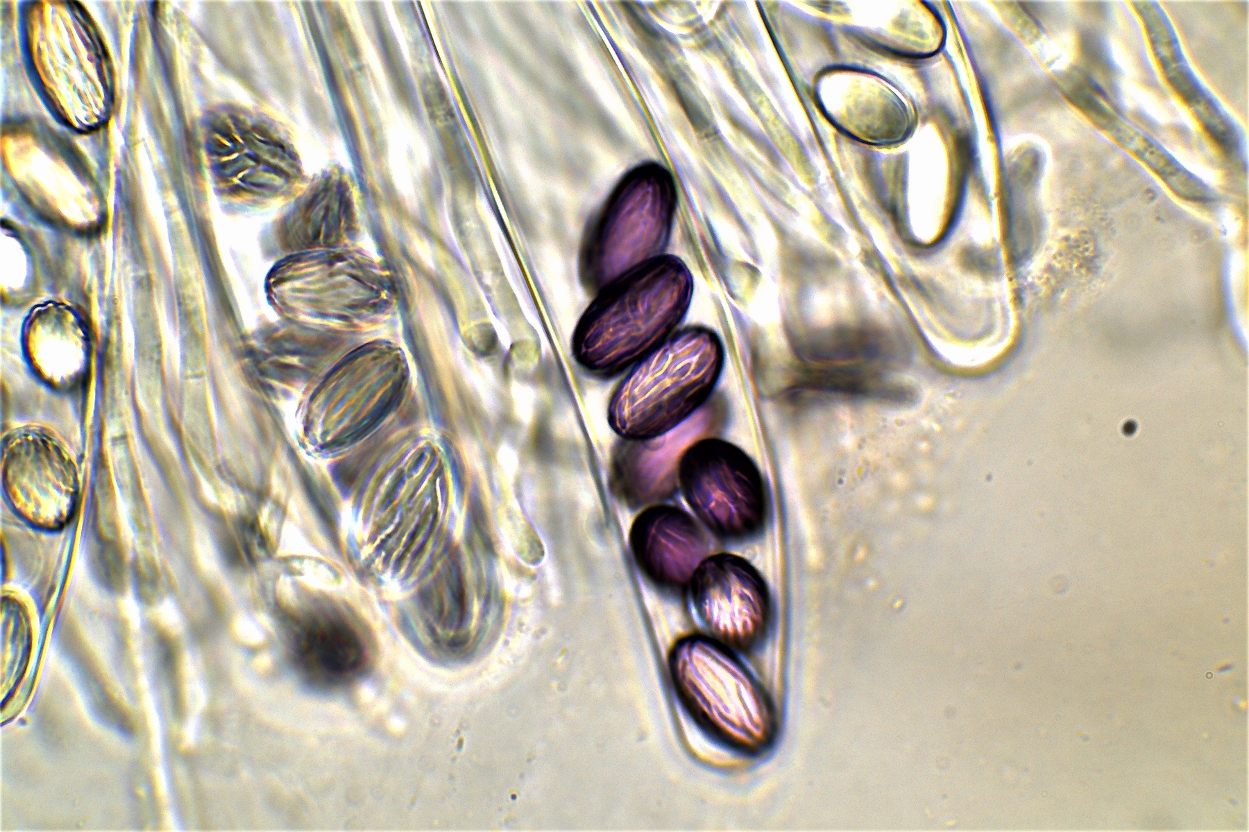 die Sporen sind jetzt reif und haben eine sehr schöne violette Farbe angenommen mit einem langestreckten, fischernetzartigen Ornament. Das ganze wirkt sehr edel und erinnert an teure Farberge-Stil-Eier. Beim Mikroskopieren war recht viel Bewegung unter dem Glas, verschiedene Deckel von reifen Ascis haben sich geöffnet und die Sporen sind schnell hervor gekommen. Bin gespannt um welche Art es sich hier handelt. Auf jeden Fall hat es sehr viel Spaß gemacht!