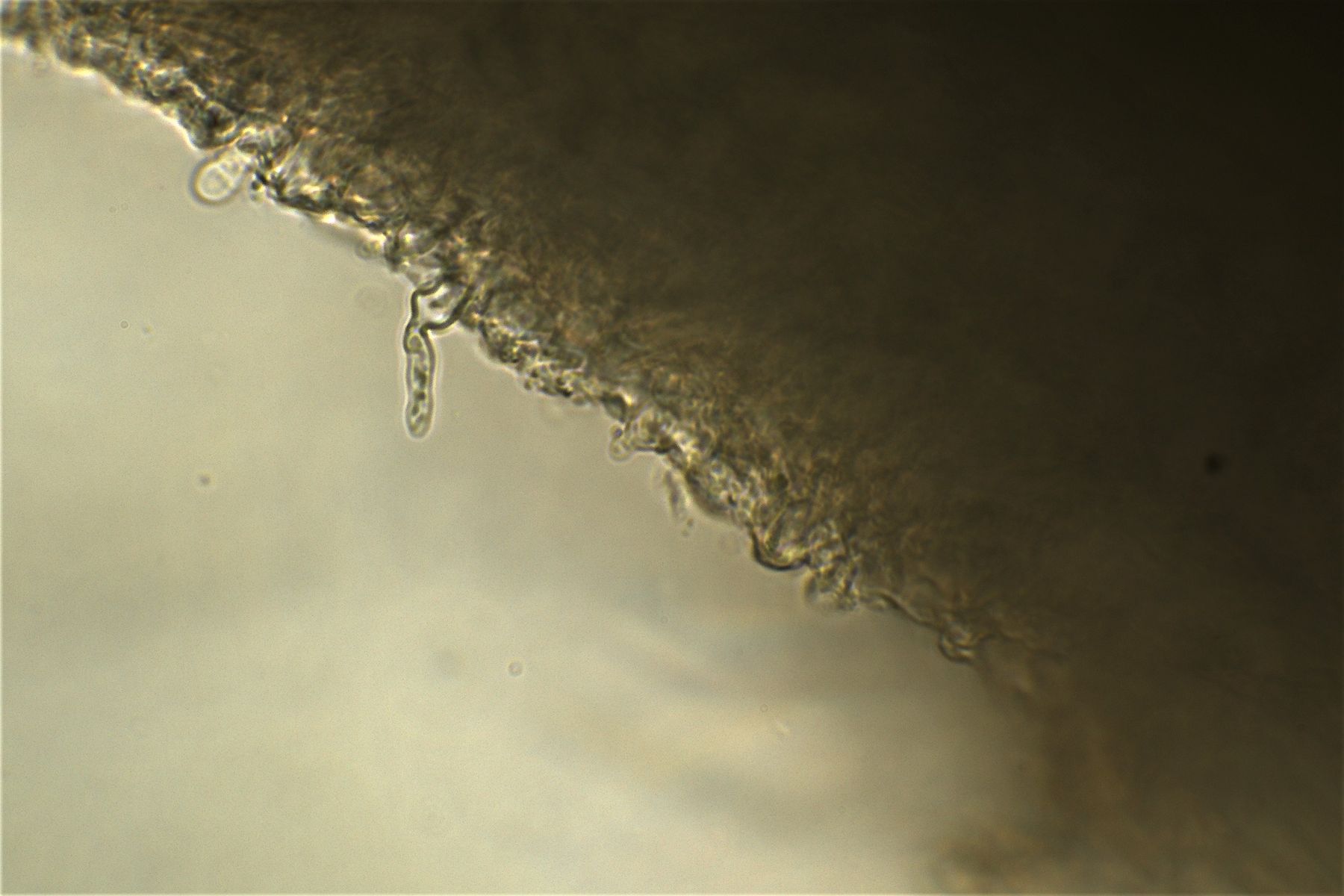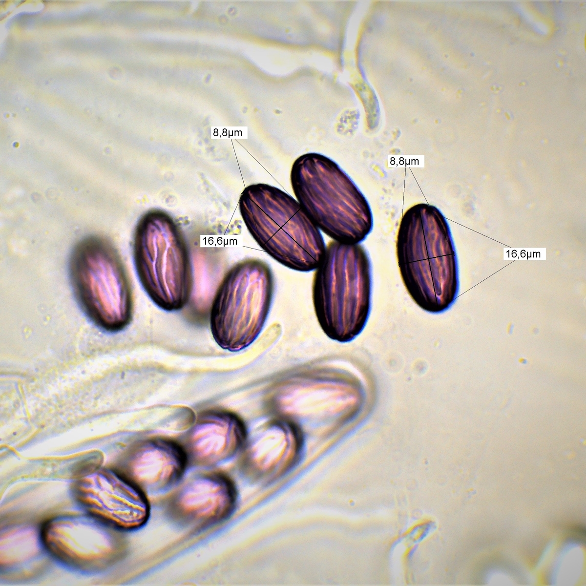 es ist immer schwierig wenn man nicht selber etwas gefunden hat und gleich Bilder vom direkten Standort machen kann. Der dürfte dann kein Velum haben und der Lamellenansatz wäre auch eher frei, bei den geschrumpelten Pilzen schon schwierig wenn man sie nicht frisch auf der Hand hatte. Die Sporenform und Größe würde sehr gut passen. Ich schaue noch nach den Pileozystiden ob ich welche finde.