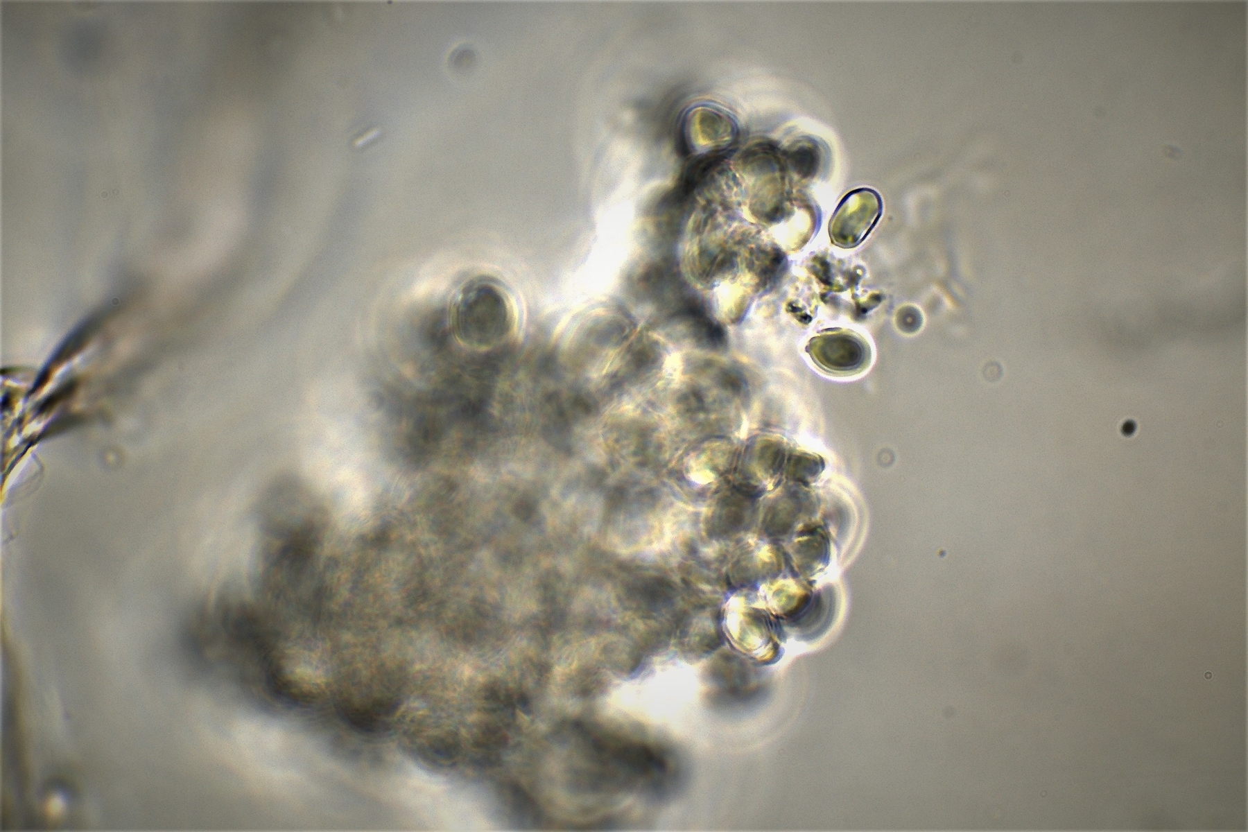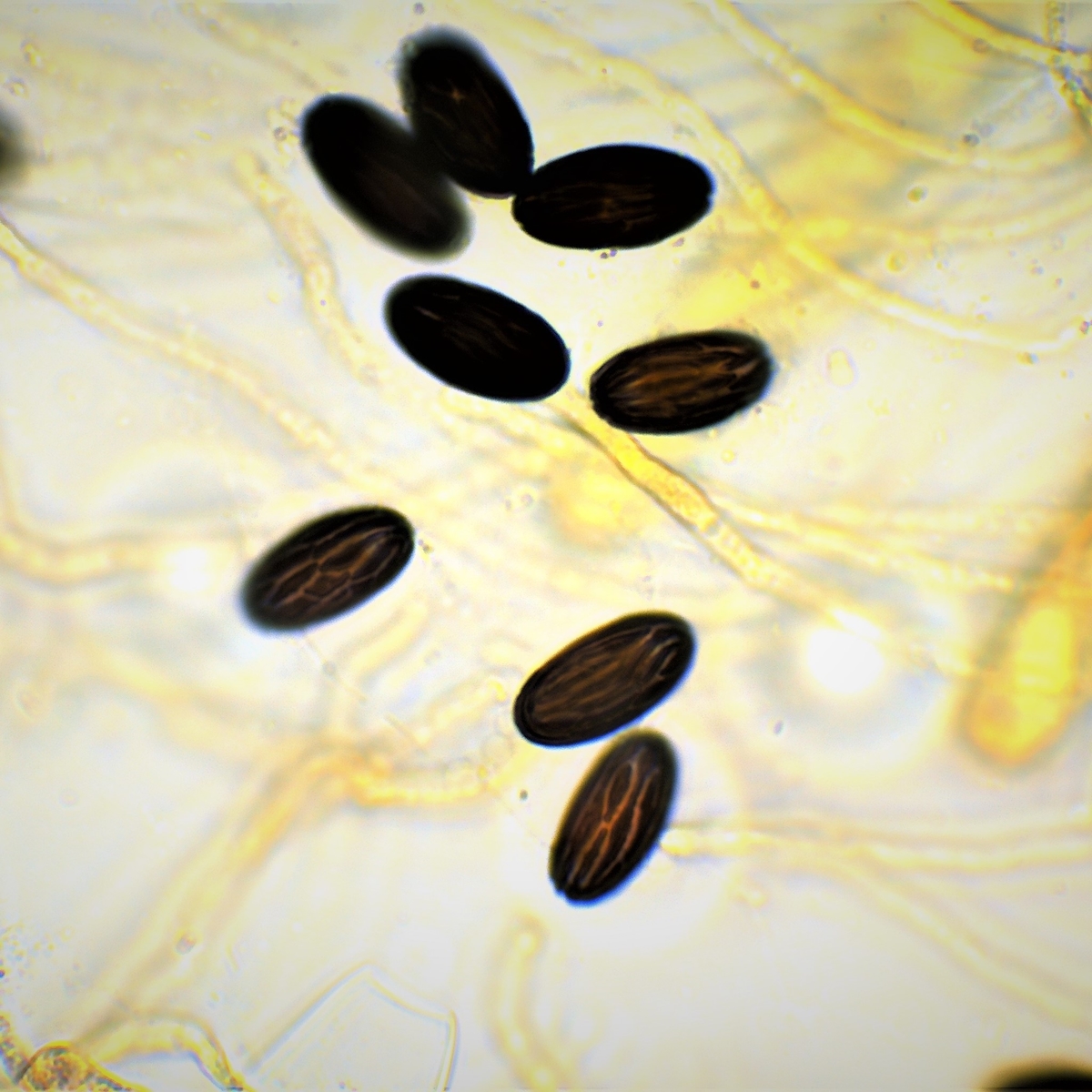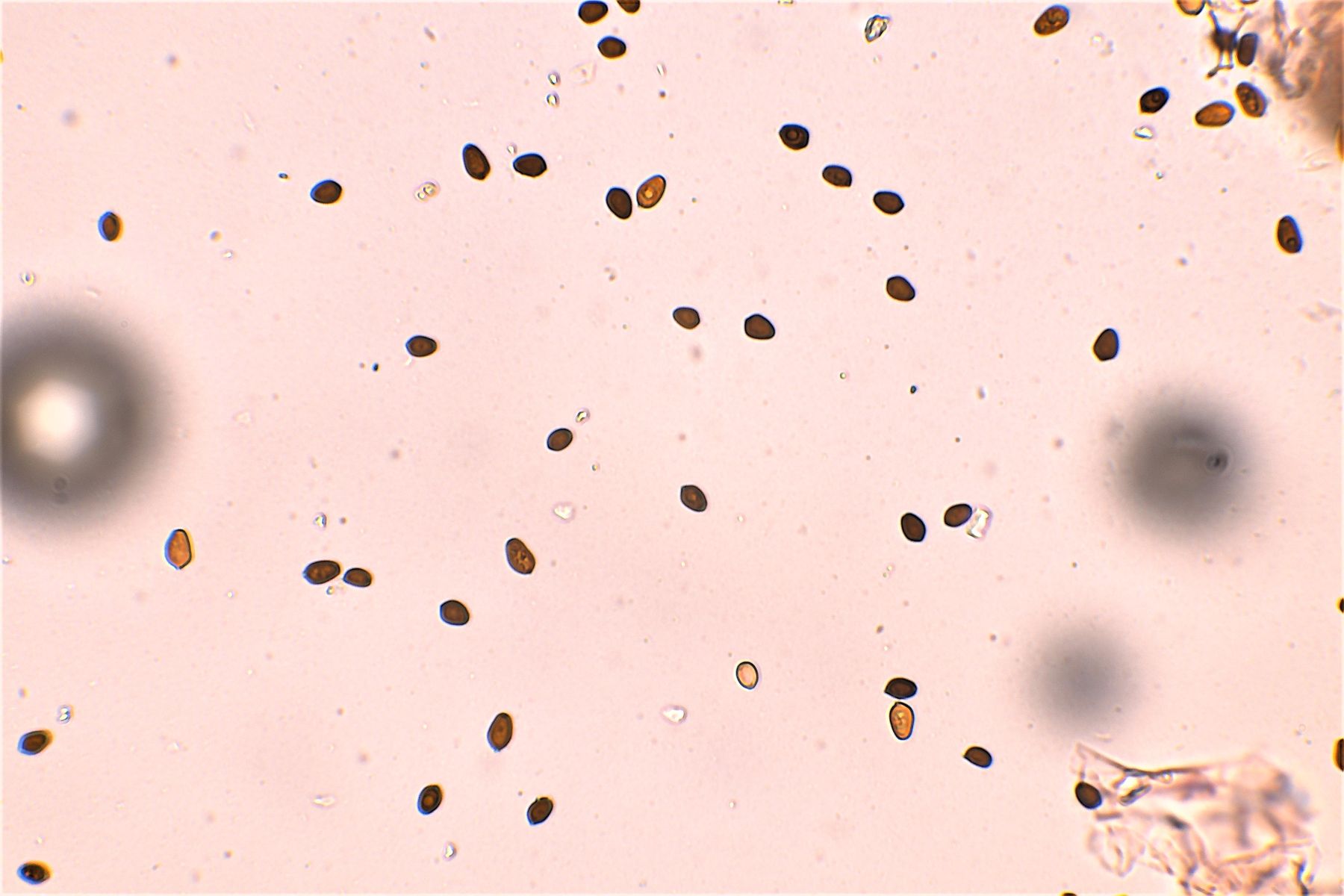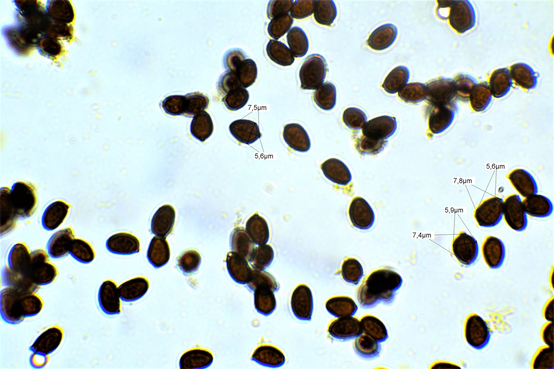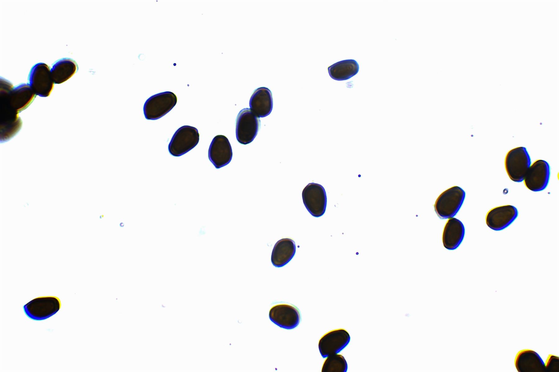 Die Sporenmasse hat einen olivbräunliche Farbe und auch einen muffigen Geruch. Mit Beurteilung der Sporen von glatt zu feinwarzig tue ich mir schwer, deshalb habe ich auch in Baumwollblau noch einmal nach gesehen.