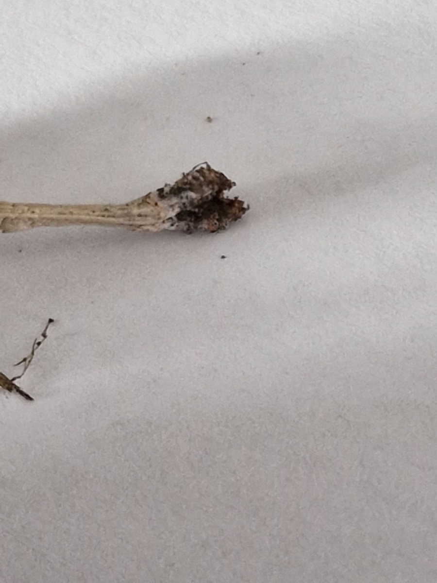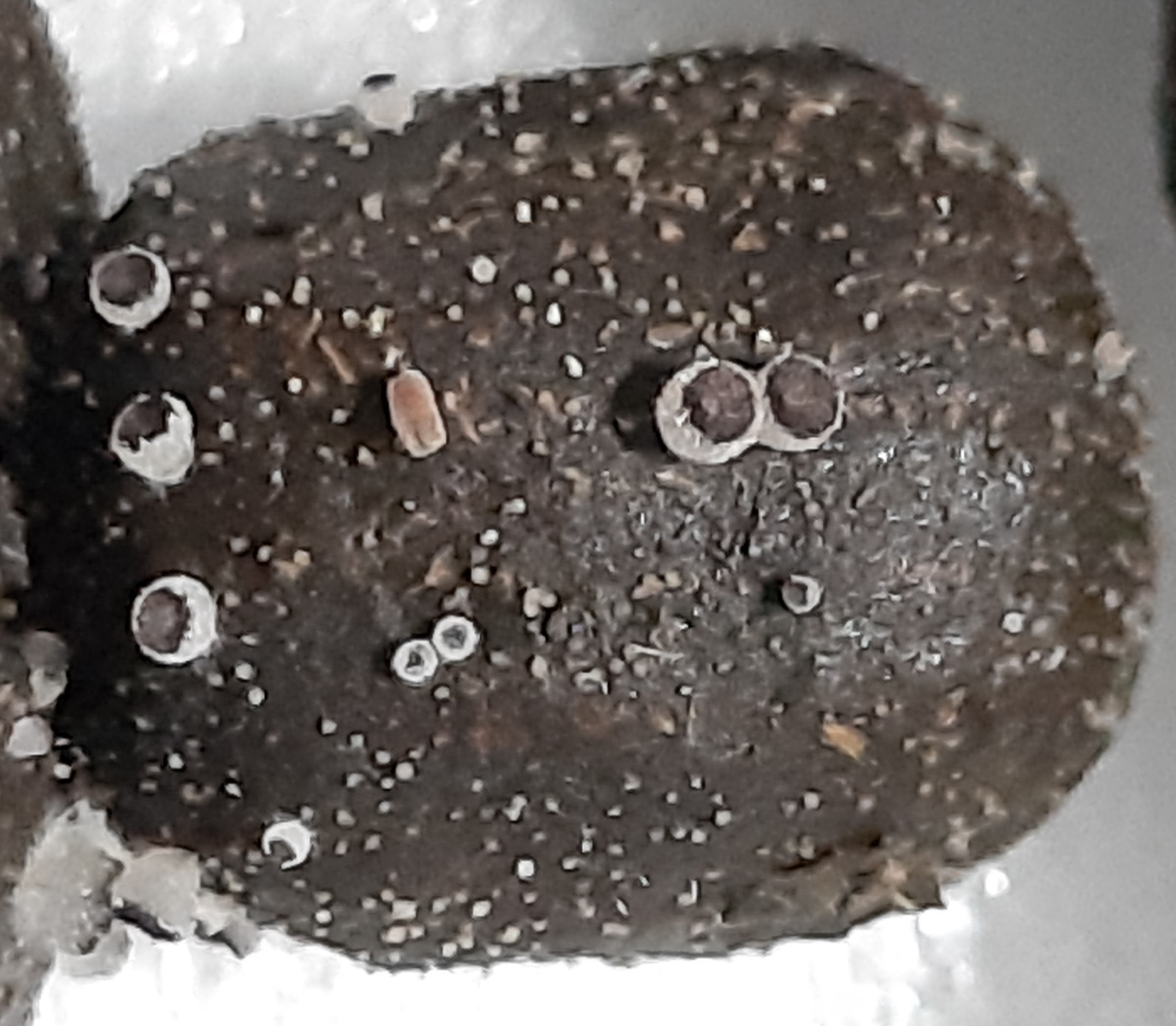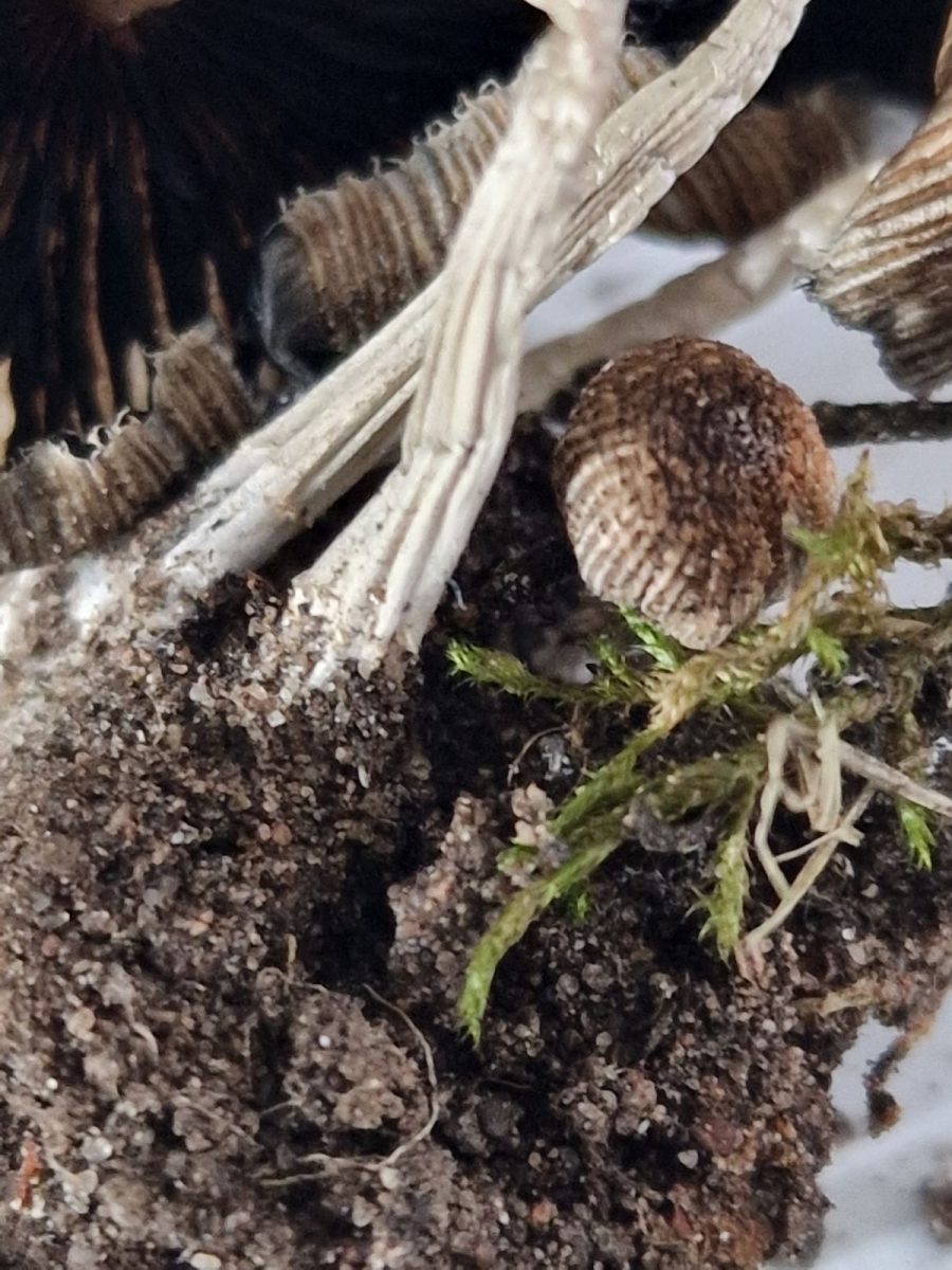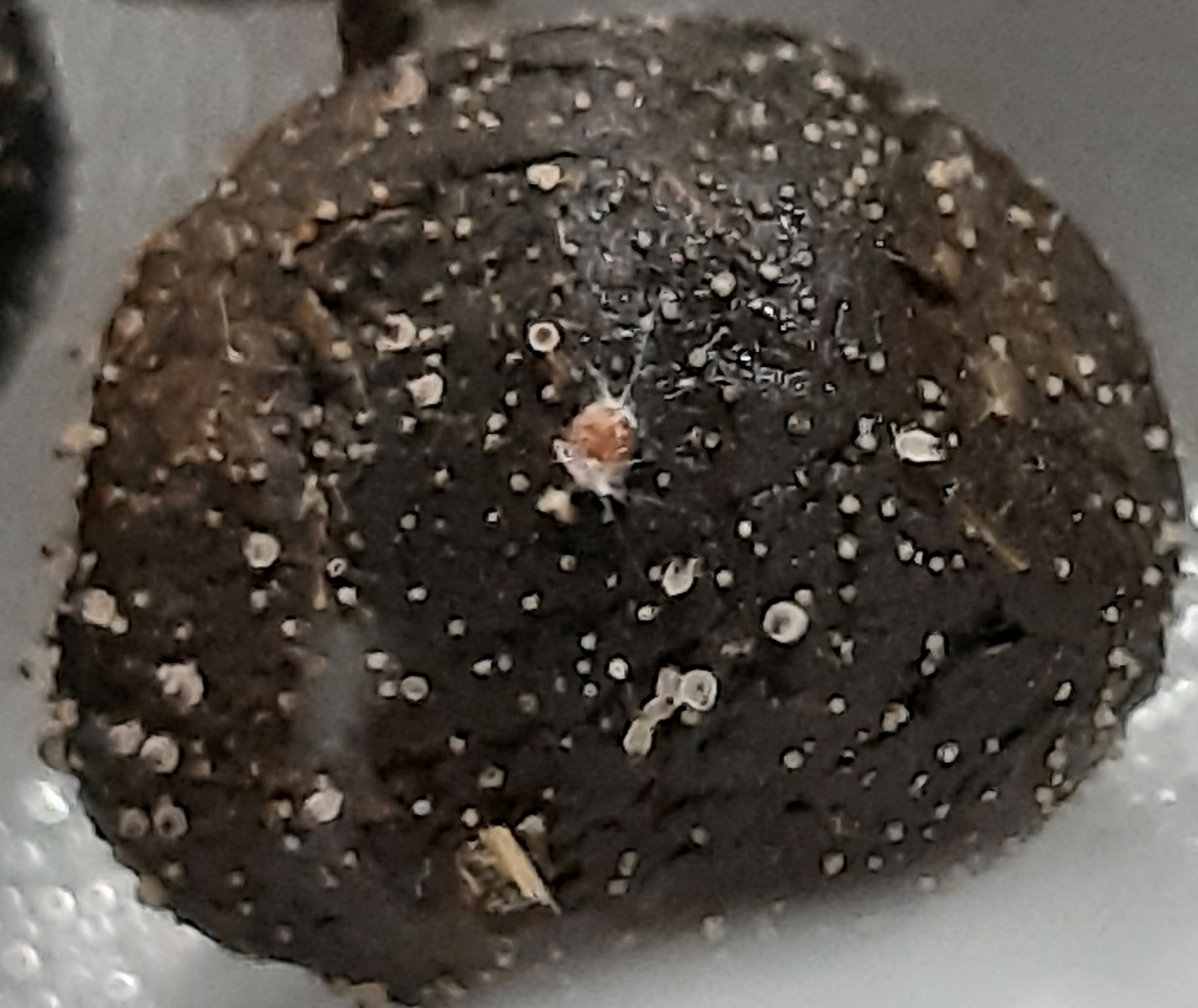 auf einem der Köttel war auch eine kleine orangene Kugel mit deutlichen abgerundeten Warzen, die an zwei Seiten befestigt war mit hellem spinnenwebähnlichen, fädigen Netz. Das Innere hatte ich mir angesehen, schöne jadefarbige Zellen weiß aber nicht was das sein könnte.