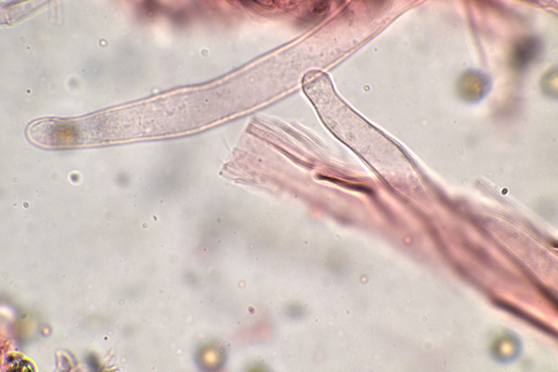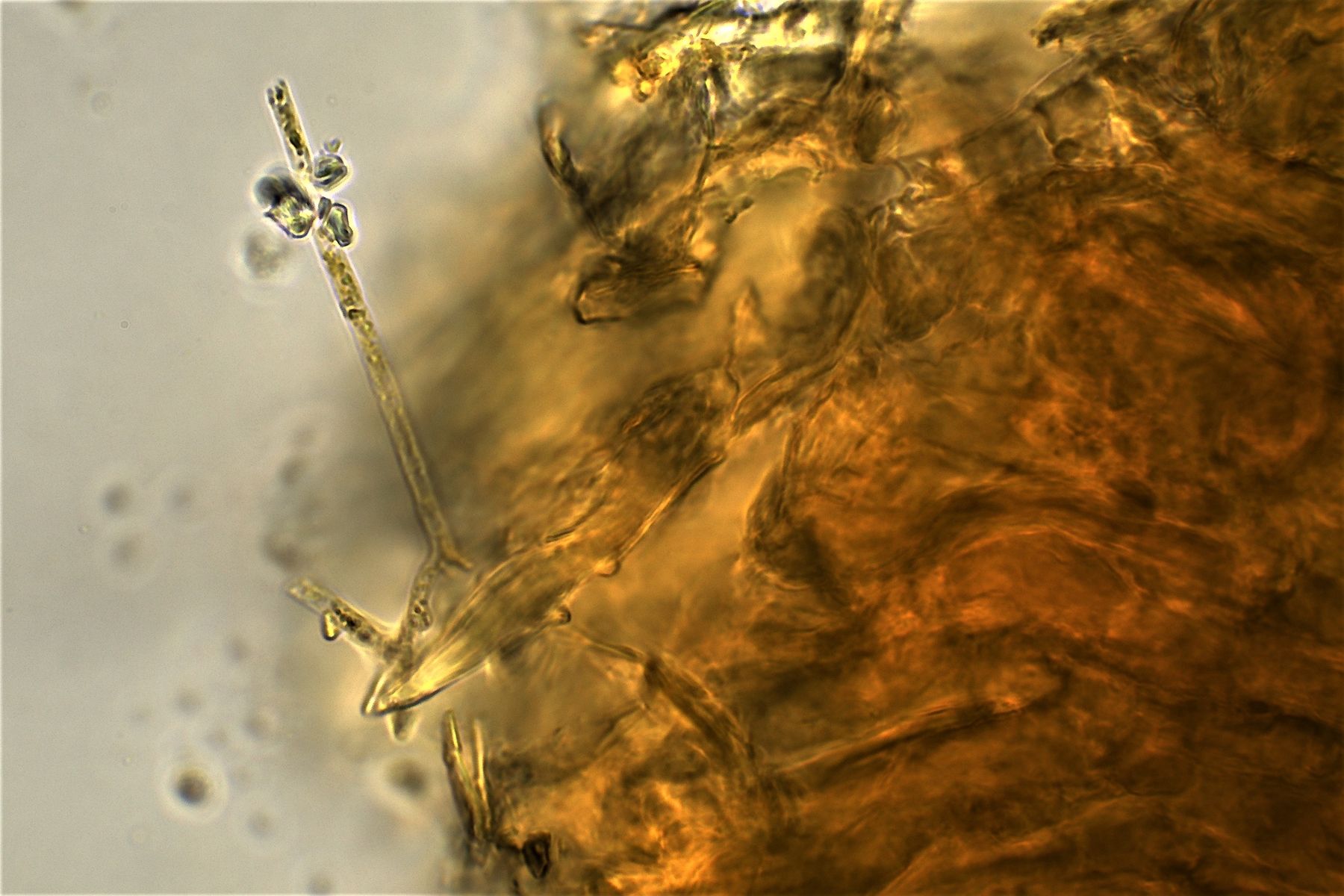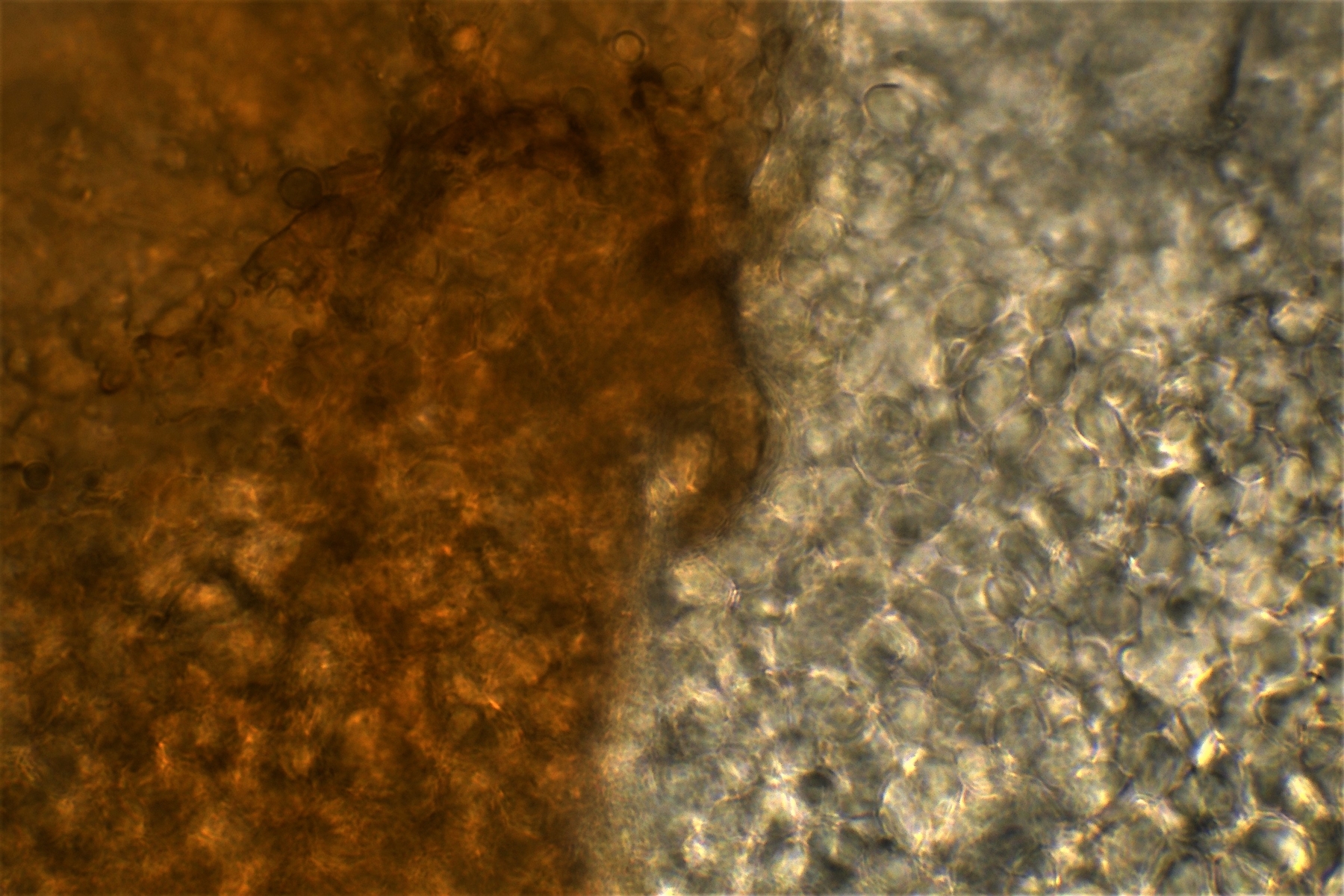 anbei die Aufnahmen vom Lumen zum Subikulum. Dünner Schnitt war schwierig, trotz Trocknung war der Porling immer noch elastisch und zäh. Ich habe ein kleinen Stück lange eingeweicht in Wasser und dann auseinander gezupft.