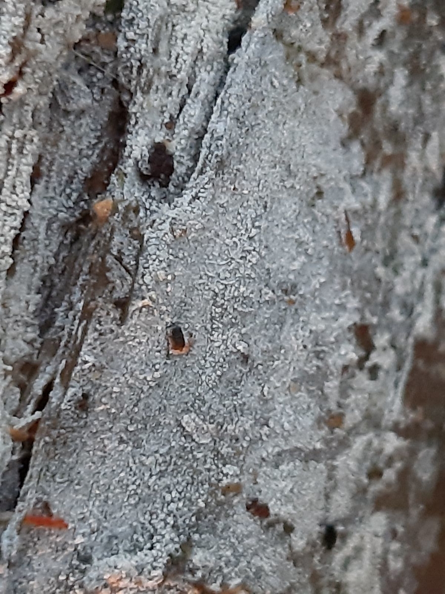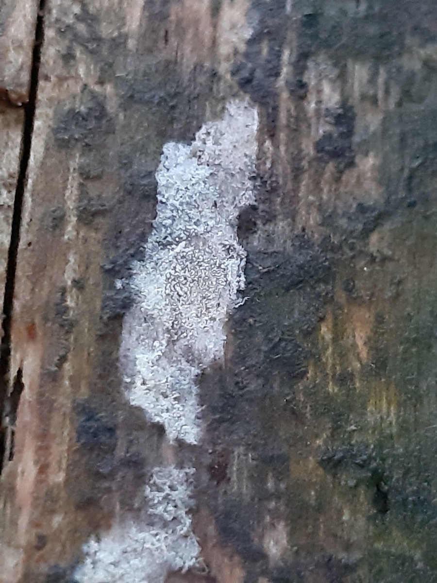 der Pilz liegt locker bestäubt und spinnwebartig auf dem Substrat, hat keine Poren oder Stacheln