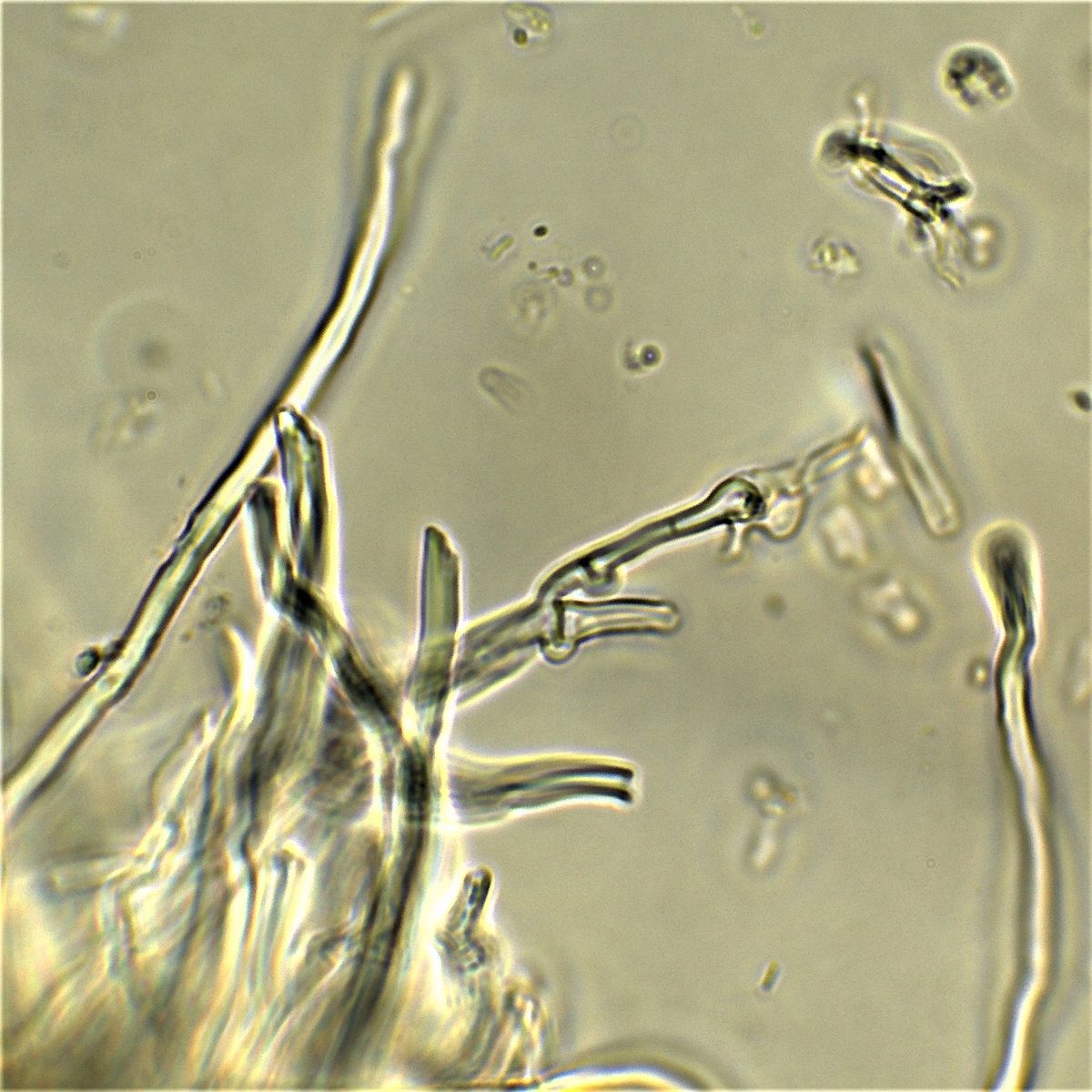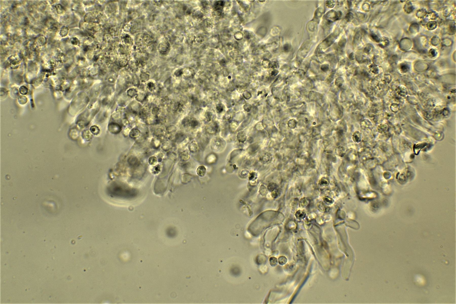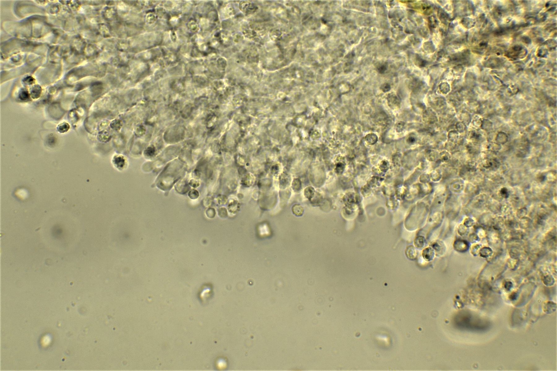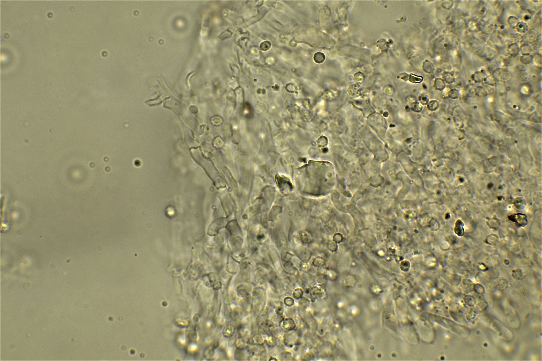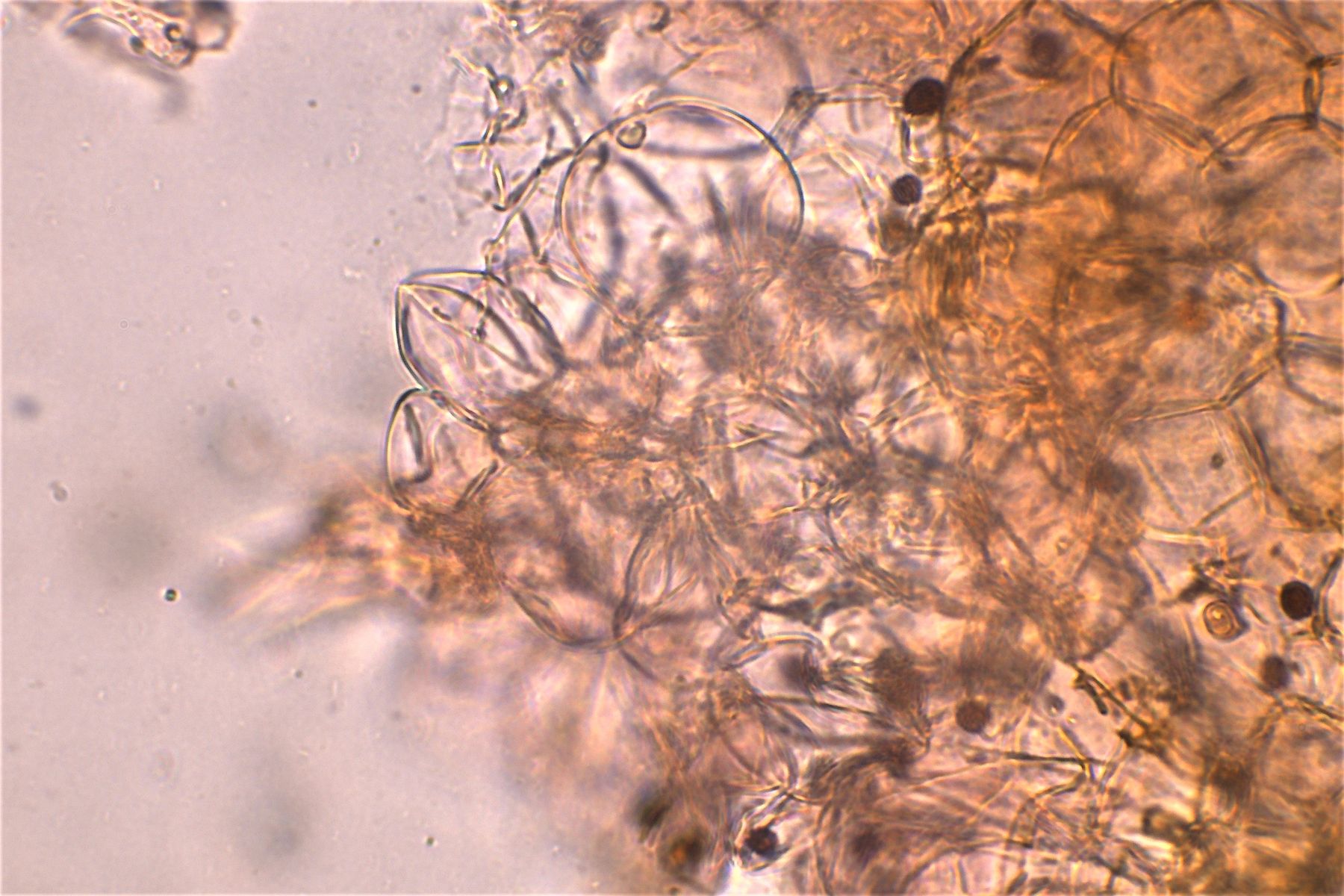 Hutvelum rundliche und gestreckte, hyaline Zellen, wie eine Kette aneinander gereiht. Die gestreckten in bräunlichem Ton.