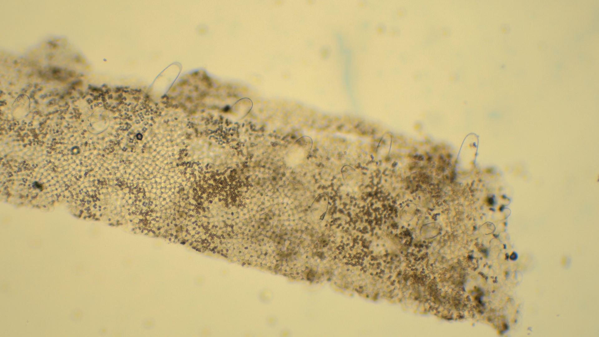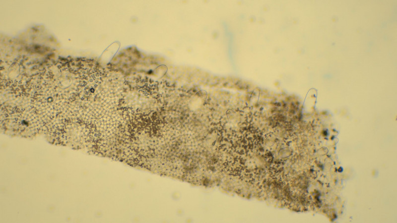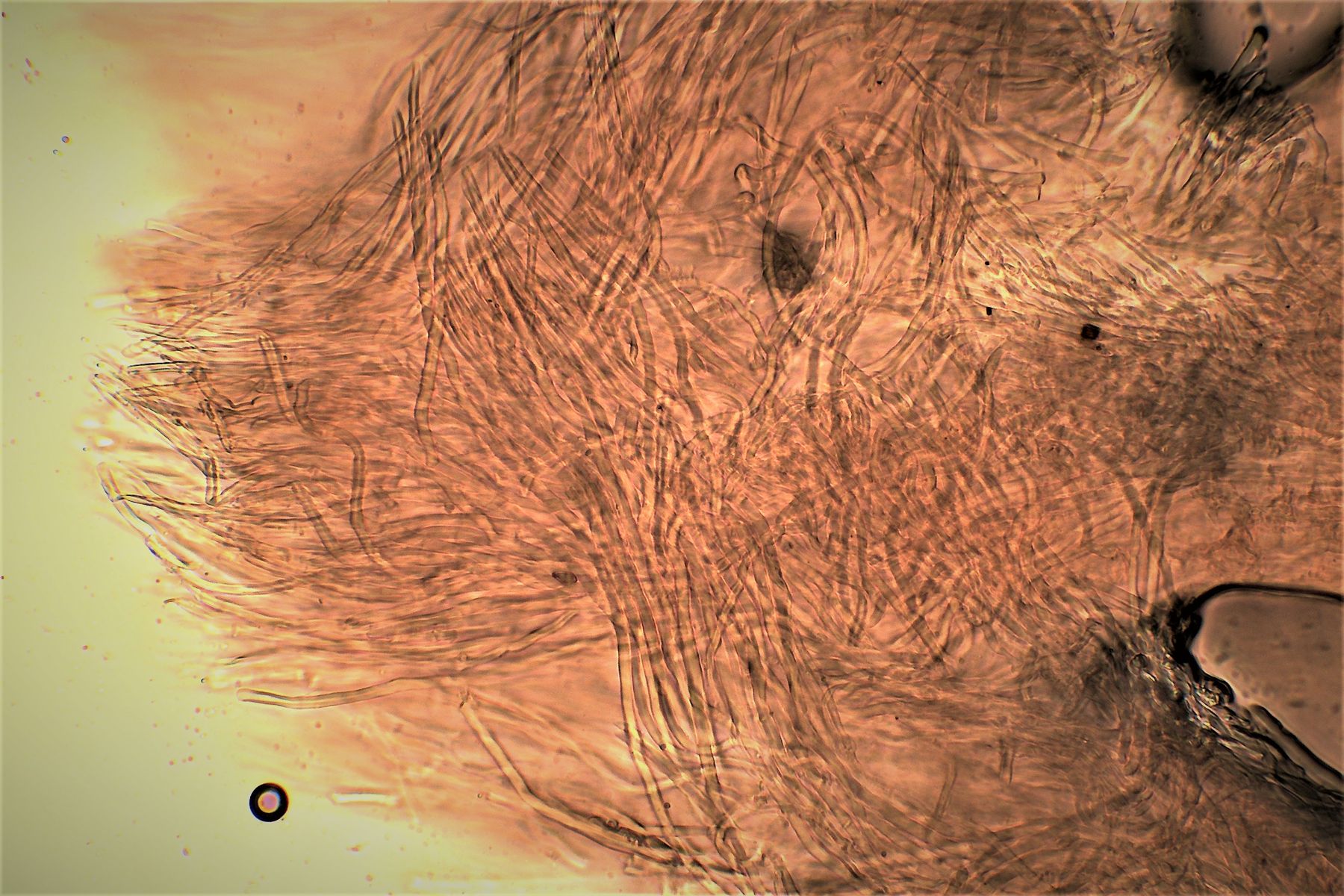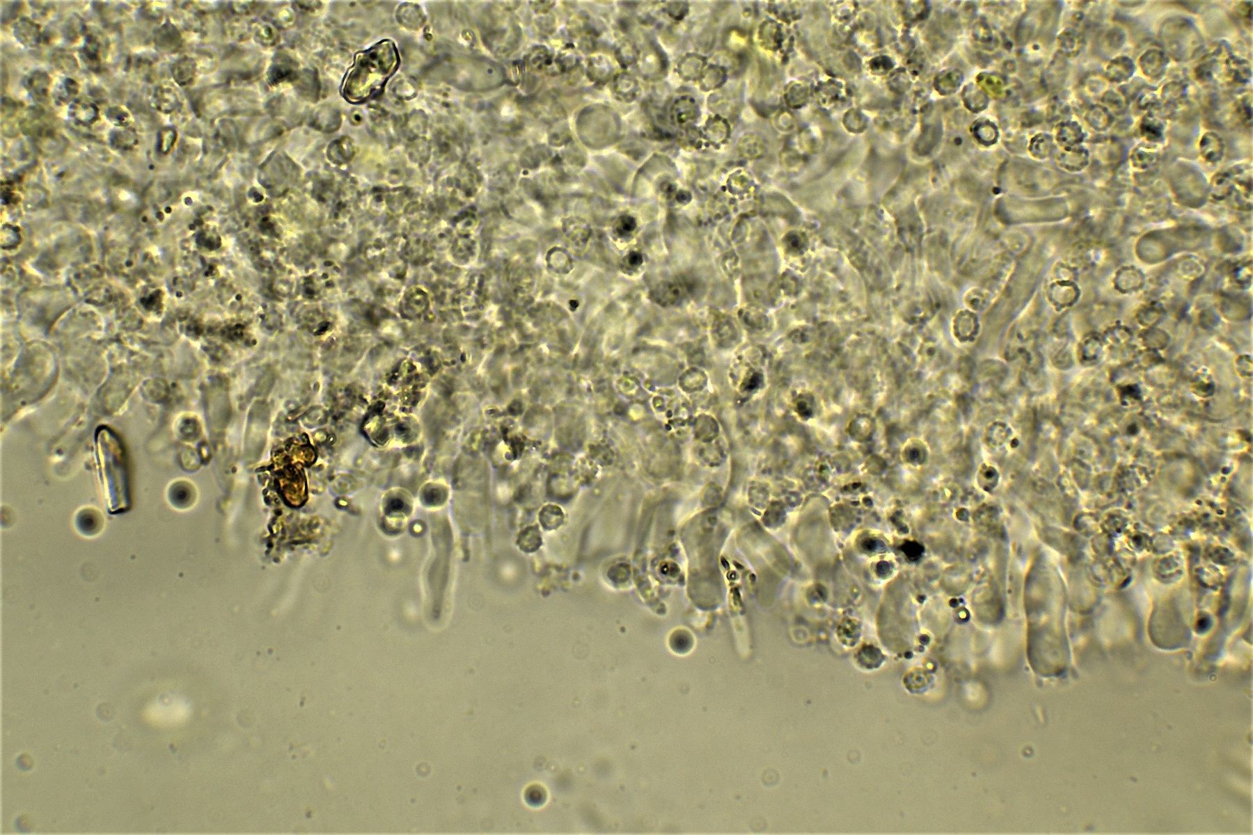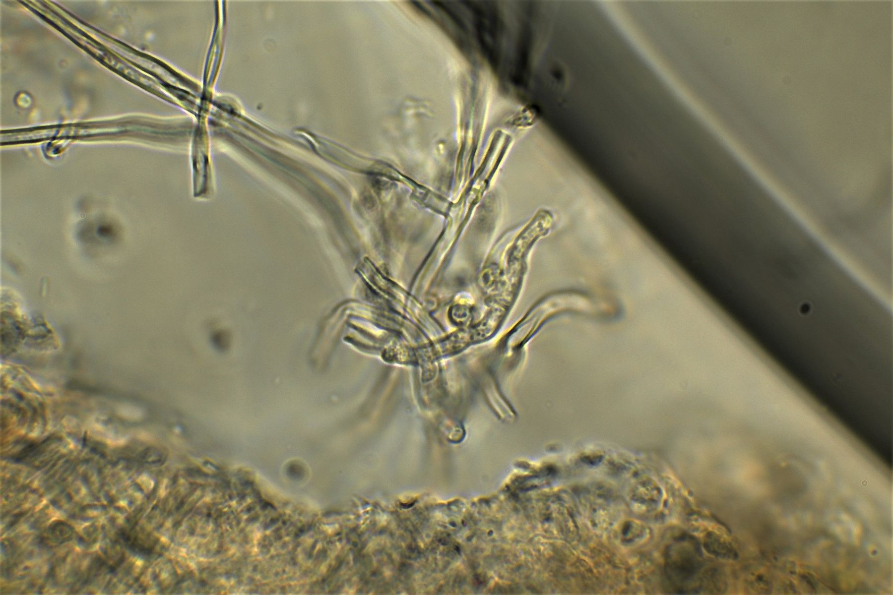 Hutvelum rundliche und gestreckte, hyaline Zellen, wie eine Kette aneinander gereiht. Die gestreckten in bräunlichem Ton.