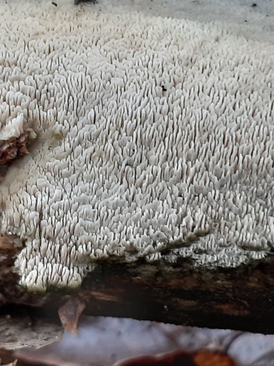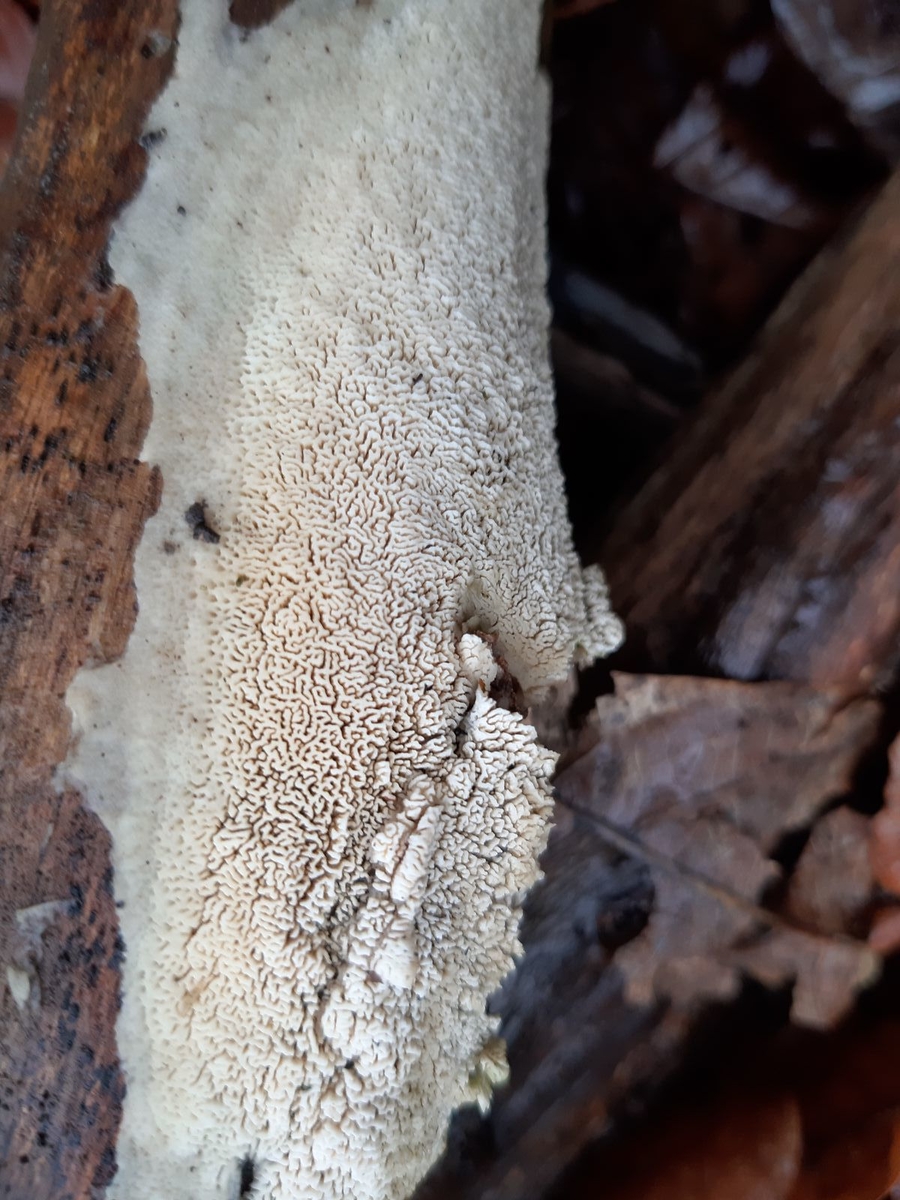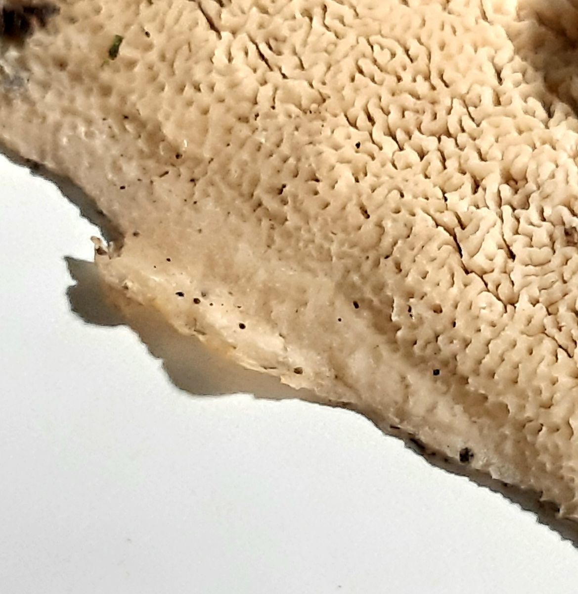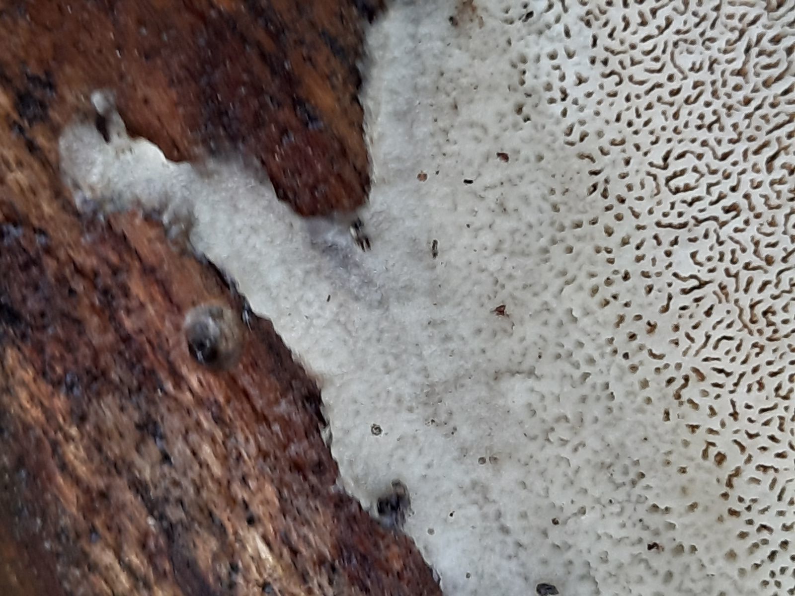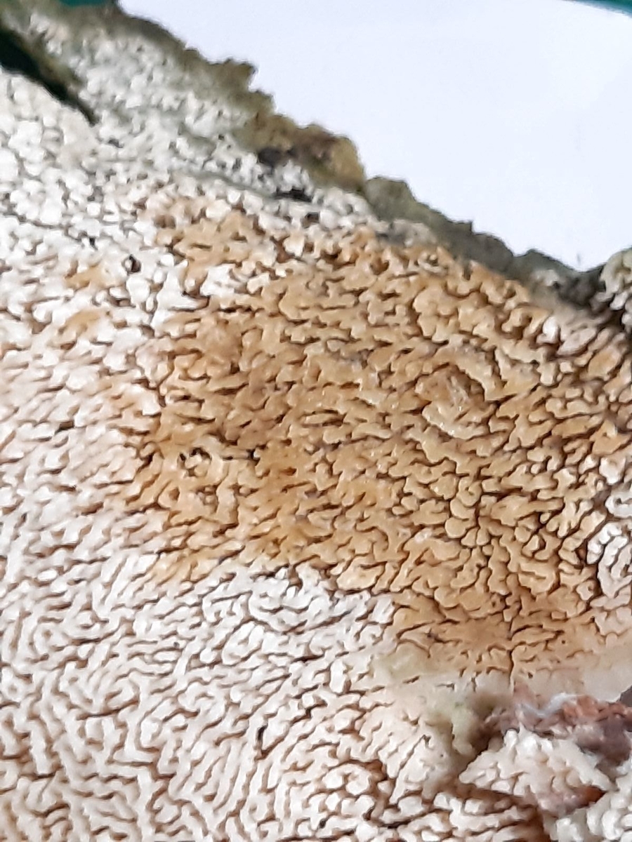 diesen hellen, resupinaten Porling habe ich auf einem liegenden Buchenholzast gefunden. Der Pilz hatte eine elastische Konsistenz und ließ sich mit einem Messer dadurch vom Substrat lösen ohne zu reißen. Die Maße 12cm lang und 3 cm breit. Die Porenaufsicht erinnert an einen Irrgarten-Labyrinth und bilden ein einer Stelle auch kleine Zähnchen aus. Zur helleren, weißlichen, dünneren Randzone waren sie unregelmäßig rundlicher, 1-2 Poren auf einen Millimeter. Man weiß gar nicht wie man das drehen und zählen soll