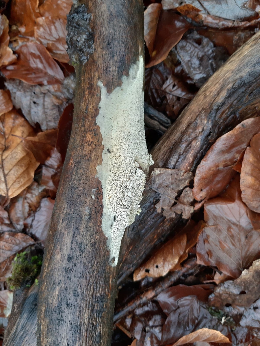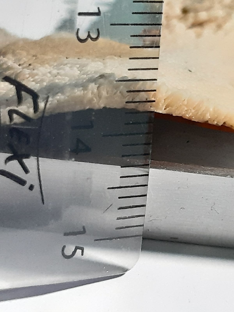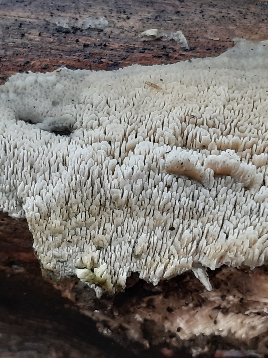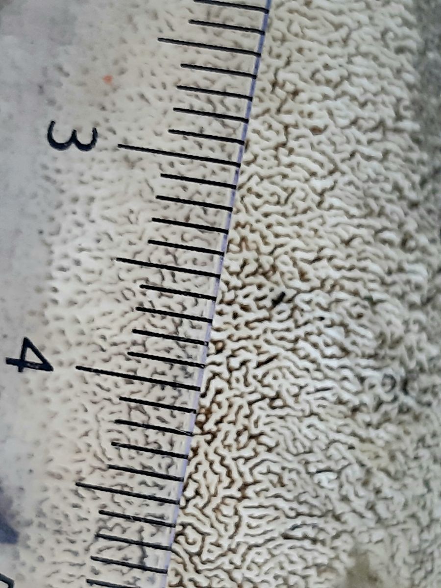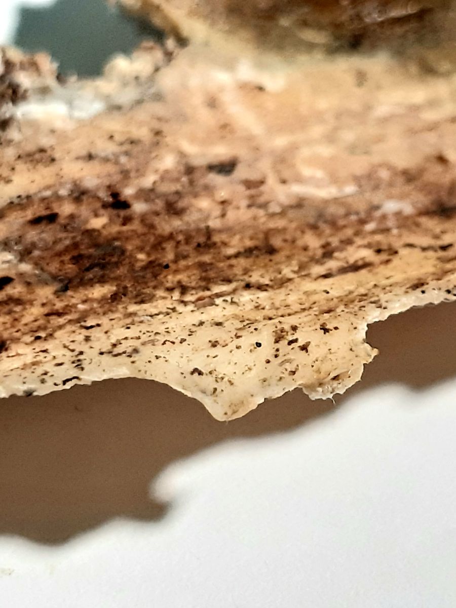 diesen hellen, resupinaten Porling habe ich auf einem liegenden Buchenholzast gefunden. Der Pilz hatte eine elastische Konsistenz und ließ sich mit einem Messer dadurch vom Substrat lösen ohne zu reißen. Die Maße 12cm lang und 3 cm breit. Die Porenaufsicht erinnert an einen Irrgarten-Labyrinth und bilden ein einer Stelle auch kleine Zähnchen aus. Zur helleren, weißlichen, dünneren Randzone waren sie unregelmäßig rundlicher, 1-2 Poren auf einen Millimeter. Man weiß gar nicht wie man das drehen und zählen soll
