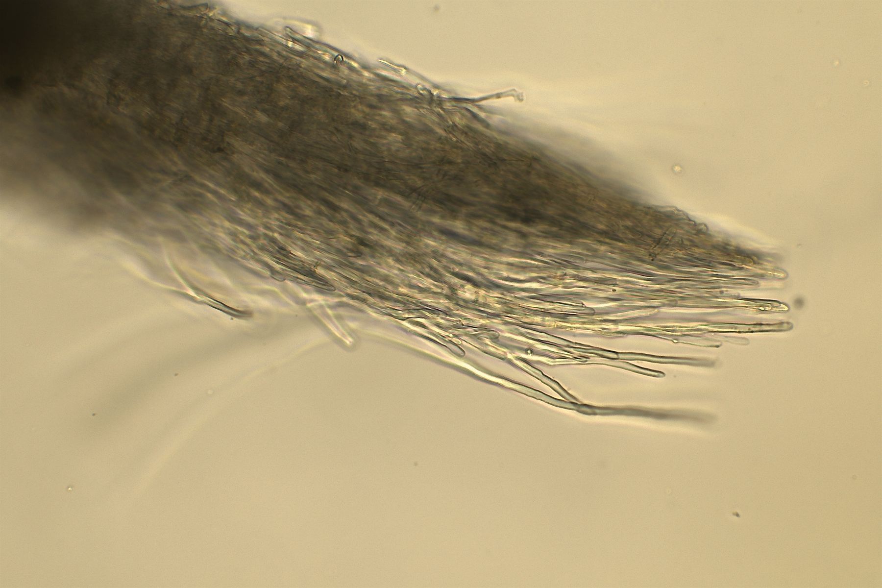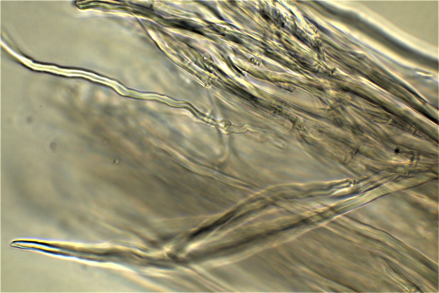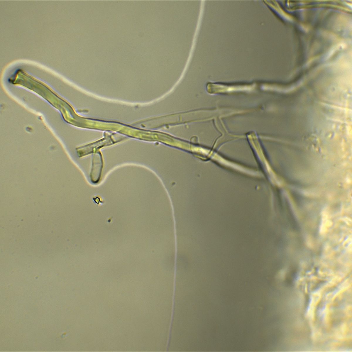 zu Beginn sind diese mit kleinen, kurzen büscheligen Strukturen, über die Länge mehrfach septiert und zur Spitze zu werden sie glatt und enden in einen gekrümmten Haken
