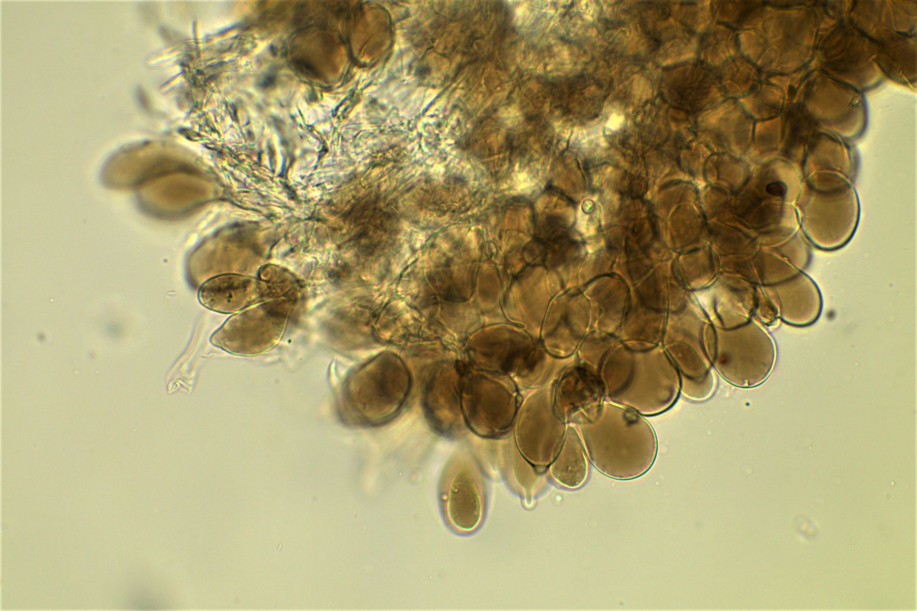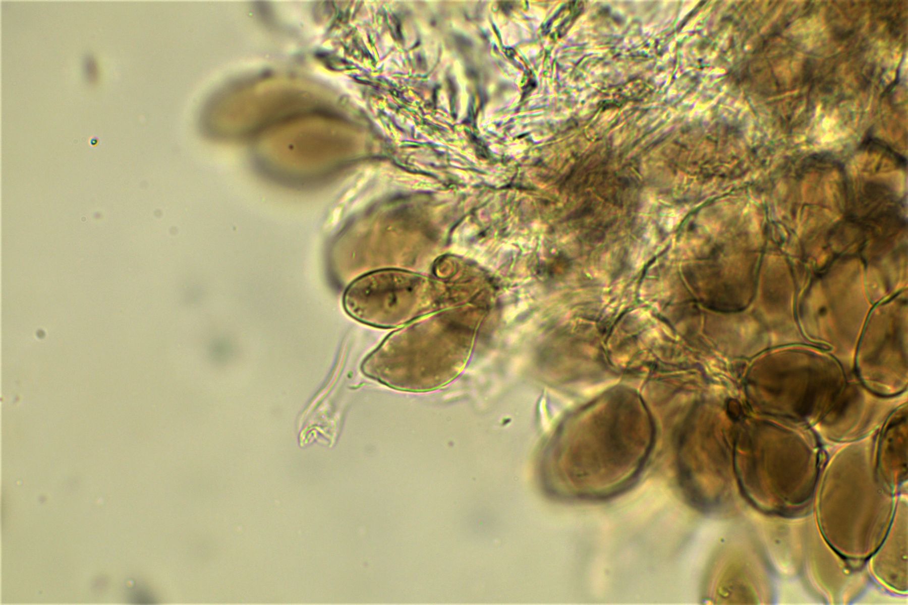 rundliche, braune Sporen mit geraden bis gekrümmten langen Pedicellen
