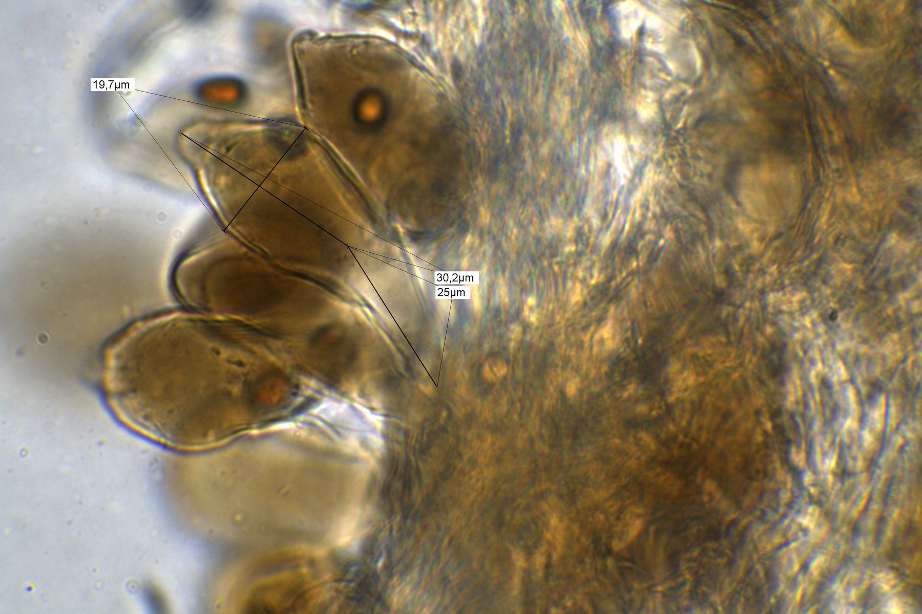 ich hatte jetzt endlich etwas Zeit mir das tolle Pilzportrait von Thorben im Forum genauer an zu schauen. Als Literatur hatte ich Pilze der Schweiz Band 4, dort ist die HDS beschrieben aus blasigen Zellen. Die Pleurozystiden sollen recht groß sein von 45-85 bis 20-30µm. Gefunden habe ich solche großen Zystiden die in 60x Kongorot/Wasser noch zu erfassen sind.