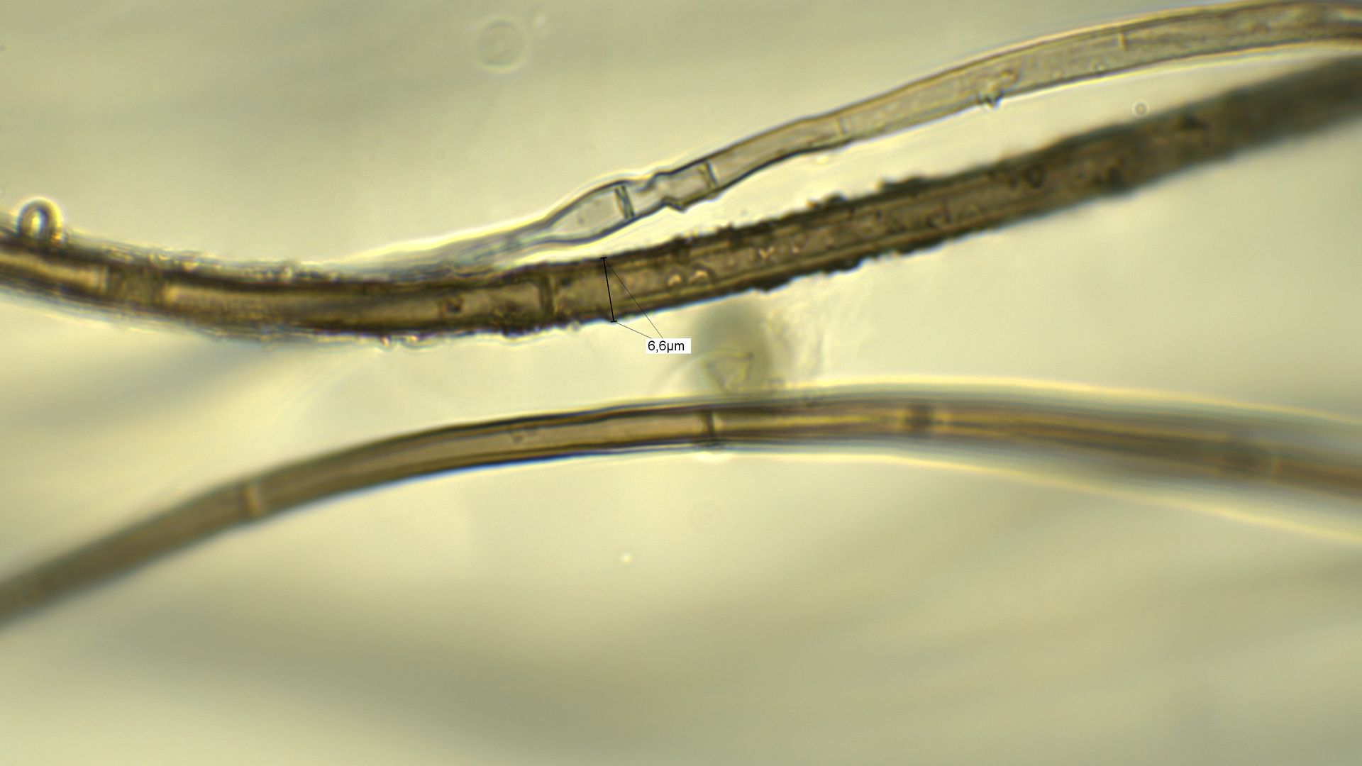 Diese sind dickwandig, relativ breit, stellenweise etwas inkrustiert und nahezu ohne Lumen.