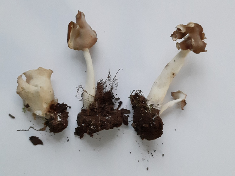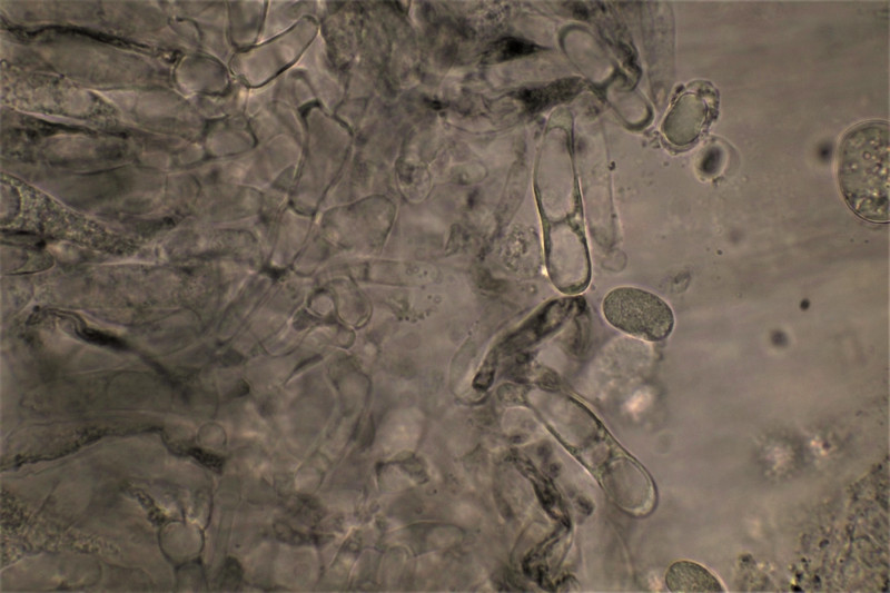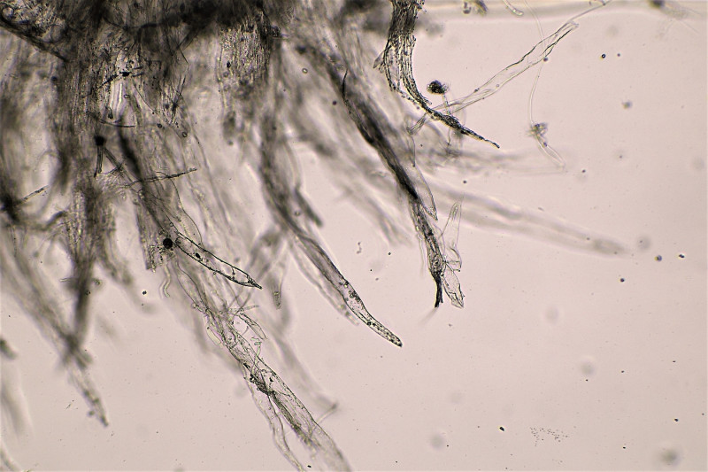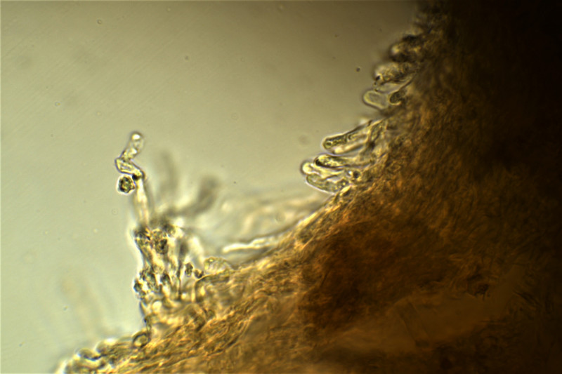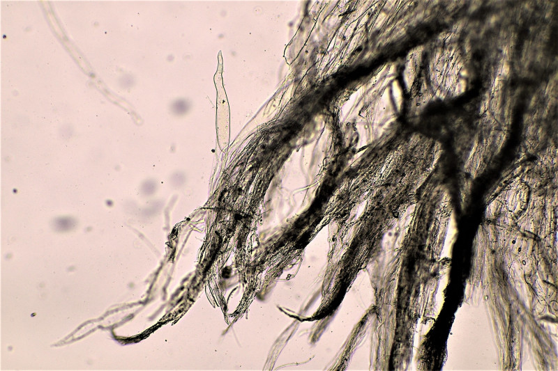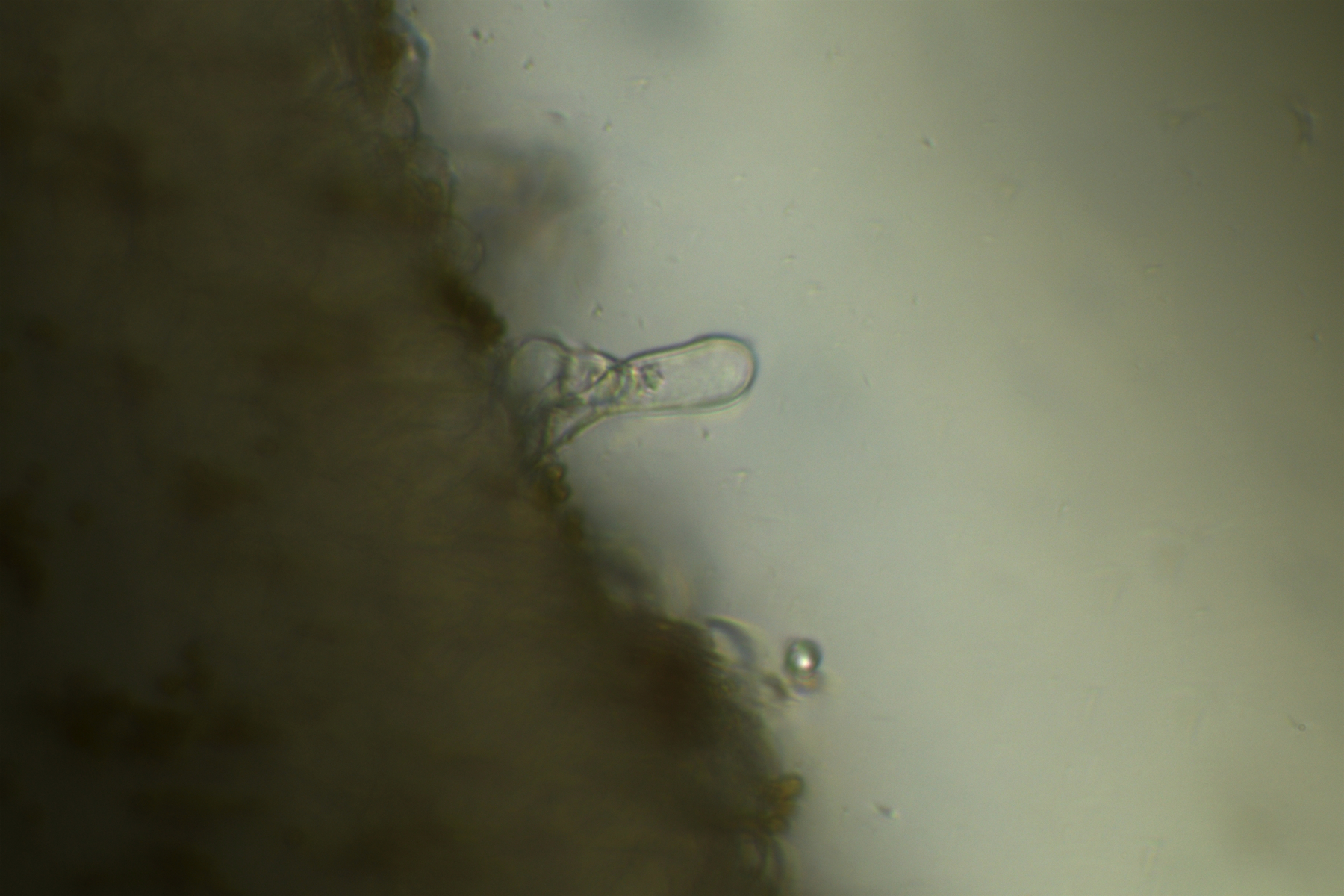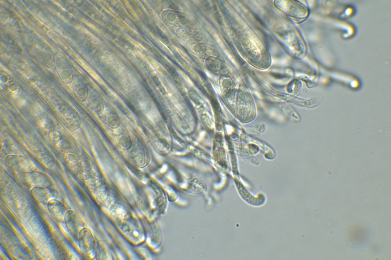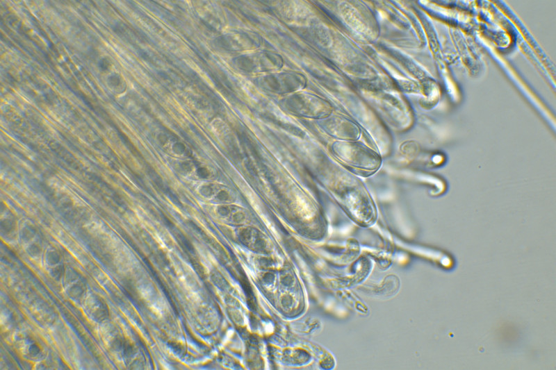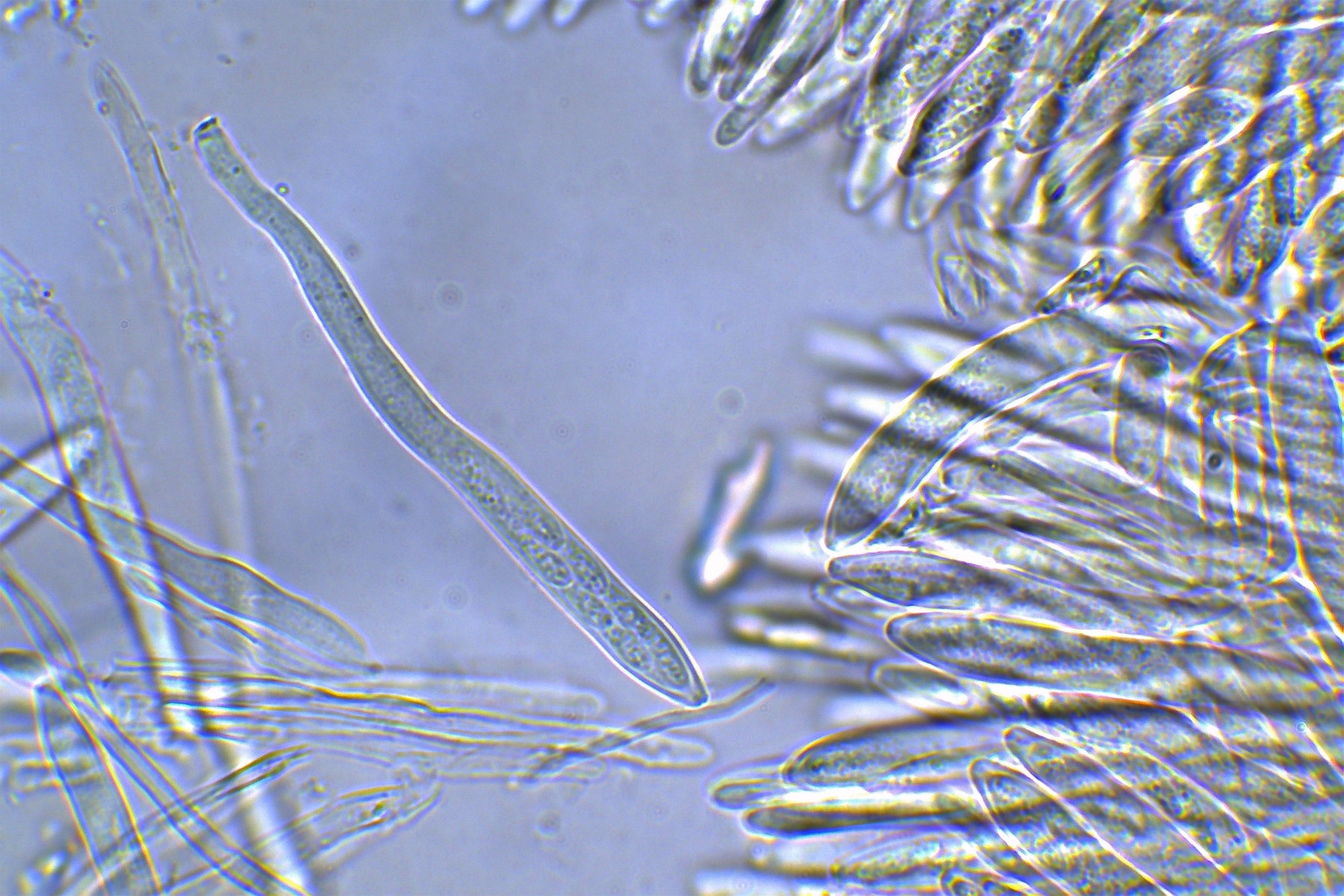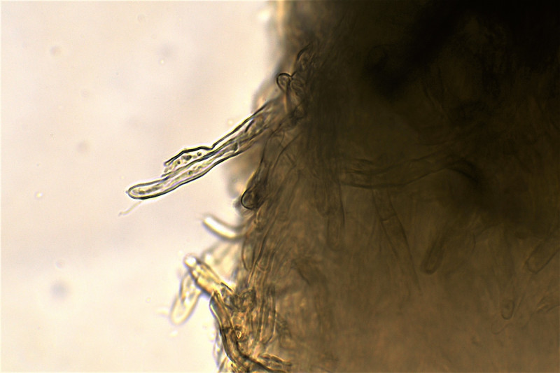 Da war ich mir nicht sicher ob es austretende Excipulum-Hyphen sind? Die hätte auf jeden Fall Helvella ephippium,