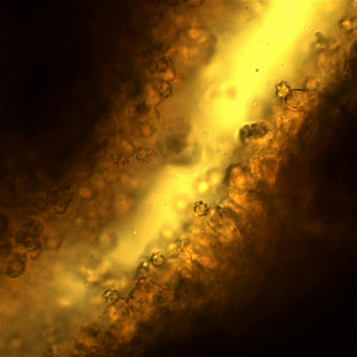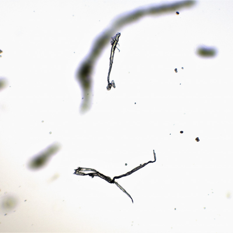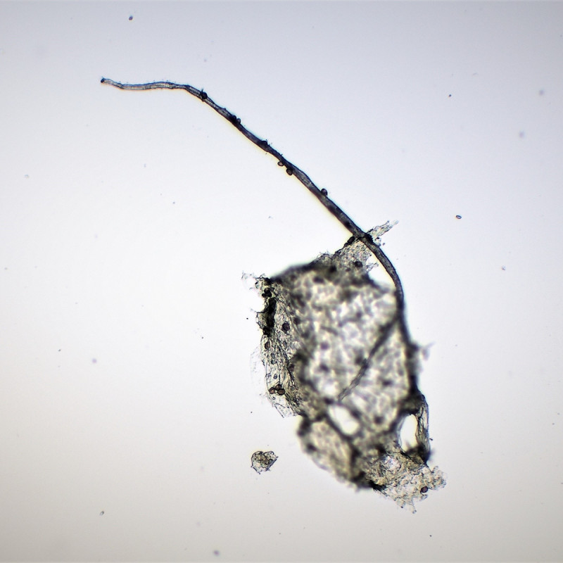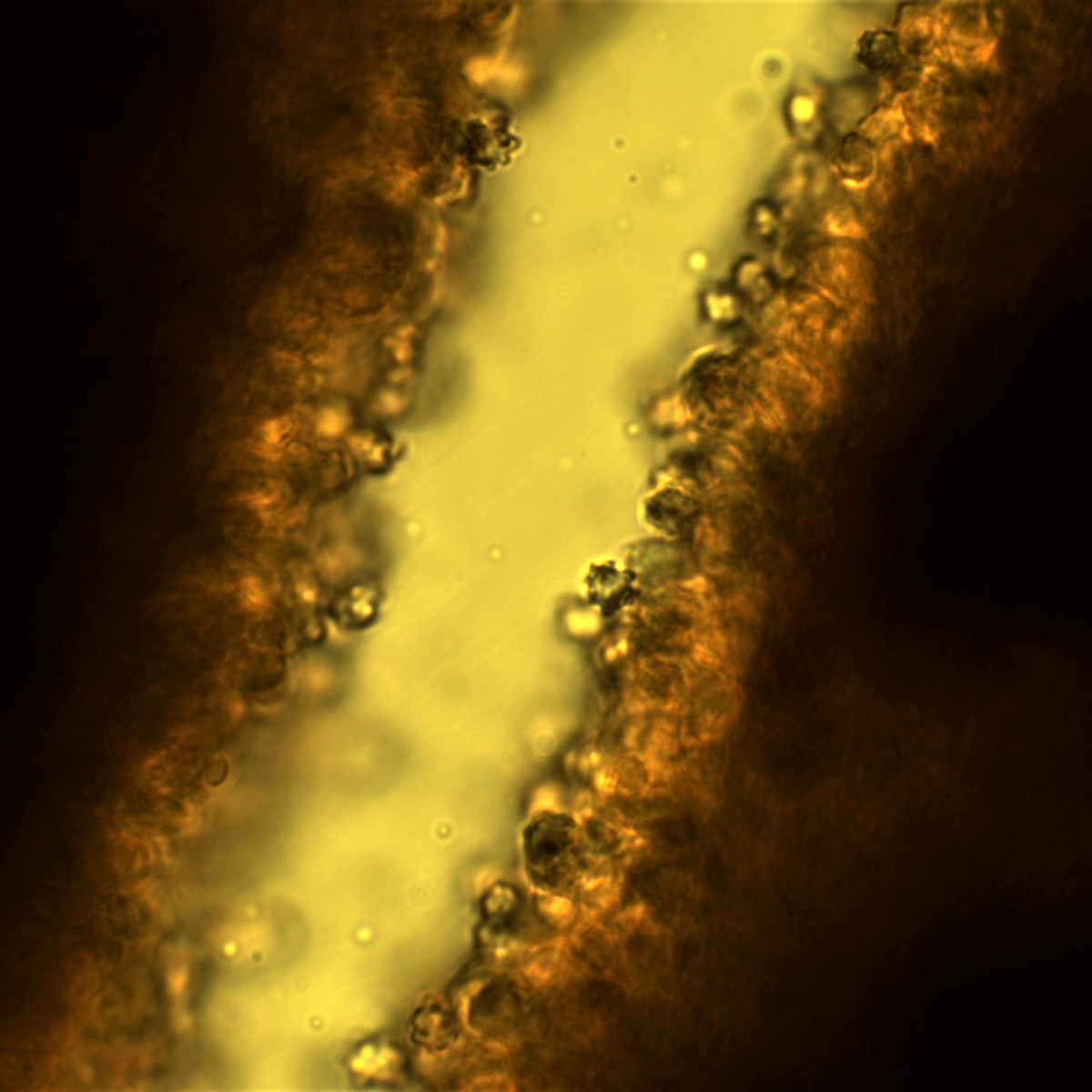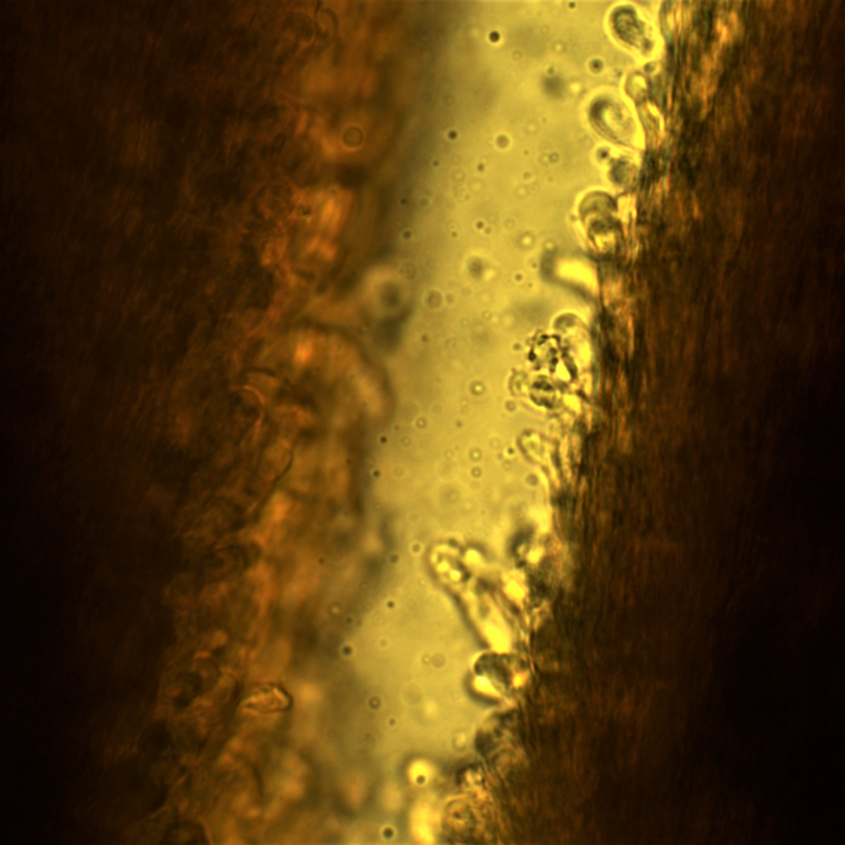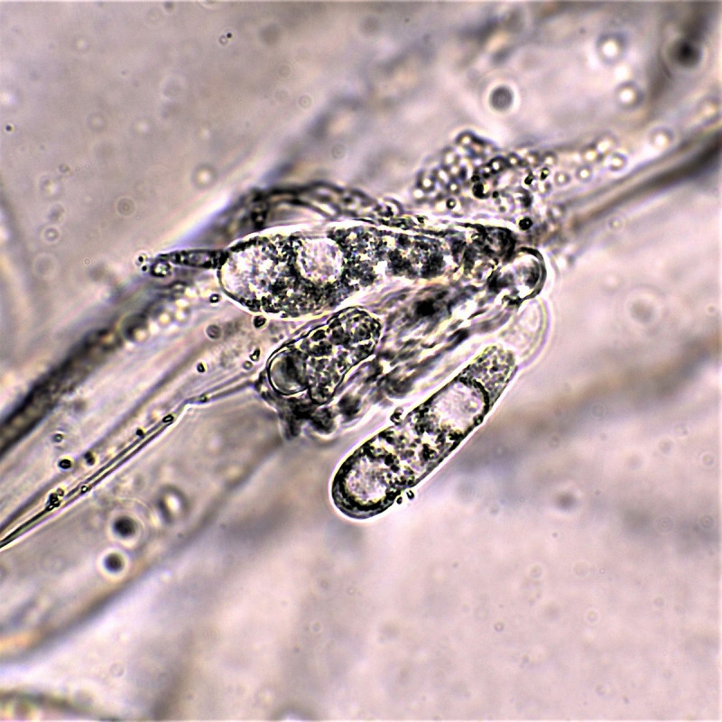 Da war ich mir nicht sicher ob es austretende Excipulum-Hyphen sind? Die hätte auf jeden Fall Helvella ephippium,