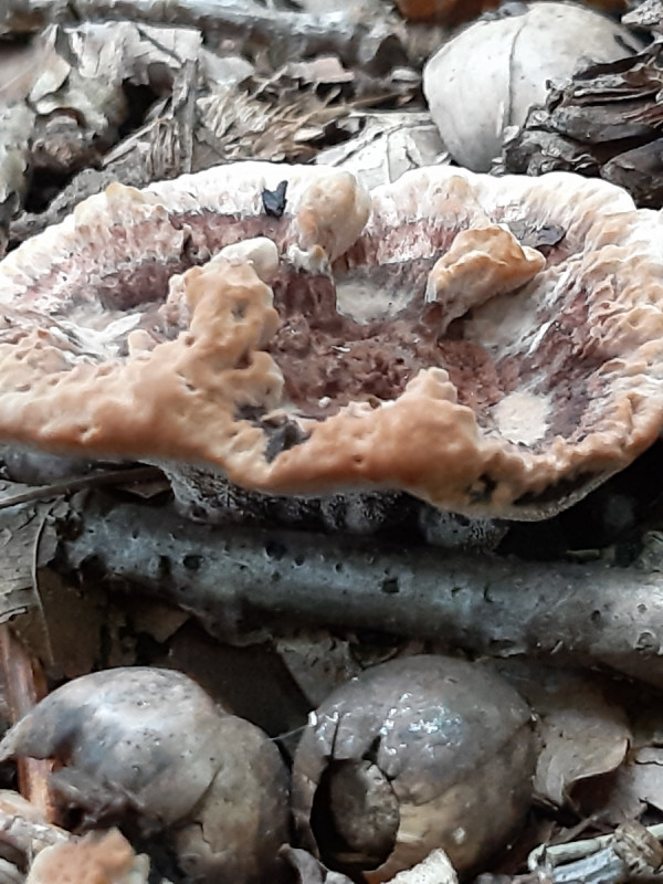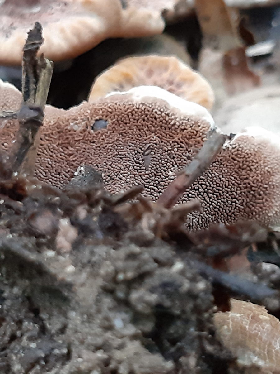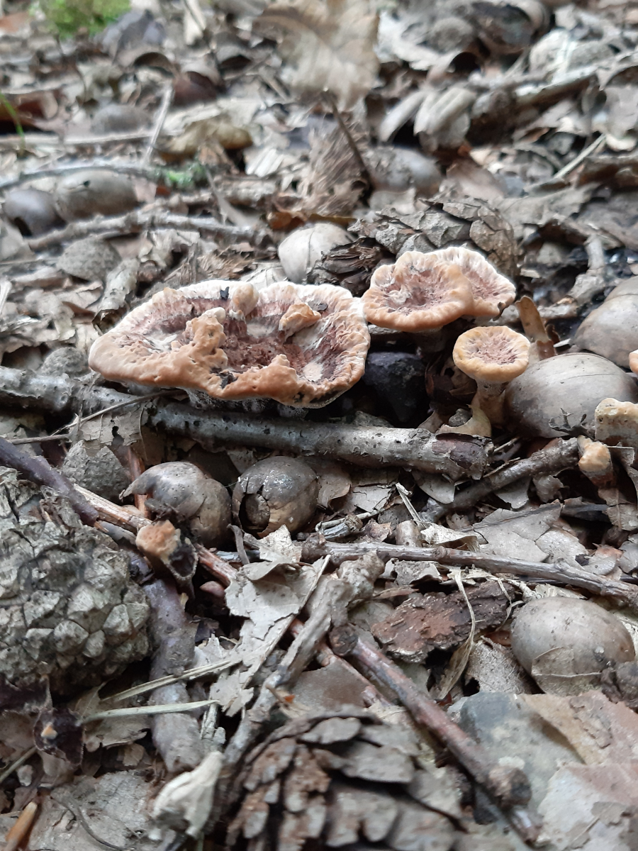 Ende Juli hatte ich am Wegesrand (eine Seite Eiche, Buche gegenüber 5 Meter Entfernung Kiefer) das erste mal diese kleinen Korkstachelinge gefunden. Der rotbraune, zonierte, unebene Hut hat einen Durchmesser von bis zu 3 cm und hat einen helleren abgesetzten Rand. Von oben sahen sie aus wie kleine, gleichmäßige Rosetten mit einer flachen, trichterförmigen Vertiefung in der Mitte. Die stachelige Fruchtschicht hatte einen bräunlichen Ton und lief an dem mittigen, kurzen Stiel herab.