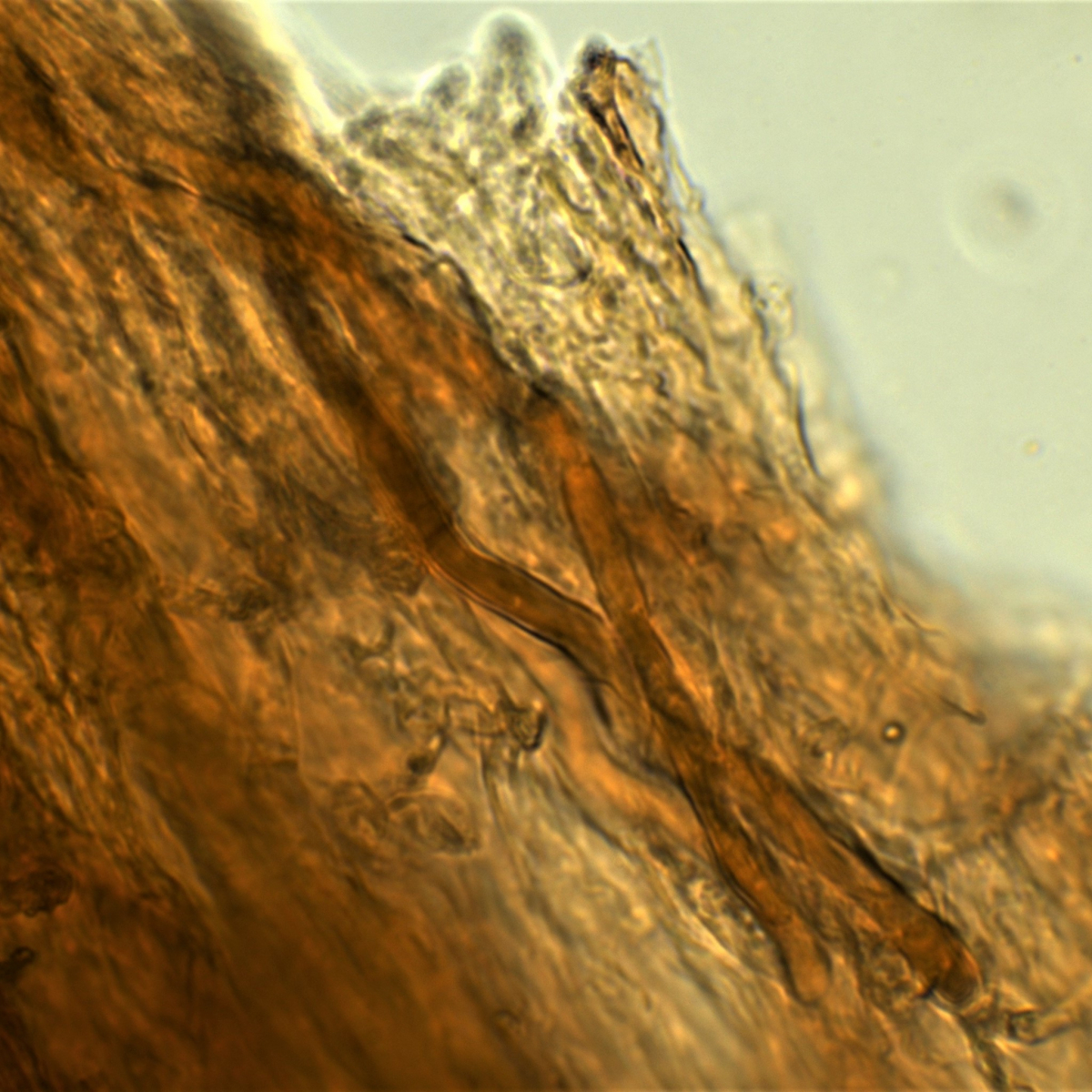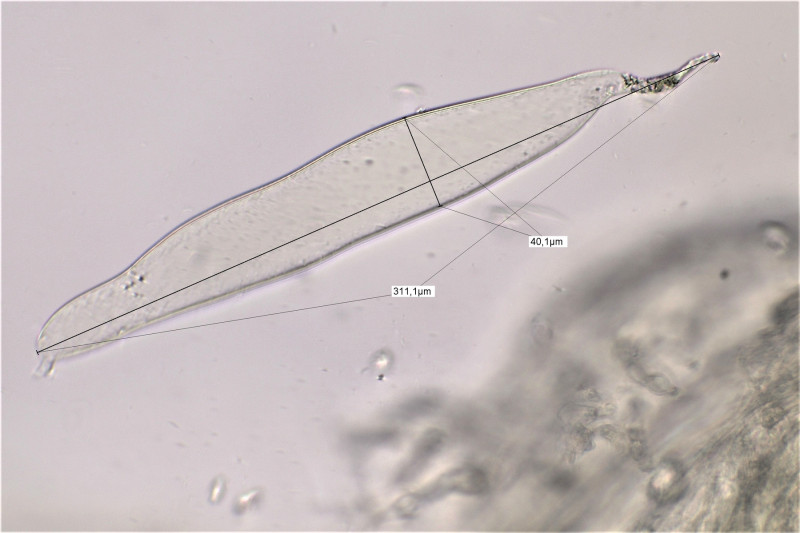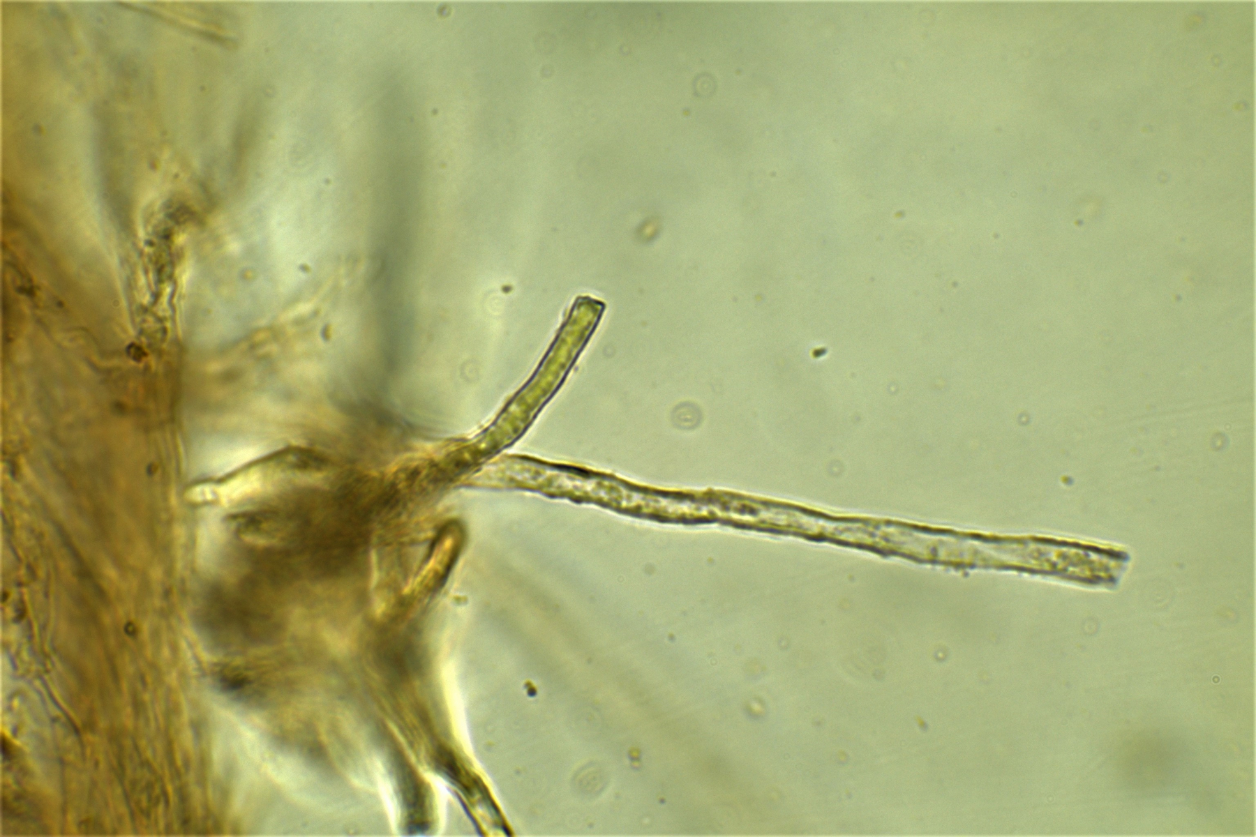 hyalin, schlank, septiert, Spitze kaum verdickt, innen schwärzlich, linienförmig-granuliert?