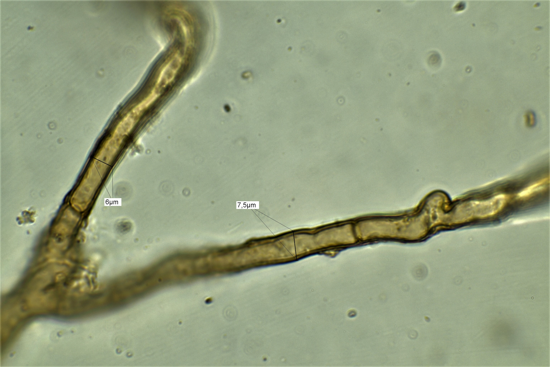 bräunliche, dickwandige Hyphen septiert, Aussehen ähnlich wie Baumstämme