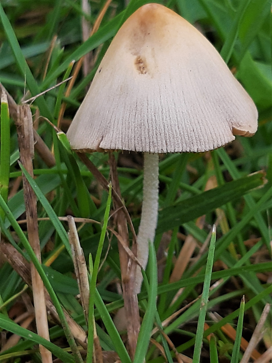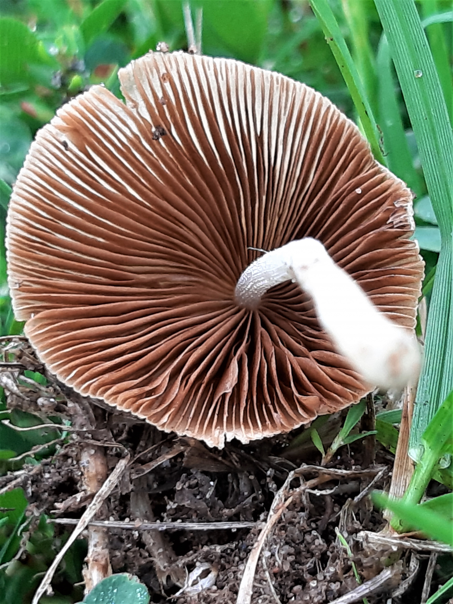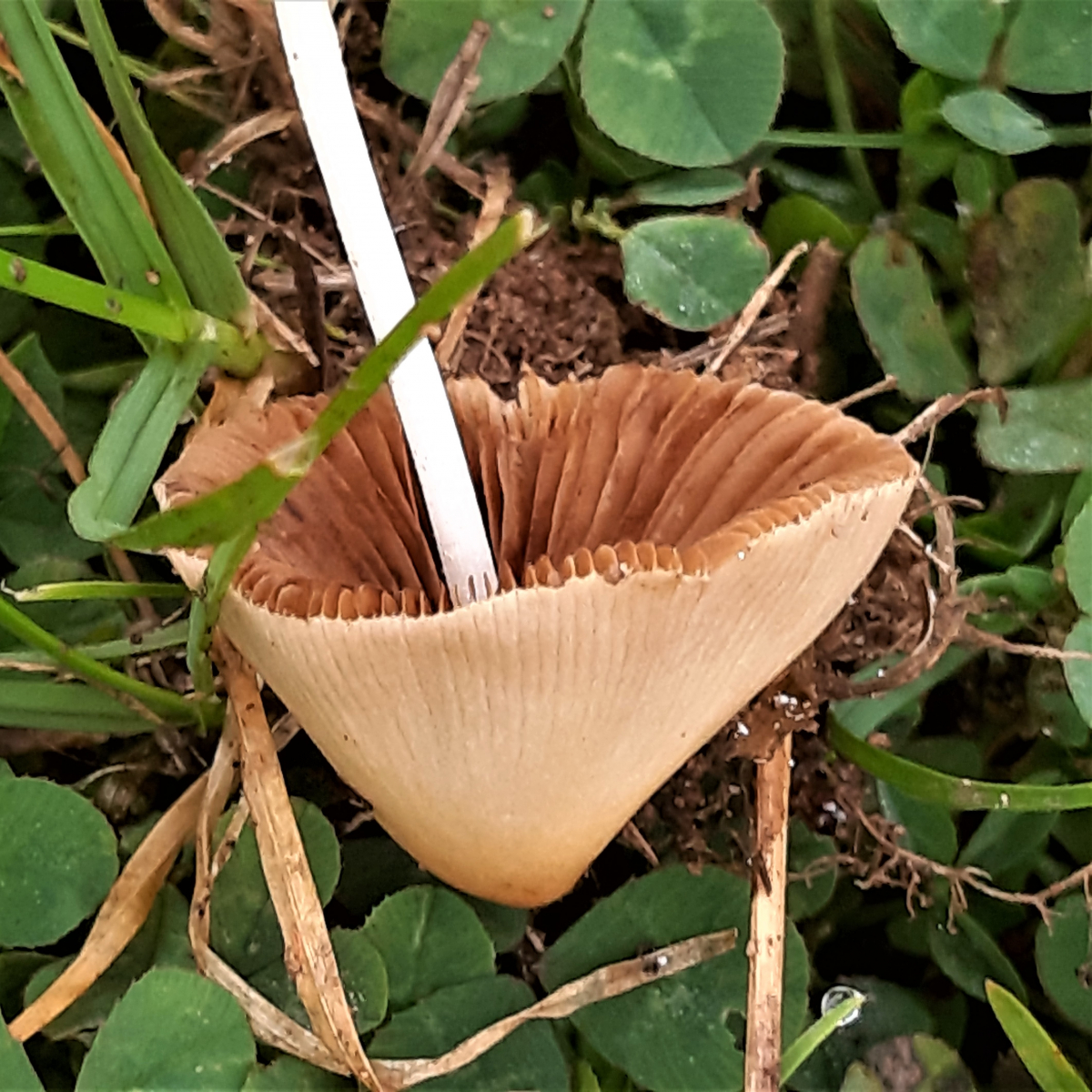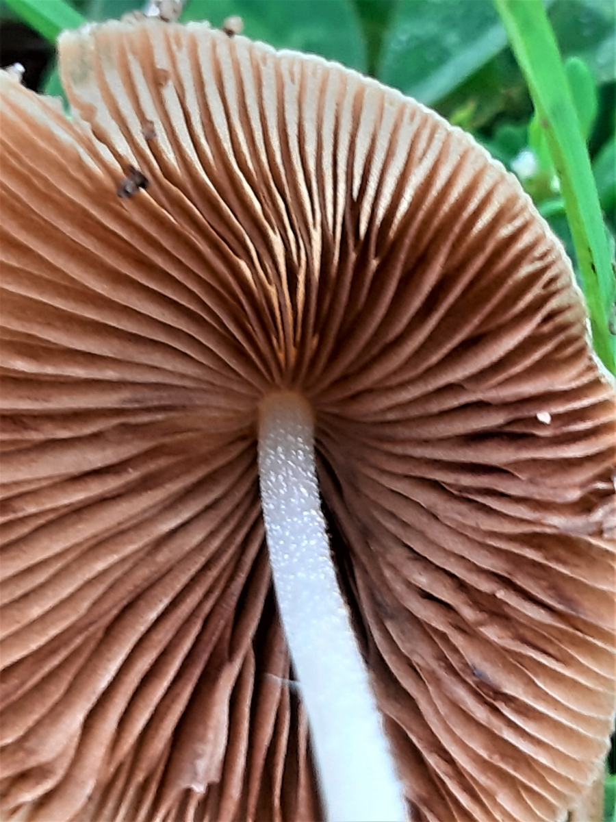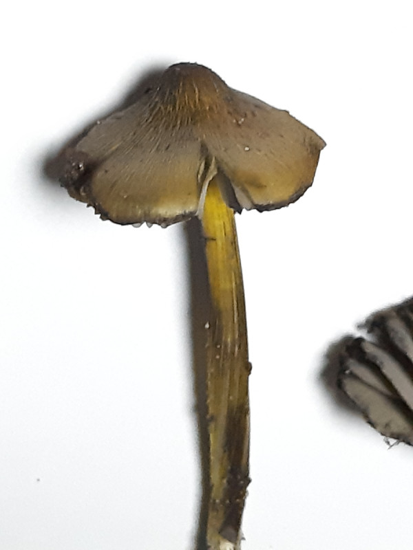 Der kegelige Hut hatte eine gelbliche Mitte von der aus eine deutliche Riefung bis zum scharfen Hutrand lief (Unterer Durchmesser 2 cm). Die Lamellen hatten einen warmen caramelfarbigen Ton, untermischt und sind zum Stiel angeheftet. Der dünne, hohle und schnell brüchige Stiel war leicht längsgerillt, bepudert und hatte eine kleine verdickte Basis.