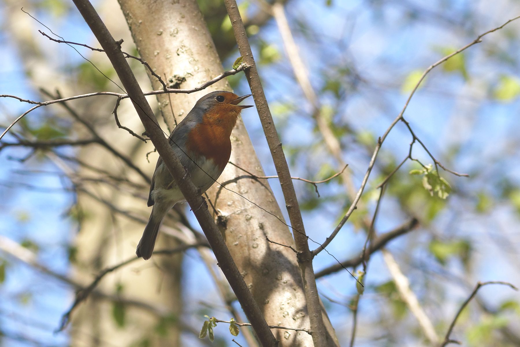 das Rotkehlchen ♂ (Erithacus rubecula) schmettert sein Liedchen aus voller Brust