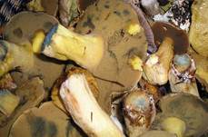 Selbst wenn ich Pilze mitnehme und daheim richtig untersuche (was dann aber ganz anders aussieht als hier), habe ich immer noch eine relativ hohe Quote von sicherlich 5% bis 10% an Funden, die unbestimmt bleiben. Manchmal liegt's einfach daran, daß eine morphologische Bestimmung grundsätzlich mit meinen Mitteln nicht möglich ist (wegen grundsätzlichen Forschungsrückständen) - manchmal aber auch daran, daß die Fruchtkörperkollektionen eines jeweiligen Fundes in einem nicht mehr bestimmbaren Zustand sind.Jedenfalls halte ich mich in solchen Fällen nicht lange damit auf, eine Bestimmung hinzubasteln, die mit einigermaßen hoher Wahrscheinlichkeit falsch ist. Ist halt so und ist auch nicht schlimm, Pilze sind eben kompliziert und Bestimmungen nicht immern möglich. Im Zweifel - und vor allem wenn das Beobachtungsmaterial unzureichend ist wie hier - einfach zurück in den Wald mit dem Material und neue, bessere Pilze gesucht. Beim nächsten Versuch mit kompletteren Fruchtkörpern klappt's besser.