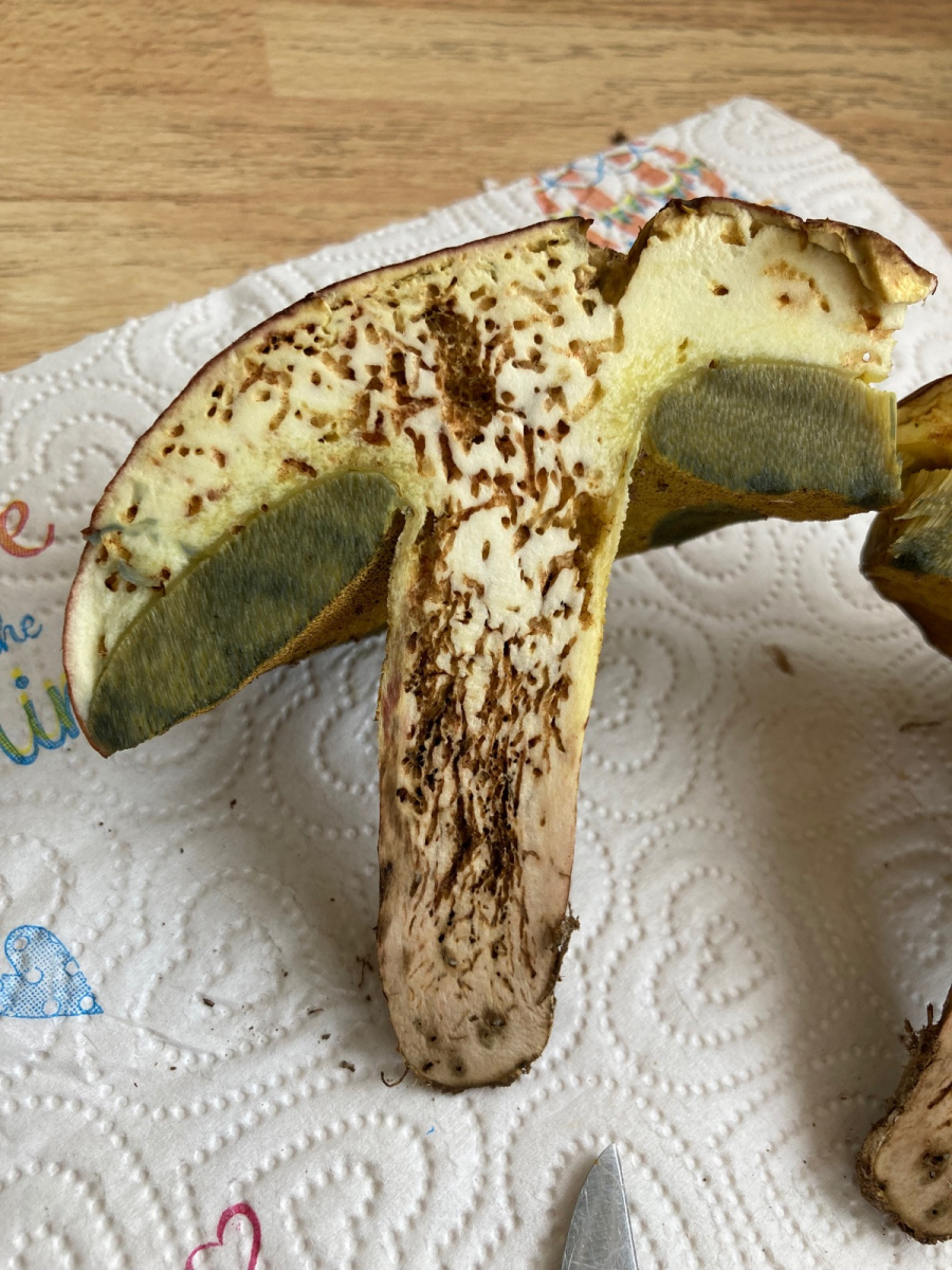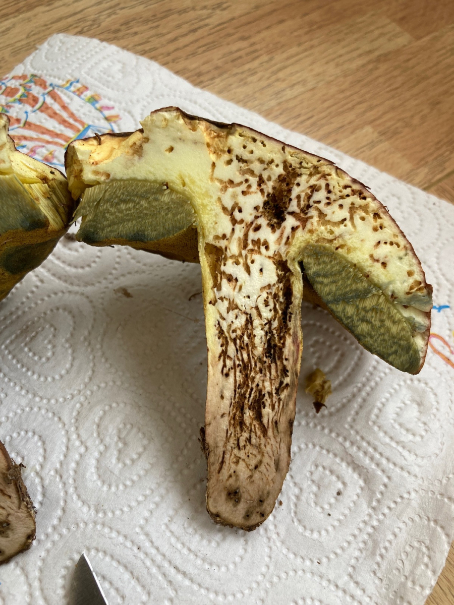 Einige Minuten nach dem Querschnitt zeigt auch das Hutfleisch eine leichte Blaufärbung.