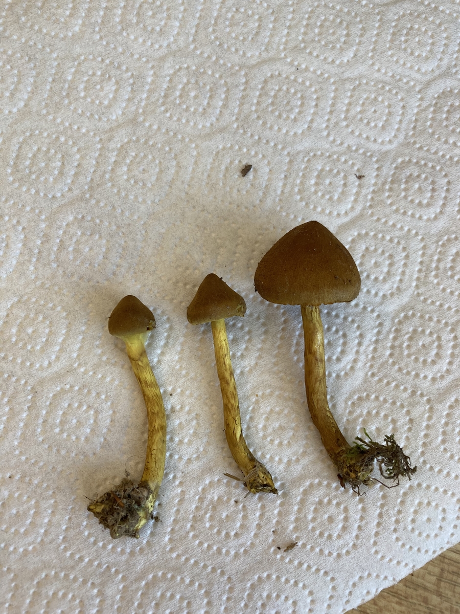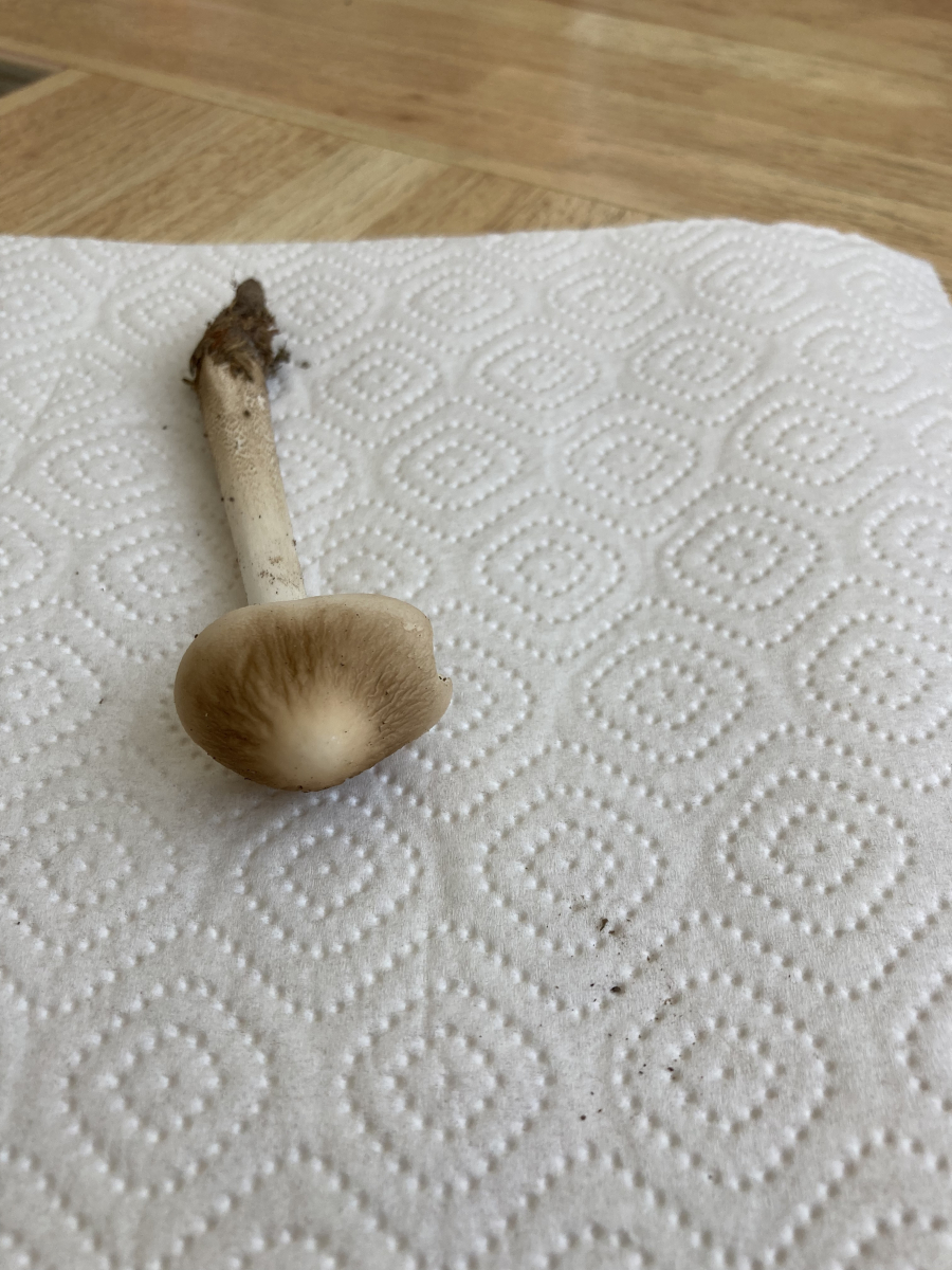 Der Hut ist auffallend spitzkegelig, braun( in der Mitte minimal dunkler)