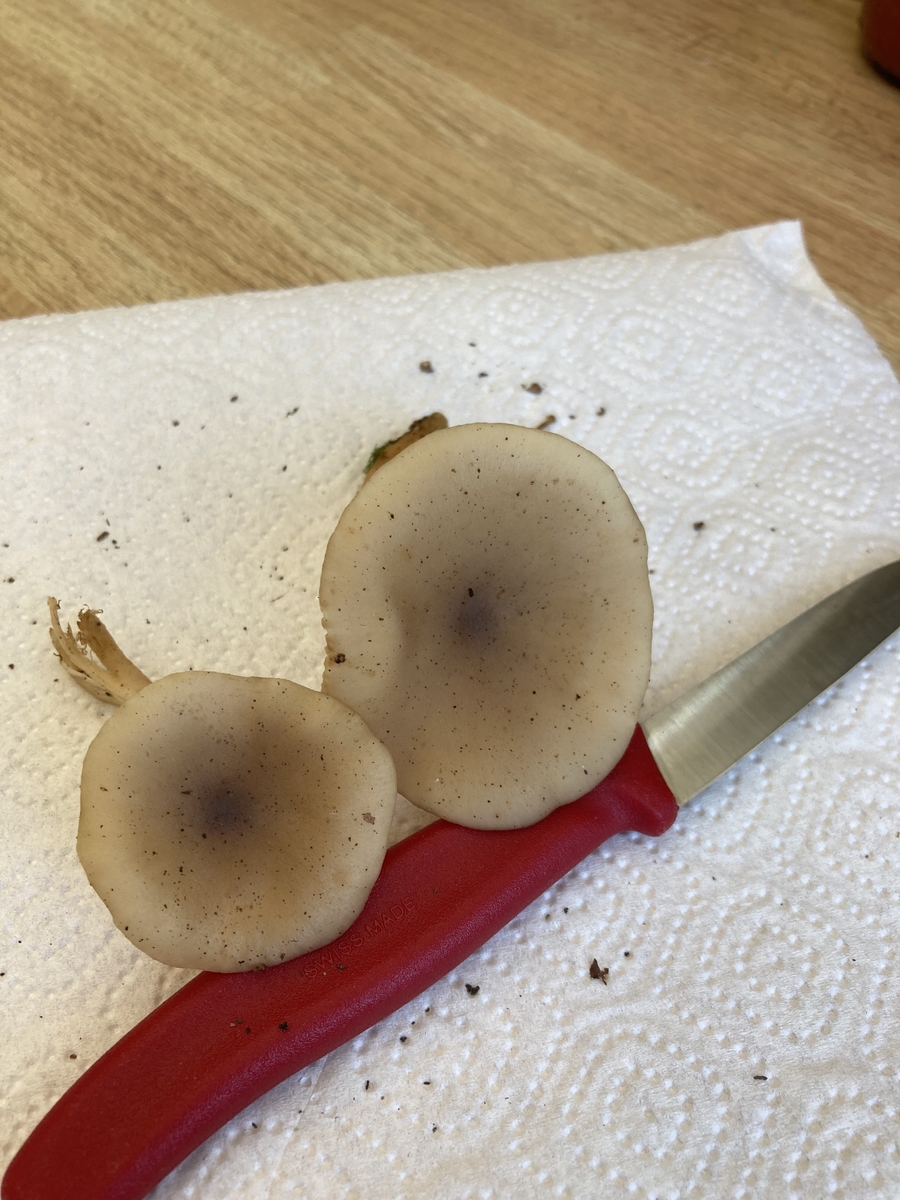 Das Fleisch ist deutlich schwefelgelb und die Pilze riechen stark nach Rettich.