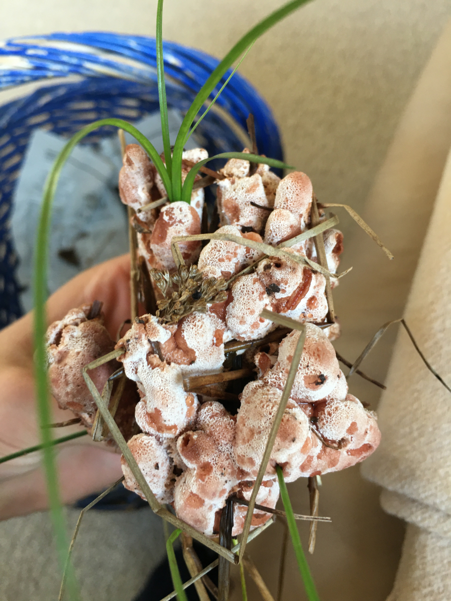 Diesen Pilz habe ich in einem Laub Mischwald bzw Buchenwald gefunden, er wuchst direkt neben einem Baumstumpf (nicht direkt dran) eventuell auch an einer Wurzel. Er riecht Pilzig, hat Grüpchen aus denen Saft herauskam, er läuft unten am Stamm zusammen und oben auseinander. Er ist vergleichsweise schwer und hart.