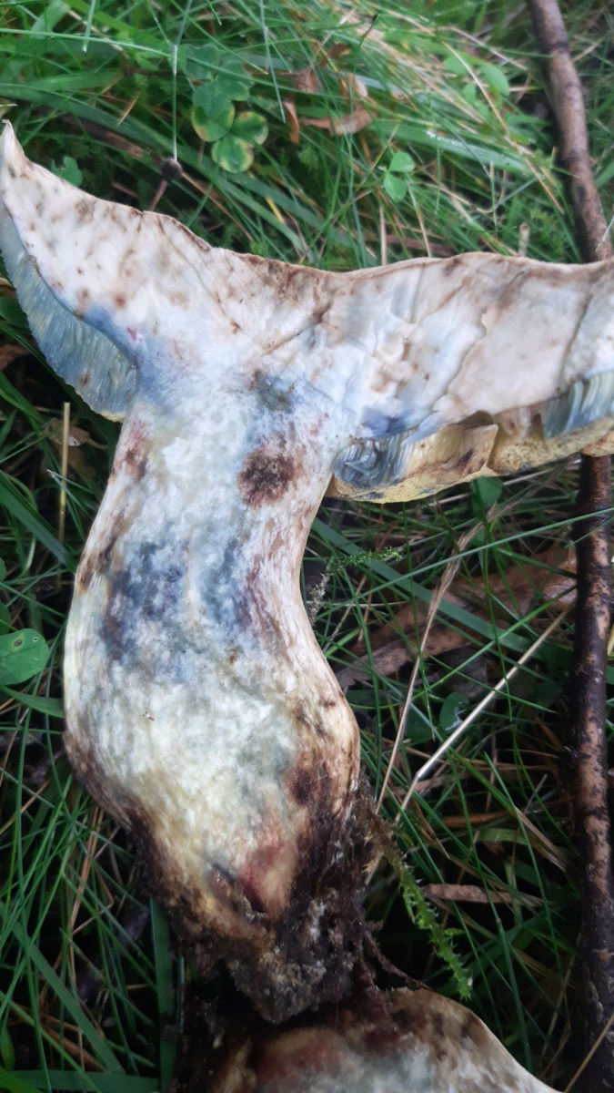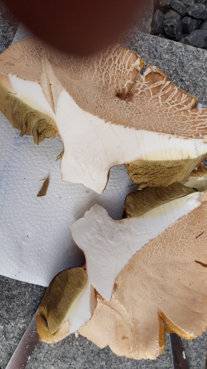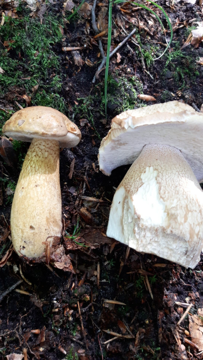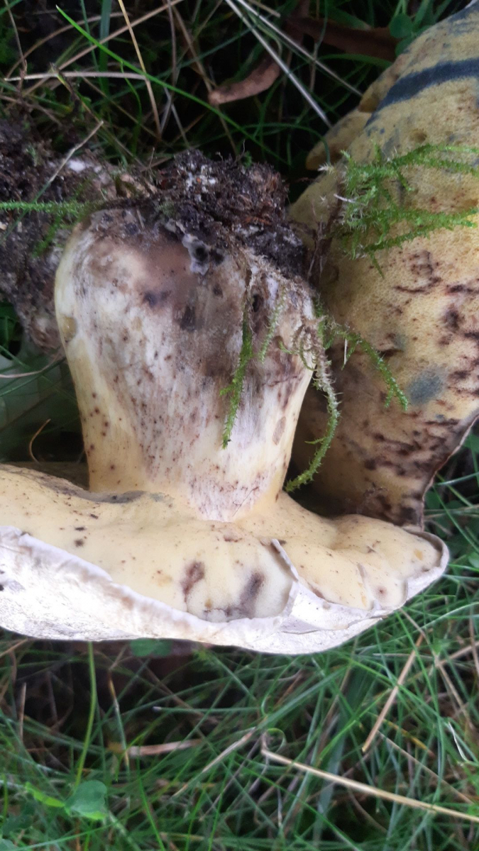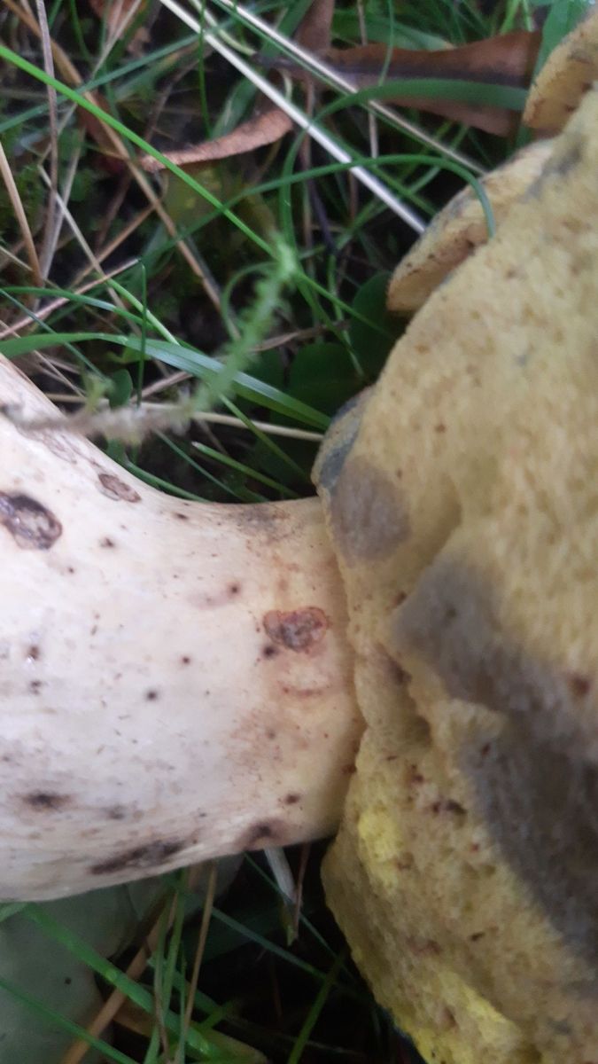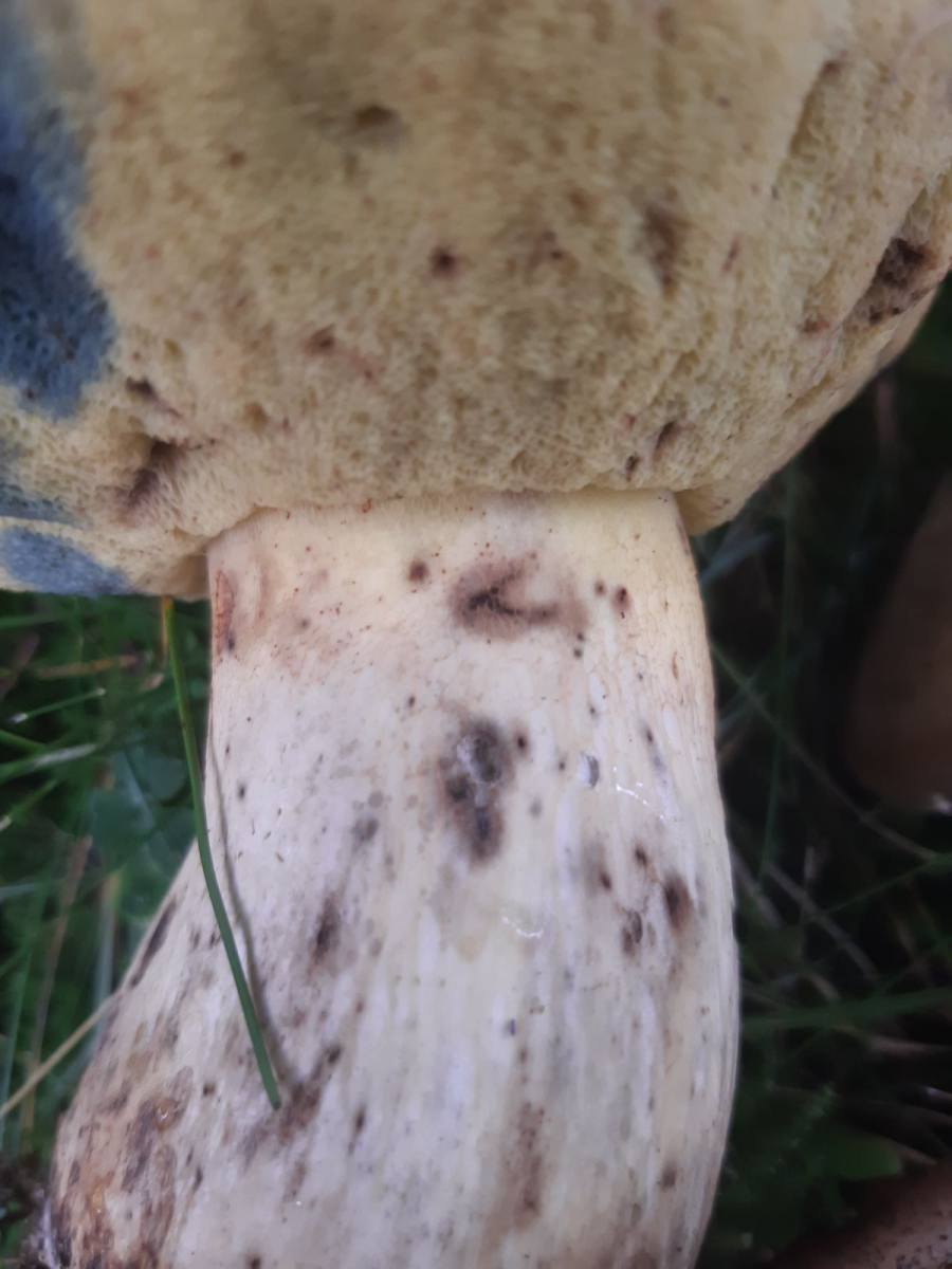 Unter Eichen gefunden (Moos und Gras, Boden eher sandig). Kalkweißer Hut eher glatt nicht lederartig, Stiel gelb oben Netz gelb. Röhren gelb (richtig gelb kommt im Foto nicht so rüber) und bei Druck bläuend. Im Anschnitt bläuend. Riecht angenehm pilzig, kein bitterer Geschmack. Stiel nicht gekammert.