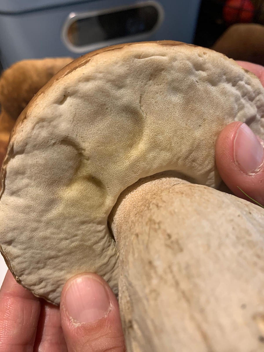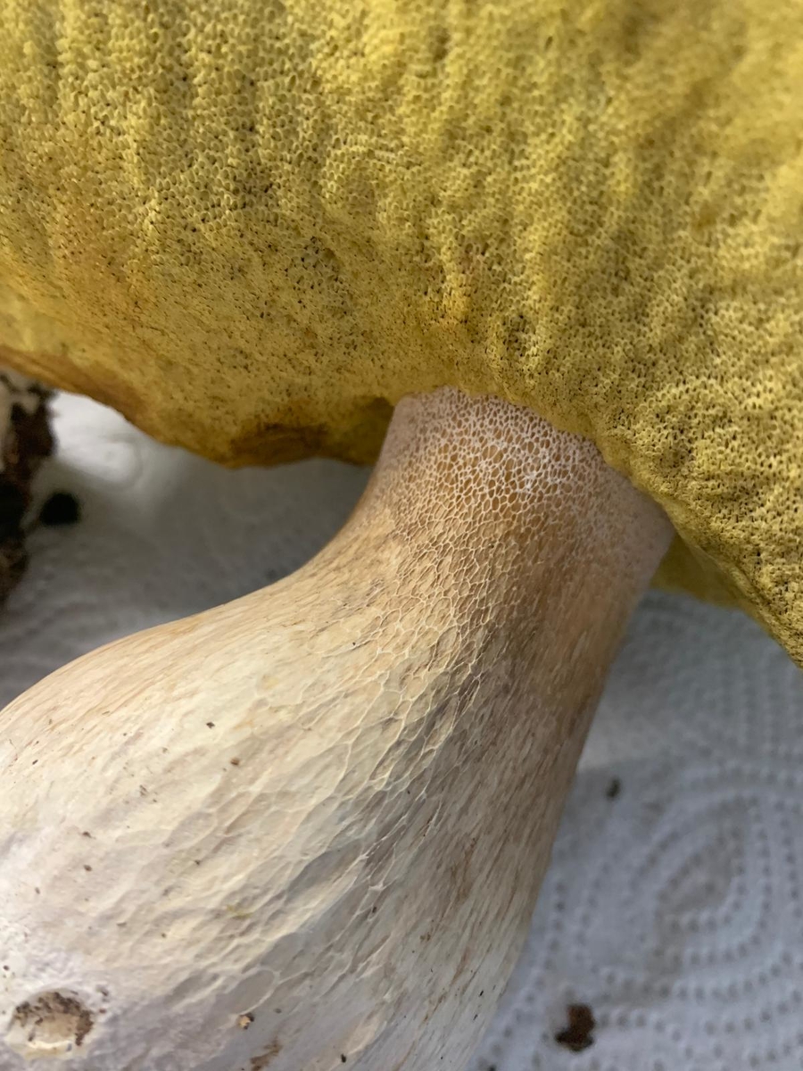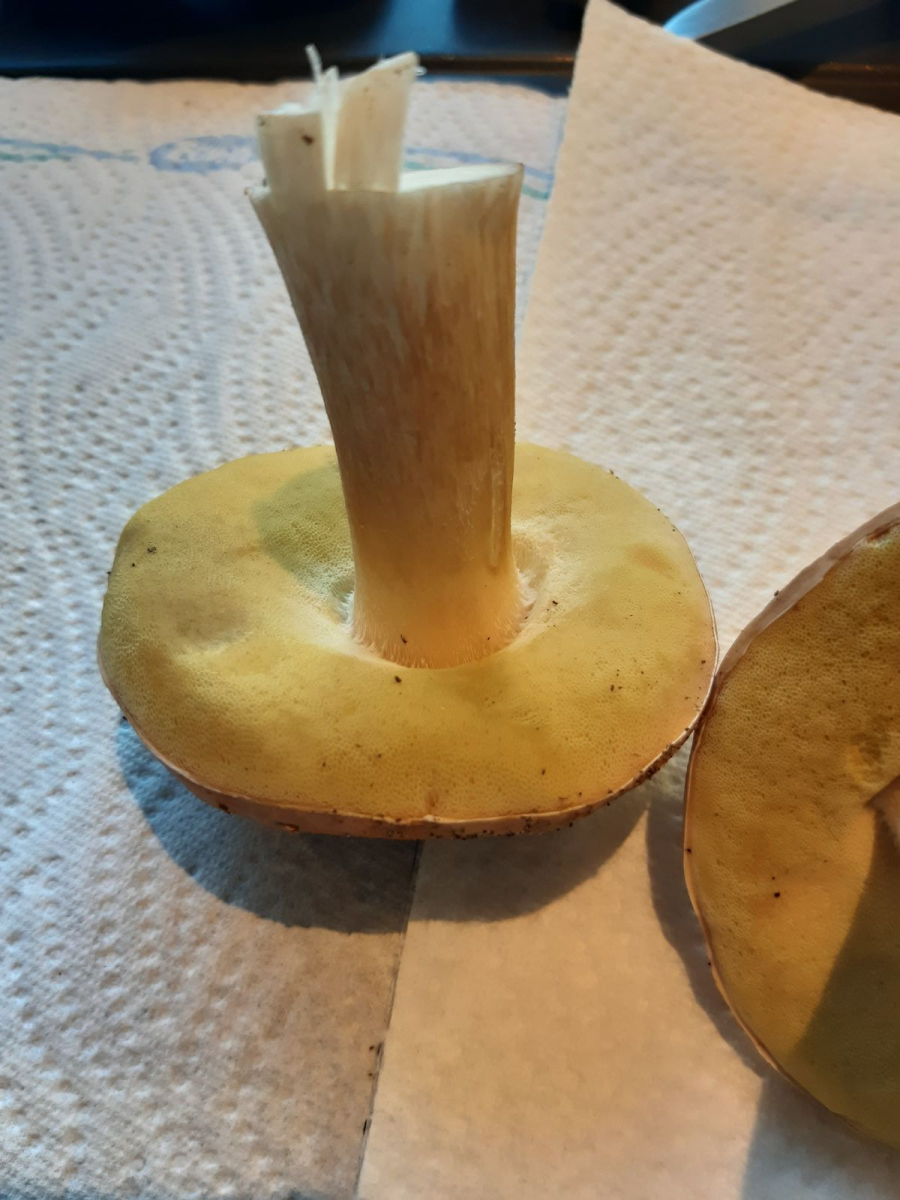 Weißes Netz schwach zu erkennen. Schwamm gelb/grünlich (kein rosa bei Druck). Gefunden im Mischwald.