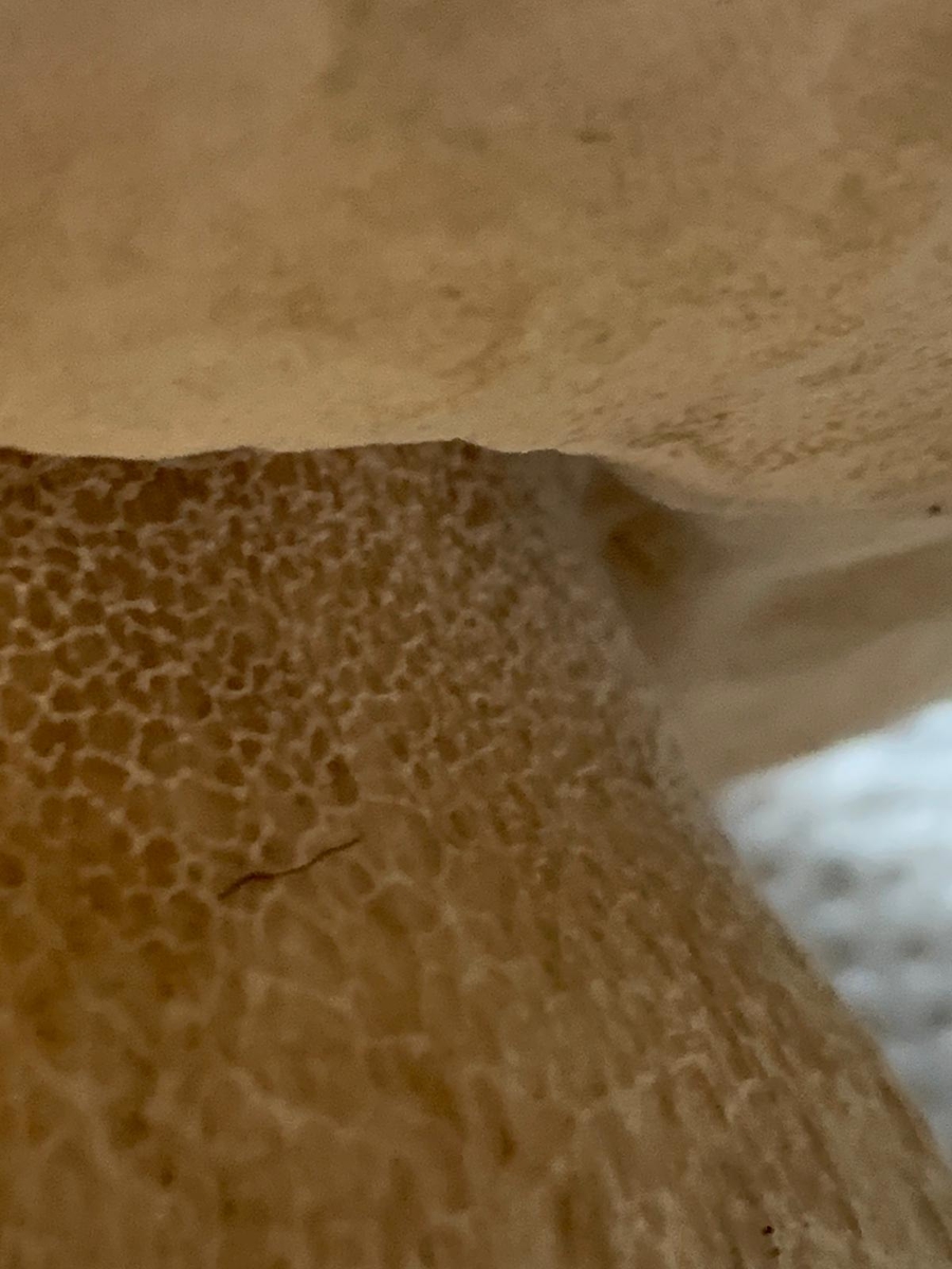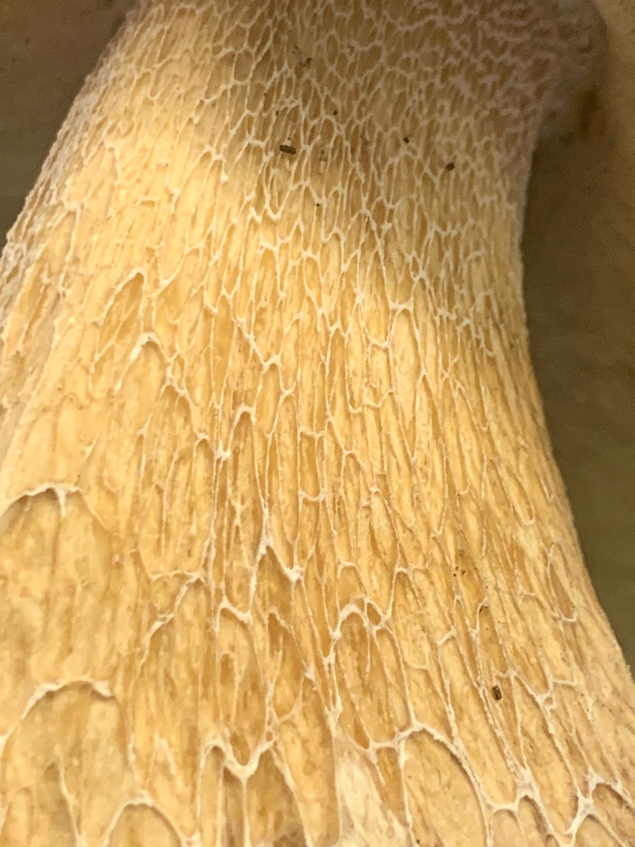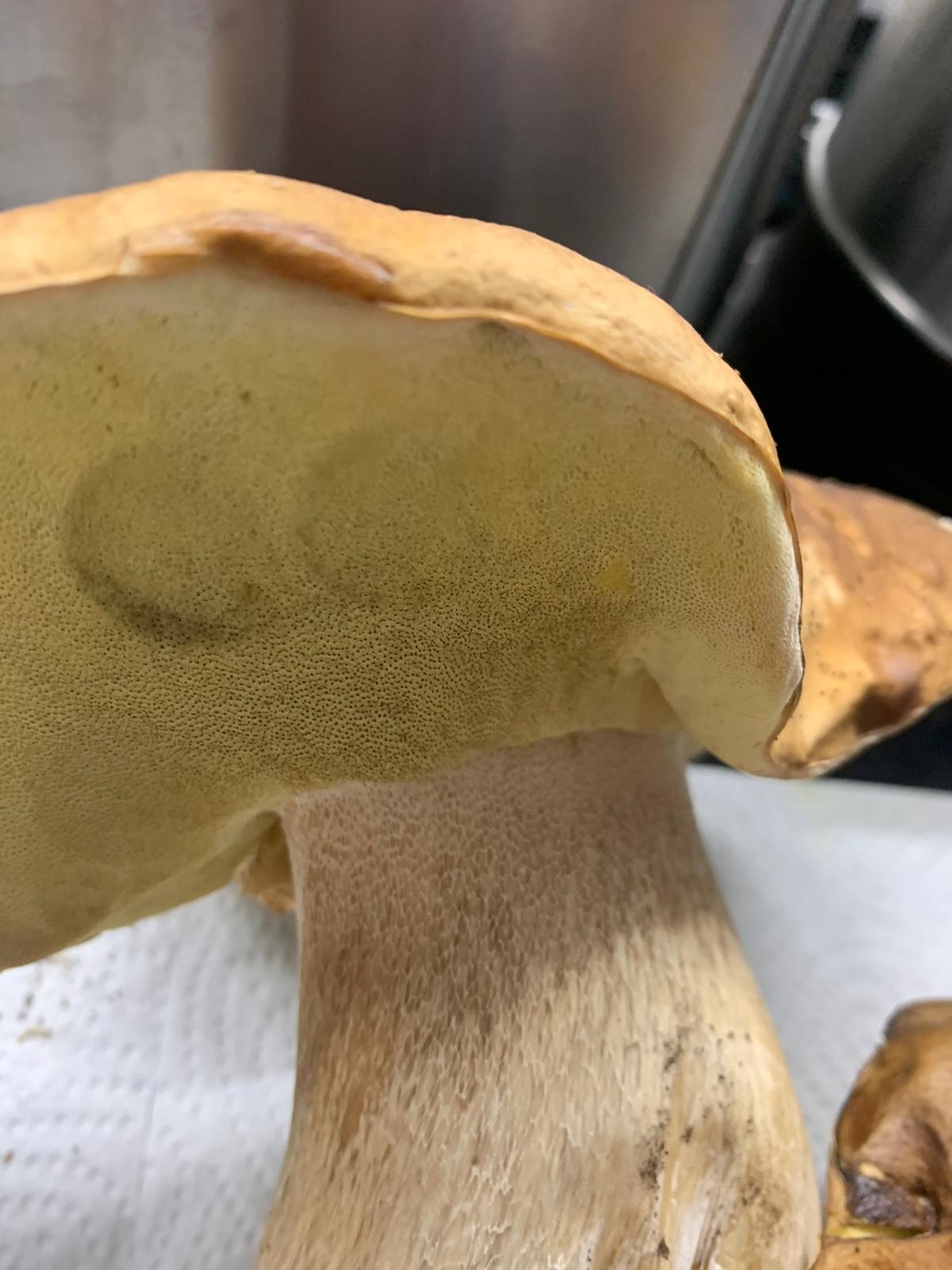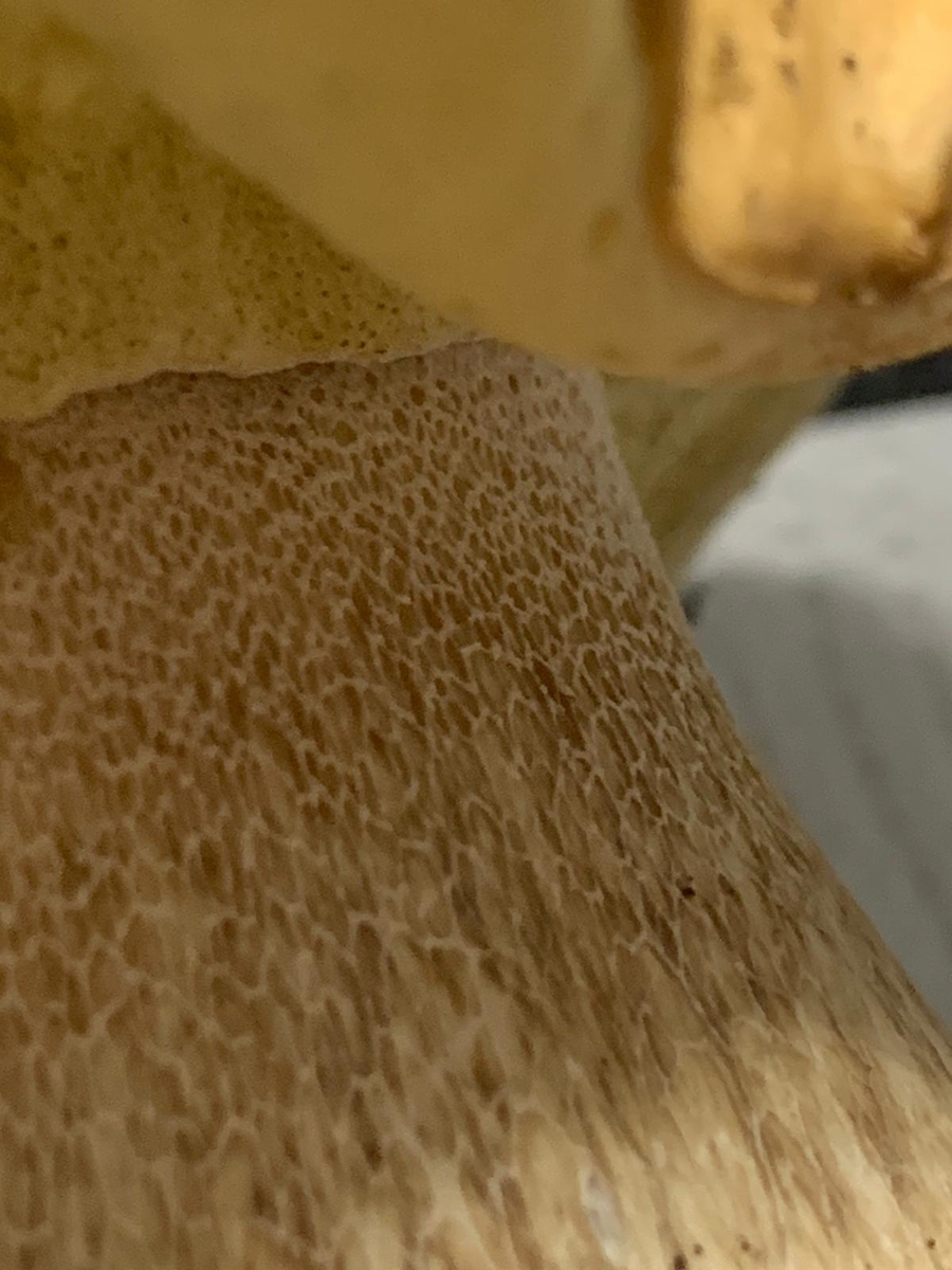 Weißes Netz schwach zu erkennen. Schwamm gelb/grünlich (kein rosa bei Druck). Gefunden im Mischwald.