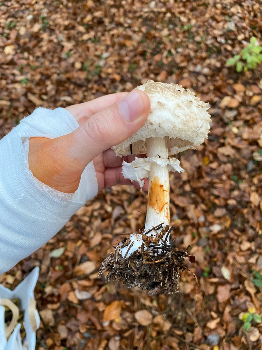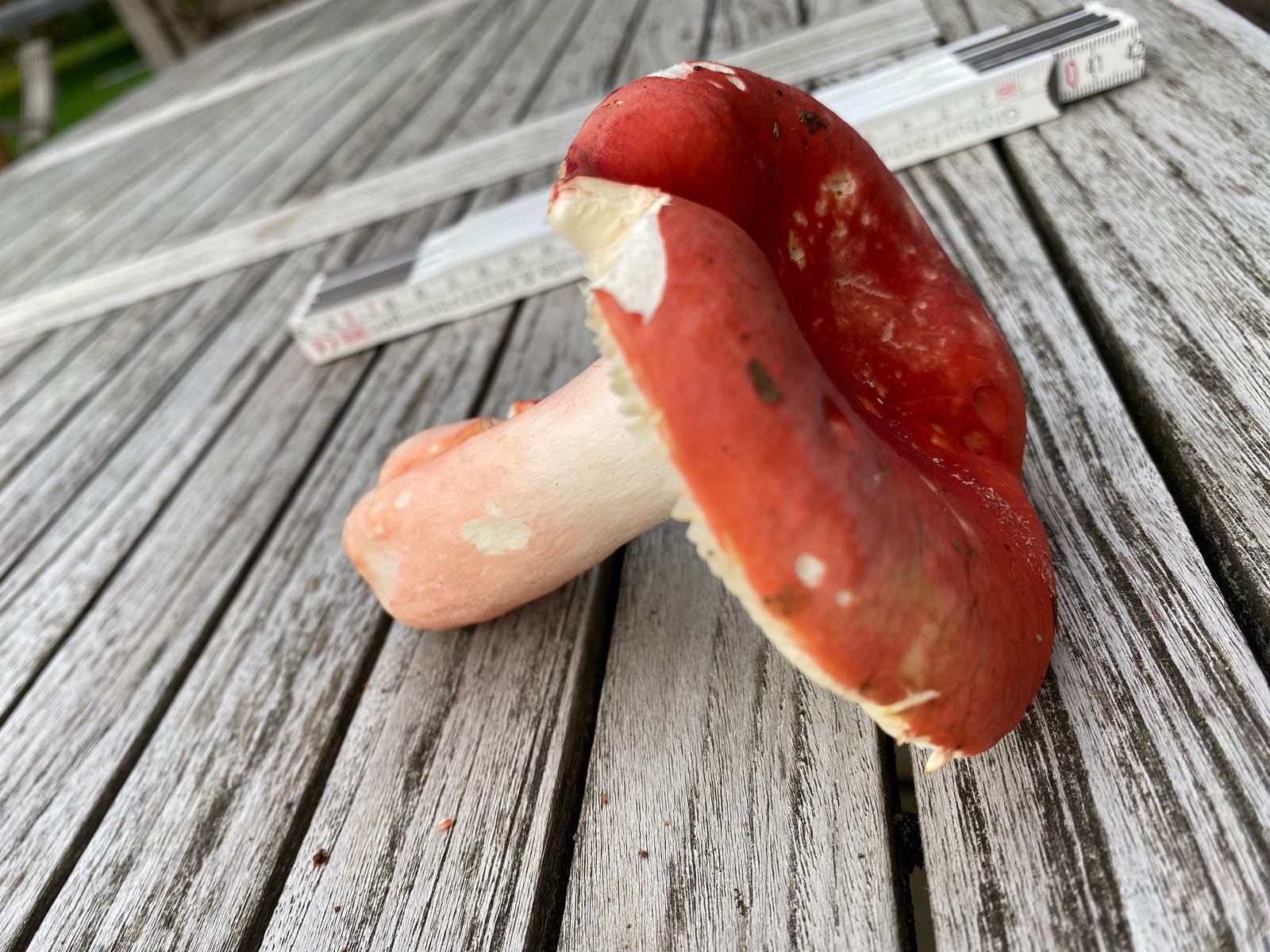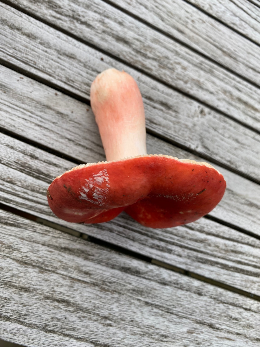 1) meines Erachtens der harte Zinnobertäubling. Sehr harter Hut & Stiel. Letzterer rosa überhaucht. Hutdurchmesser 10cm. Weiß-Creme-Farbene leicht brechende Lamellen. Geschmacksprobe angenehm. Geruch unauffällig. Bröckeliger Stiel (klar) —> Abendessen!