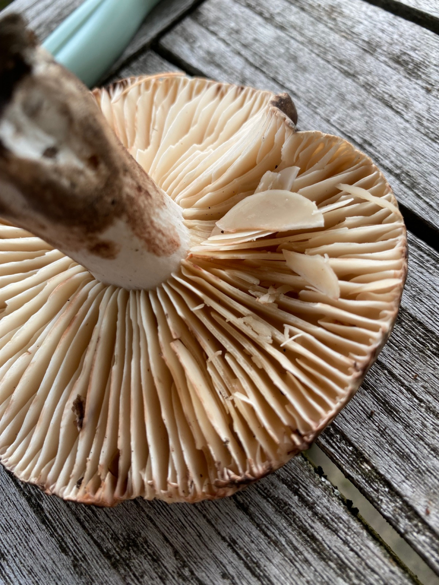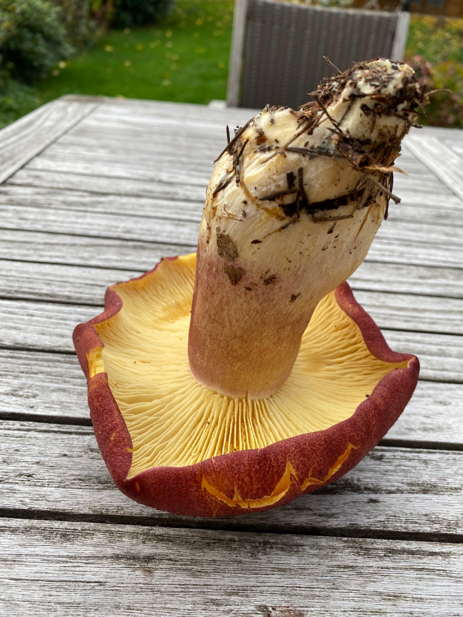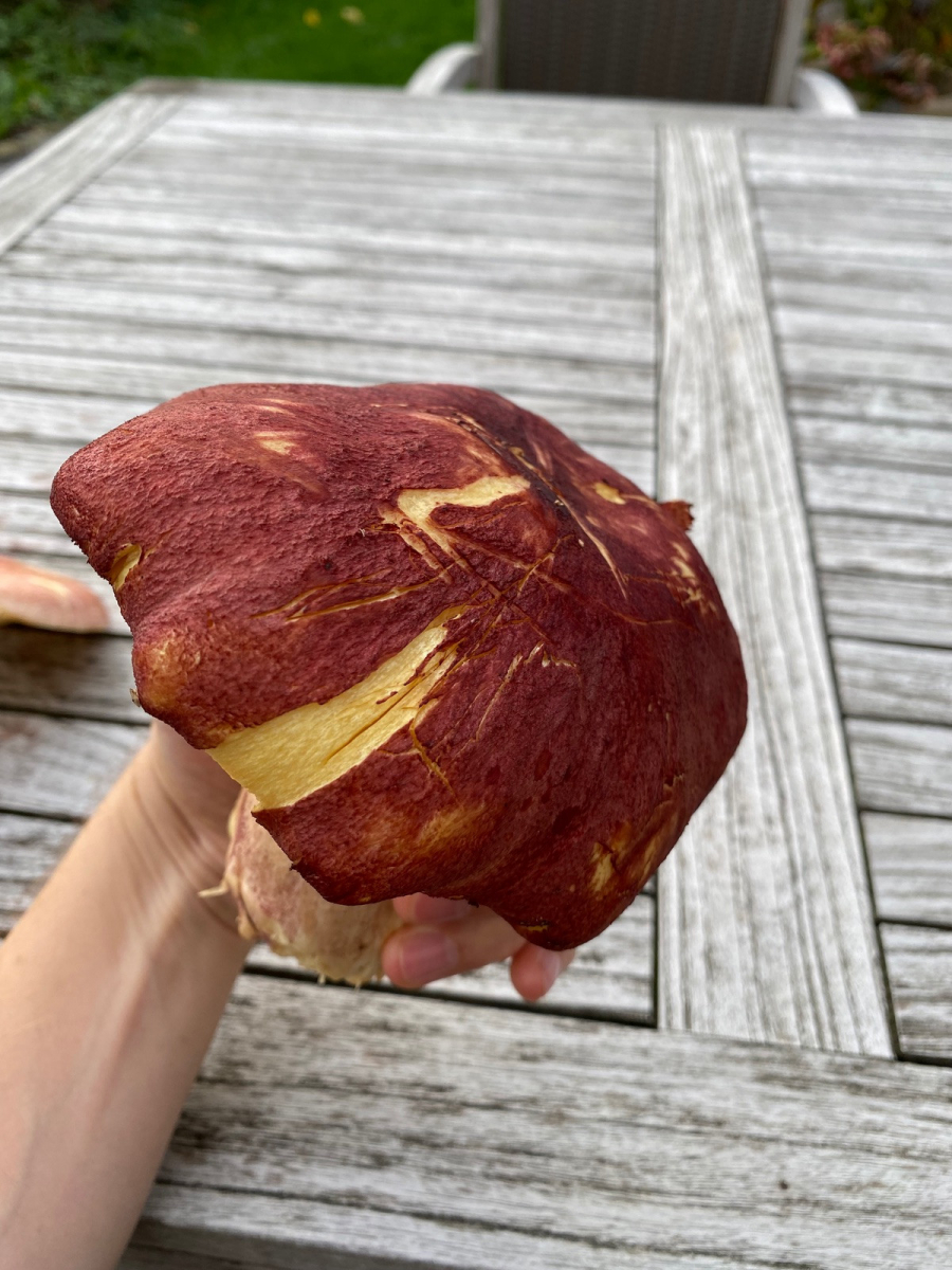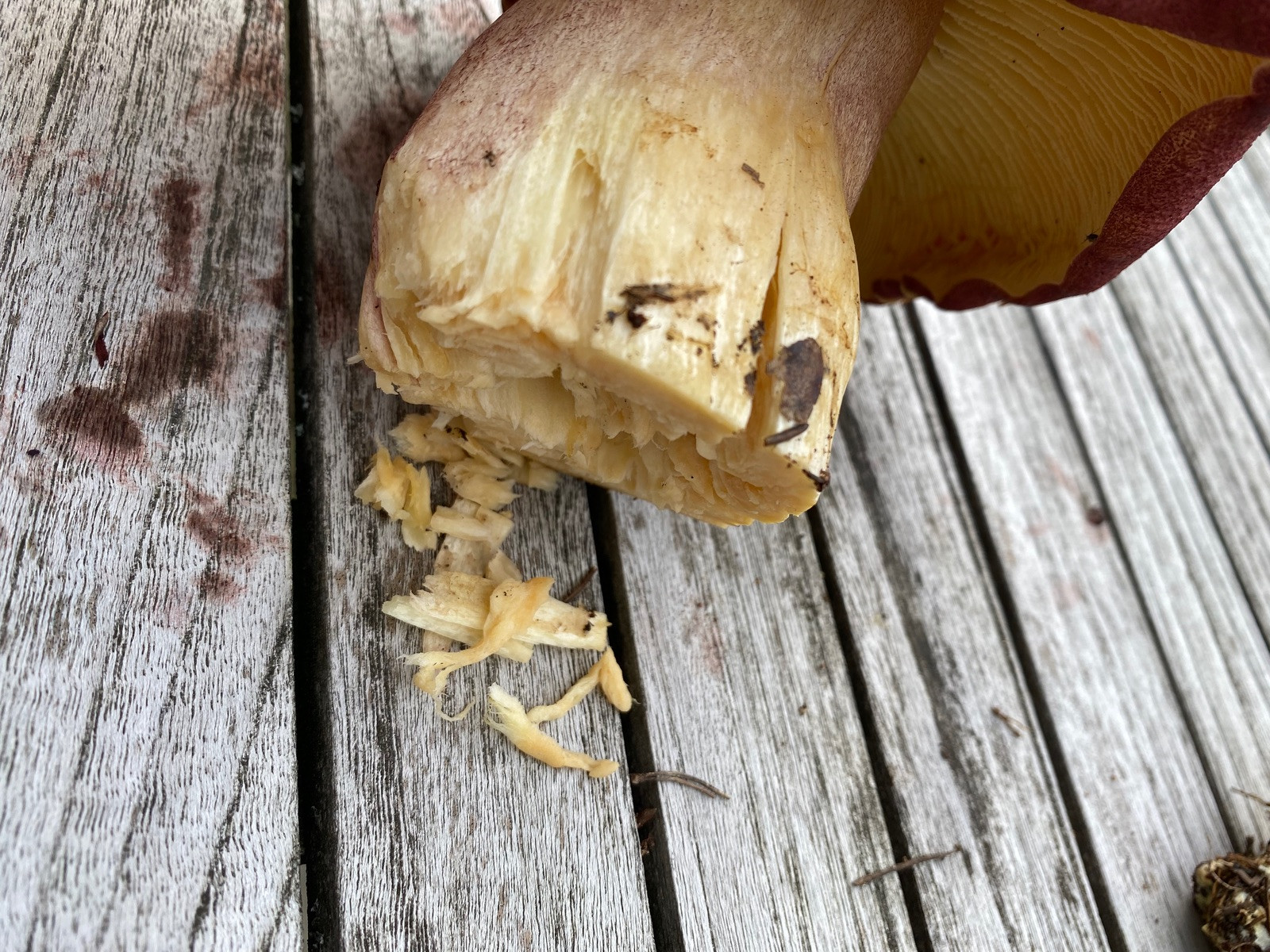 2) evtl. Rotstieliger Ledertäubling? Harter Hut. Stiel ist mürbe (wegen Alter?), leicht fasrig, hauptsächlich bröcklig (siehe Bild). Hutdurchmesser 16,5cm. Stiel hellgelb und lila überhaucht. Lamellen leicht brechend in hellgelber Farbe analog zum Stiel. Geschmacksprobe angenehm. Geruch süßlich angenehm.